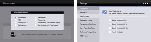 • 可选电极常数,以匹配连接的电导电极并调用各传感器的校准数据。