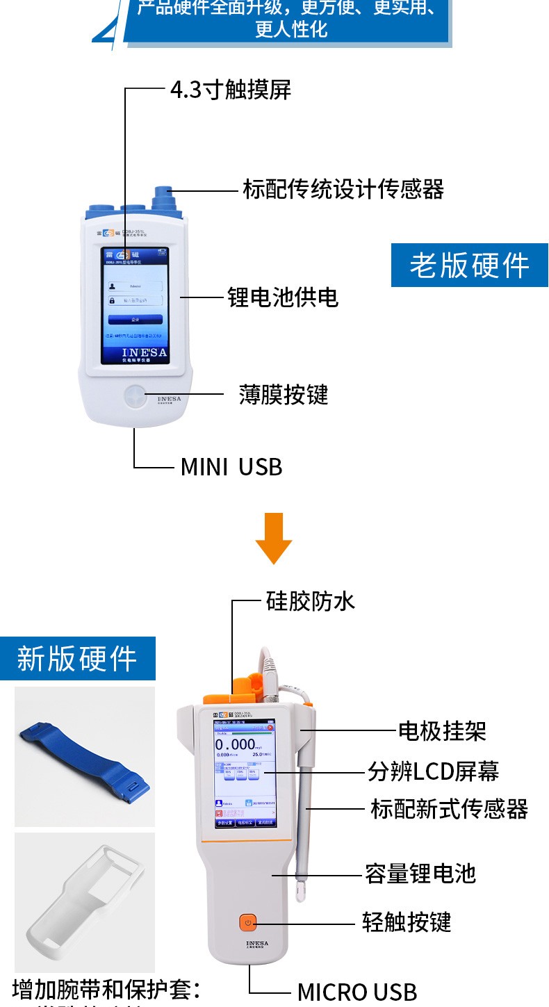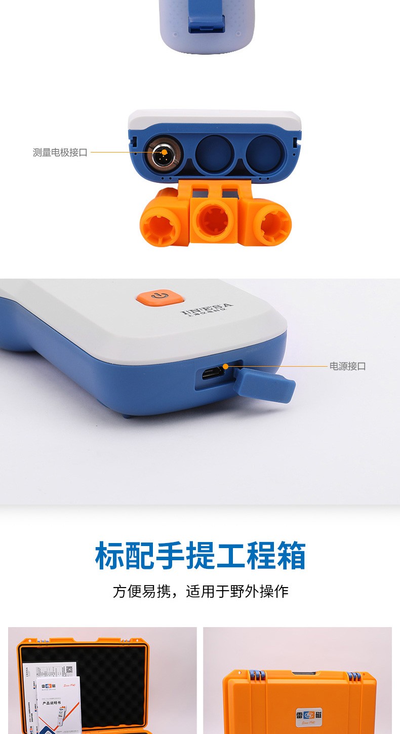 ● 标配复合电导电极、电极挂架、硅胶保护套、腕带、便携式手提箱、校准溶液