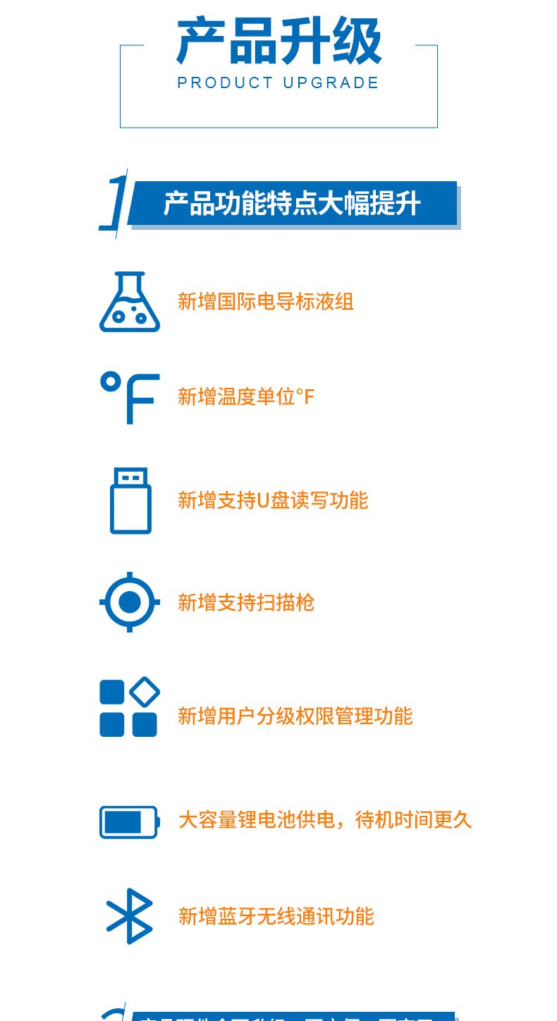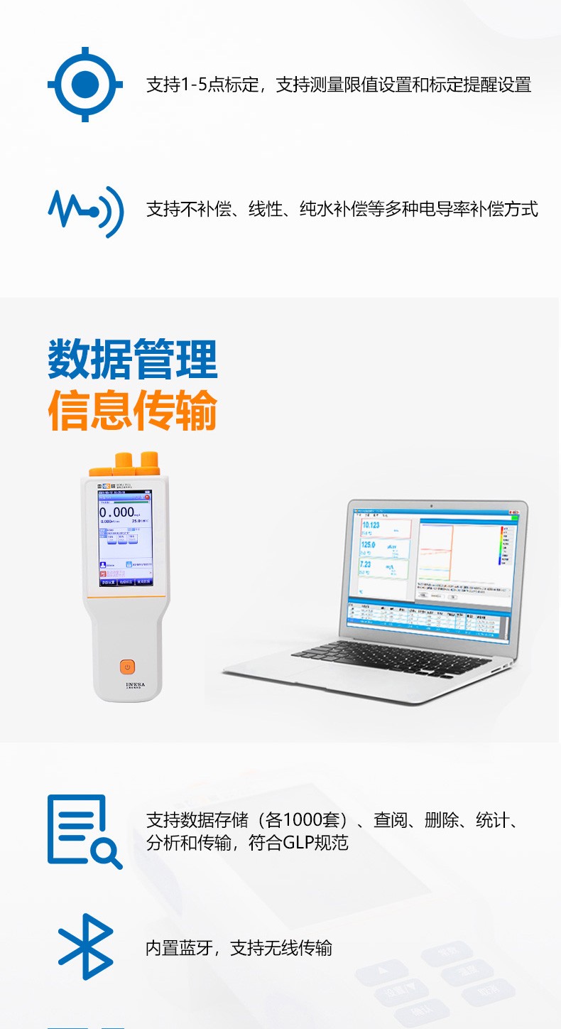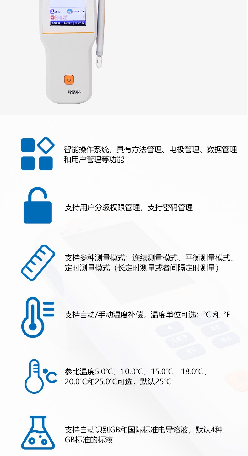 ● 自动识别GB和国际标准电导溶液,支持1-5点电导电极标定