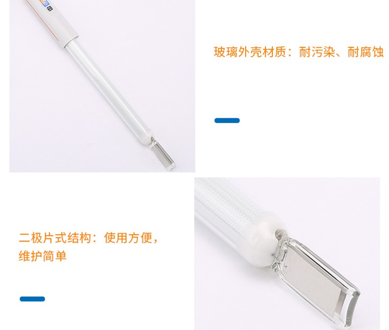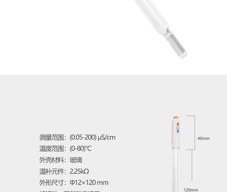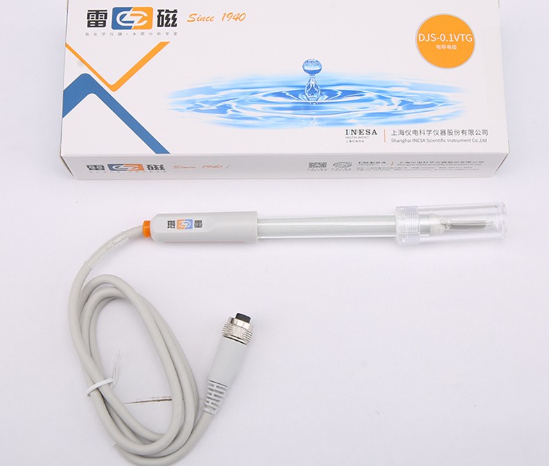 雷磁DJS-0.1VTG电导电极的测量范围为0.05~200μS/cm,外壳为玻璃材质,是一款光亮电极,适用温度范围为0~80℃。