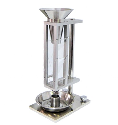 粉末放入上部组合漏斗中的筛网上,自然或靠外力流入布料箱,交替经过布料箱中的四块倾斜角为25°的石英玻璃板和方形漏斗,最后流入已知体积的圆柱杯中,呈松散状态。然后称量圆柱杯中的粉末的质量。