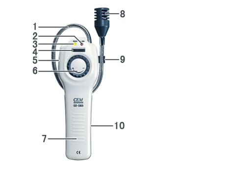 6.感应灵敏度调节 7.手持把柄 8.传感器和护罩 9.鹅颈管夹子 10.电池盖(背面)