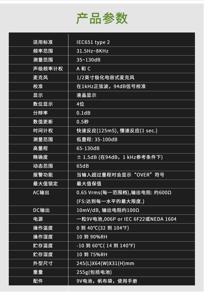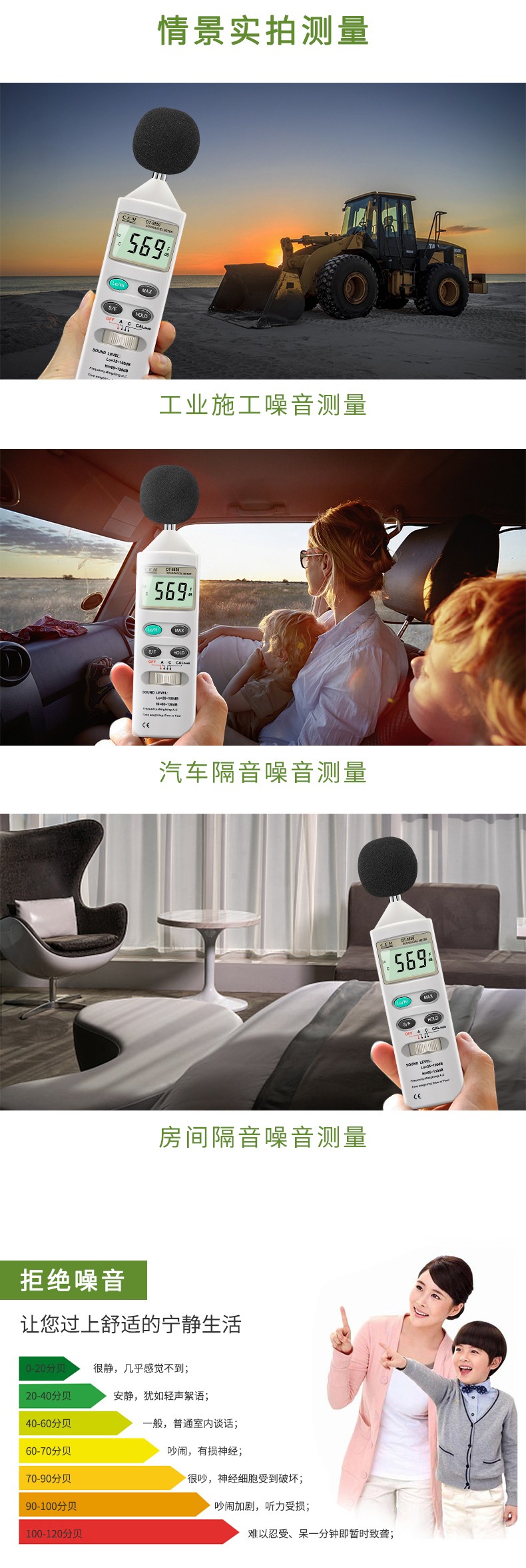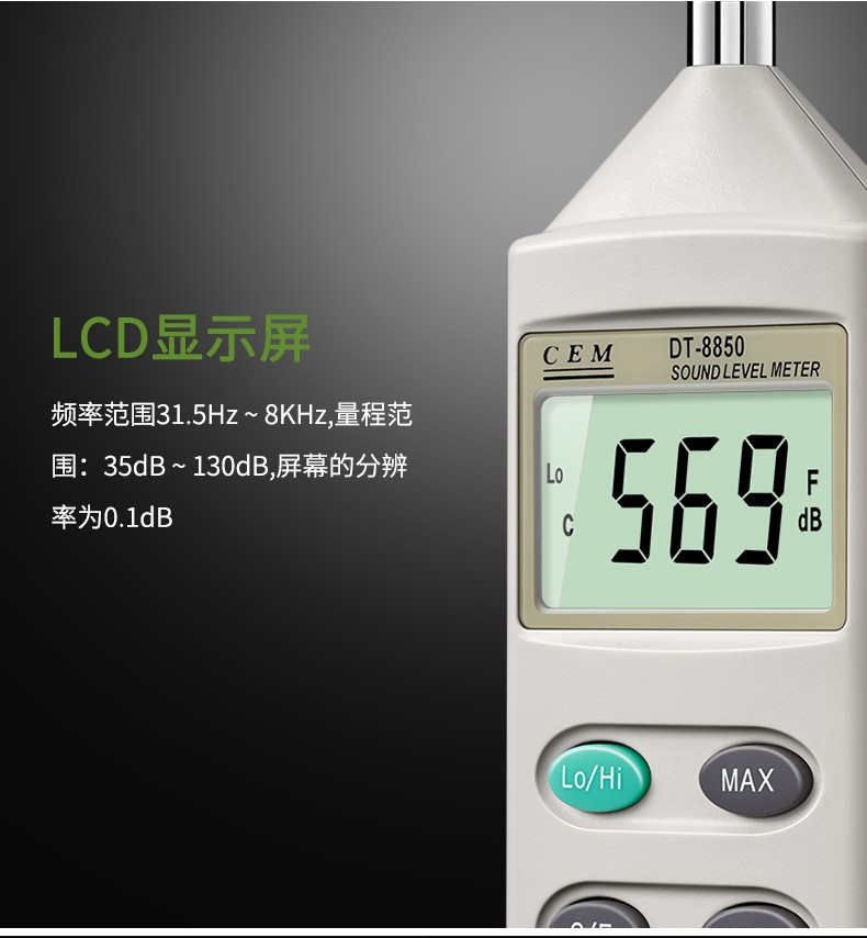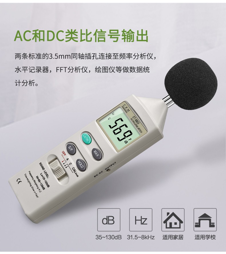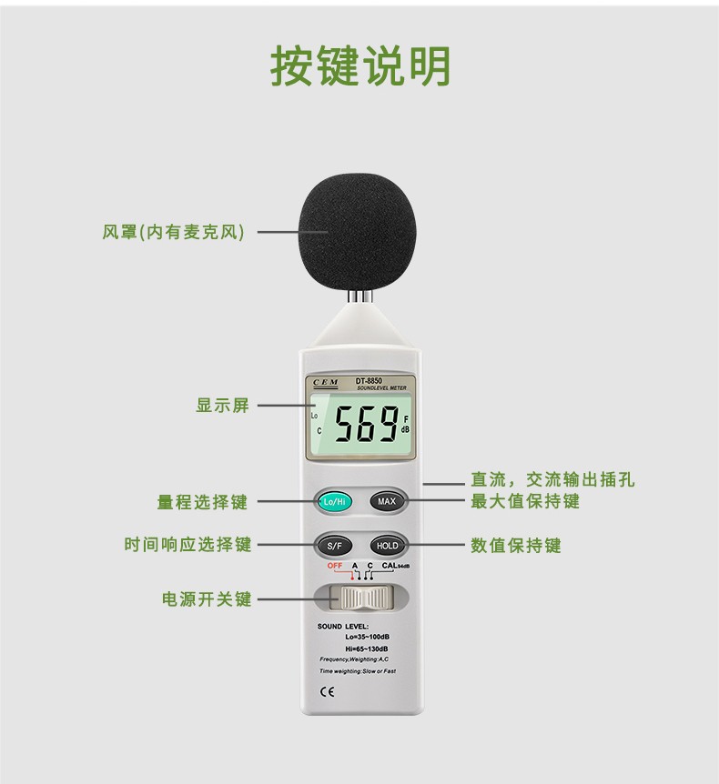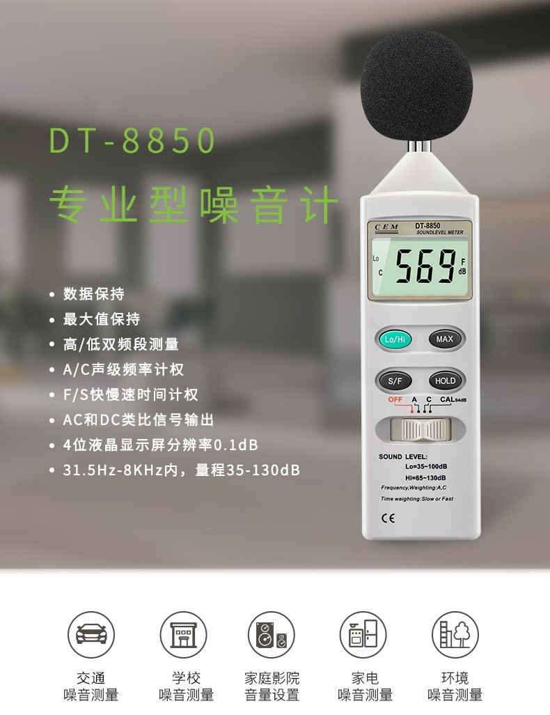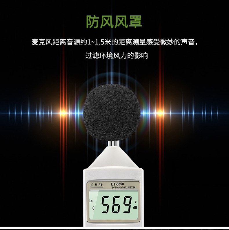 华盛昌CEM DT-8850噪音监测仪是一款符合IEC651 type 2标准的专业噪音测量设备。它具有广泛的测量范围,从35dB到130dB,覆盖了各种环境中的噪音水平。此外,它支持A和C声级频率计权,具备精确的测量性能,精度为±1.5dB。噪音监测仪配备了1/2英寸极化电容式麦克风,并提供快速和慢速响应时间选项,以满足不同的测量需求。其液晶显示屏、最大值锁定功能以及AC和DC输出等特点使其成为广泛应用于各种领域的可靠噪音测量工具。