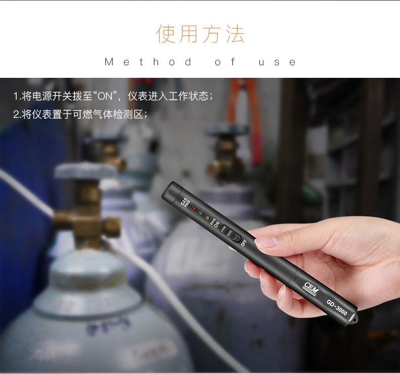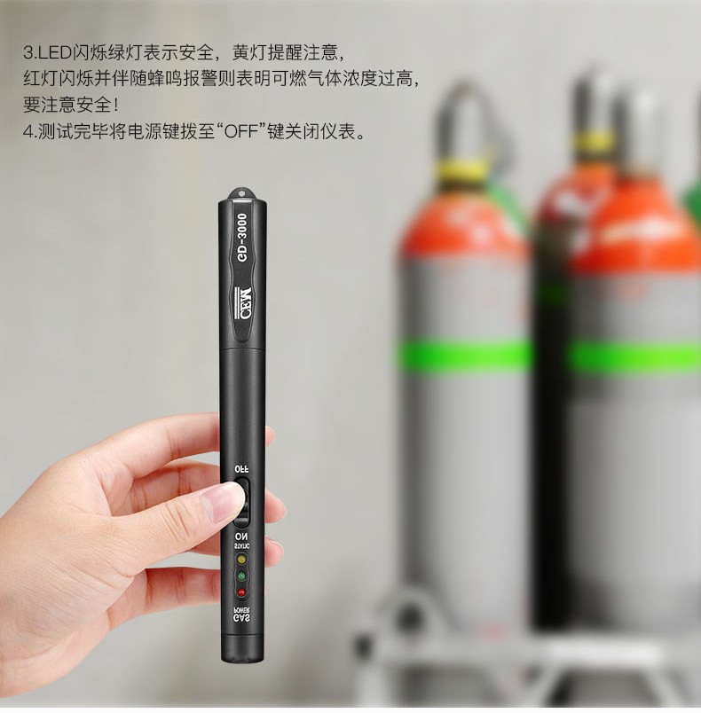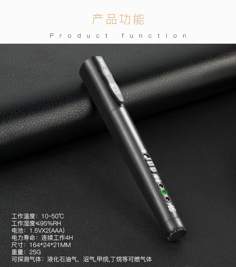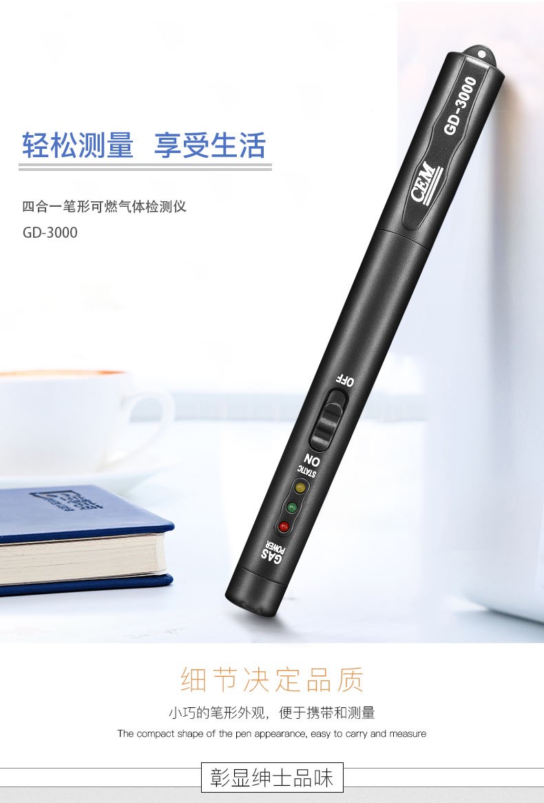 产品描述:华盛昌CEM GD-3000四合一笔型可燃气体检测仪可探测气体液化石油气、沼气、甲烷、丁烷等可燃气体,工作温度10~50℃,工作湿度≤95%RH。