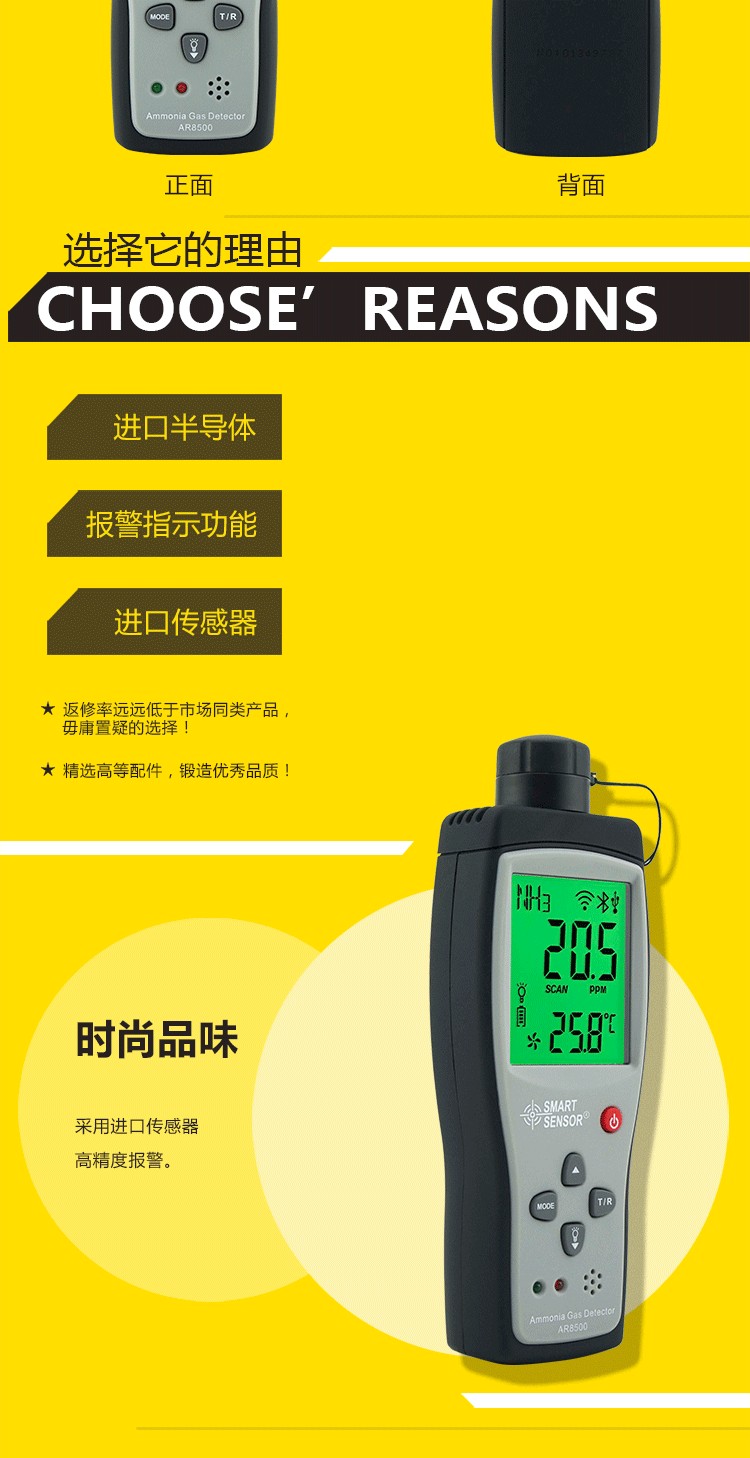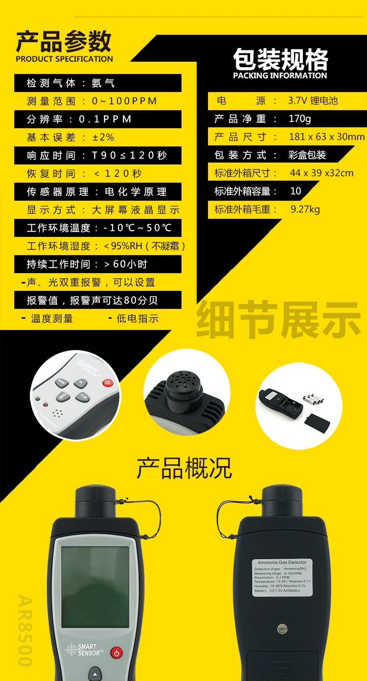 希玛 AR8500 氨气检测仪是一种气体泄露浓度检测的仪器仪表工具,主要是指便携式/手持式气体检测仪。主要利用气体传感器来检测环境中存在的气体种类,气体传感器是用来检测气体的成份和含量的传感器。一般认为,气体传感器的定义是以检测目标为分类基础的,也就是说,凡是用于检测气体成份和浓度的传感器都称作气体传感器,不管它是用物理方法,还是用化学方法。比如,检测气体流量的传感器不被看作气体传感器,但是热导式气体分析仪却属于重要的气体传感器,尽管它们有时使用大体一致的检测原理。