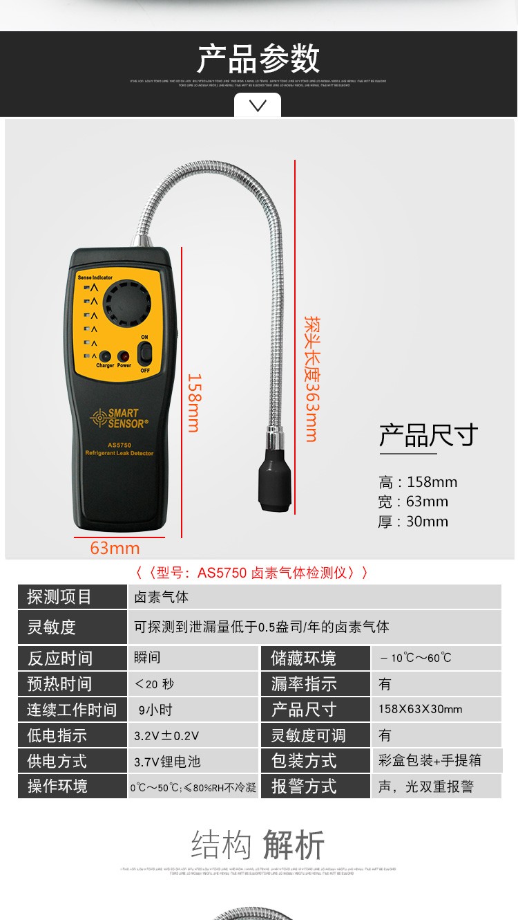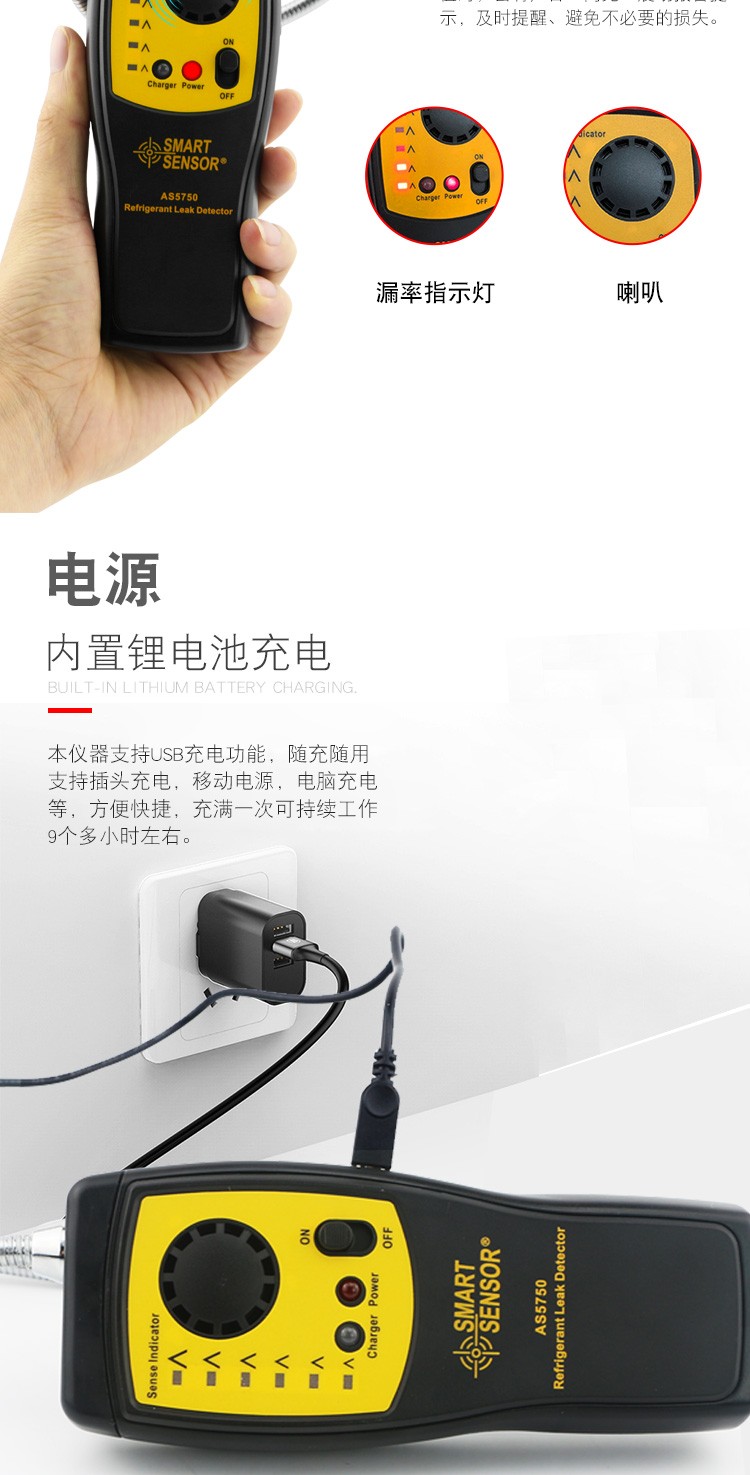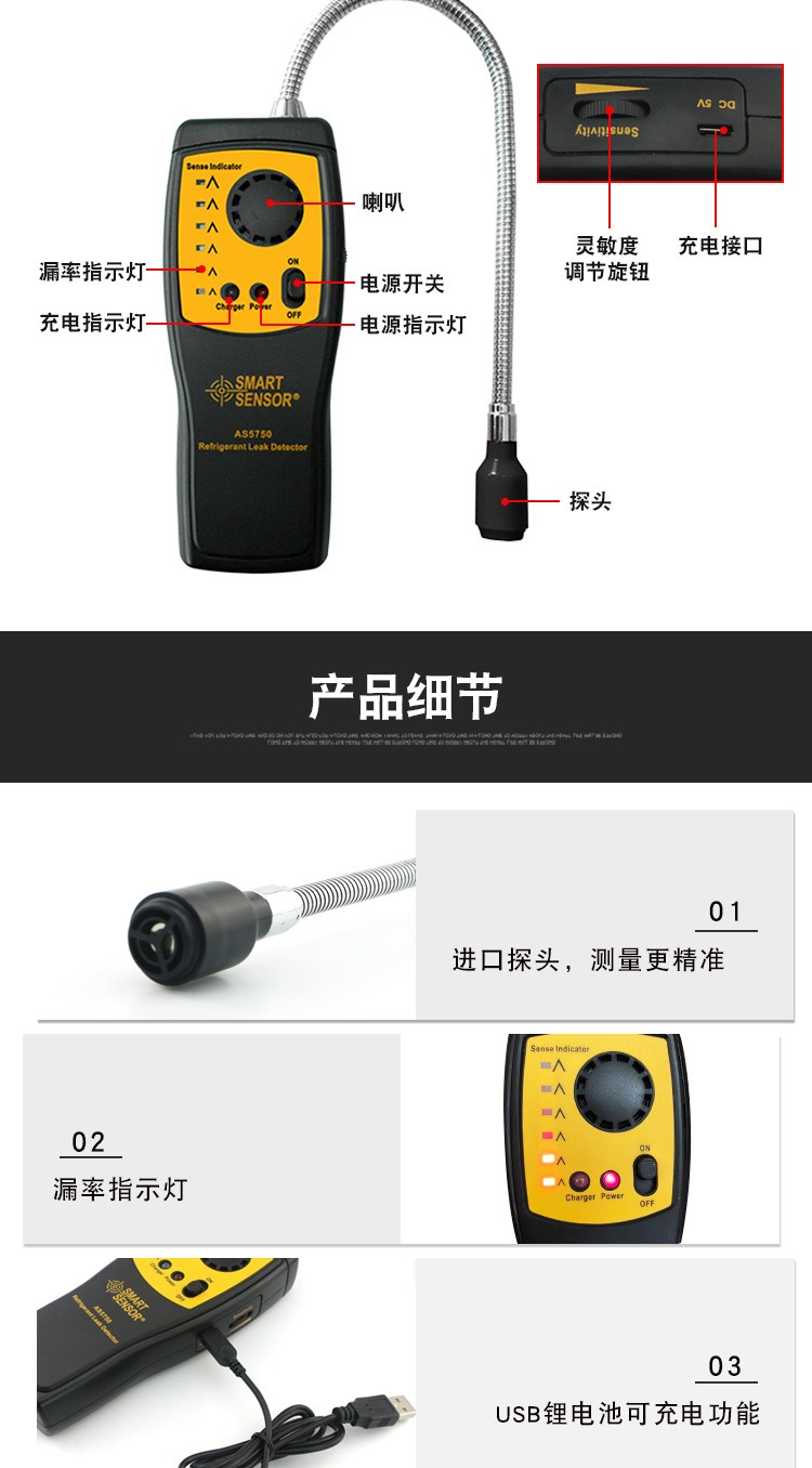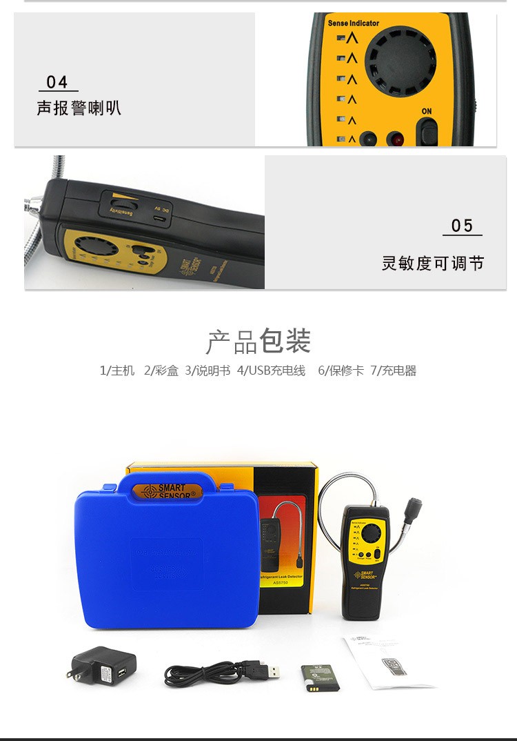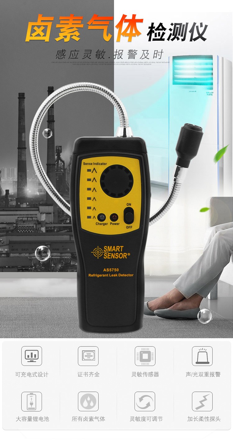 希玛 Smart Sensor AS5750 卤素气体检测仪是一款高效便捷的气体泄漏浓度检测工具,专门设计用于检测易燃气体、制冷剂、卤素气体等。采用半导体传感器原理,具备出色的响应速度和高灵敏度,可以探测到低至0.5盎司/年的卤素气体泄漏。此检测仪器预热快速,响应迅速,在室温下仅需不到110秒的预热时间和不到1秒的响应时间。具备可调灵敏度、LED灯报警、低电和模拟量提示等实用功能,工作时长长达9小时,搭载3.7V锂电池供电,轻巧便携,适用于各种卤素气体检测任务,是一款出色的气体检测仪。