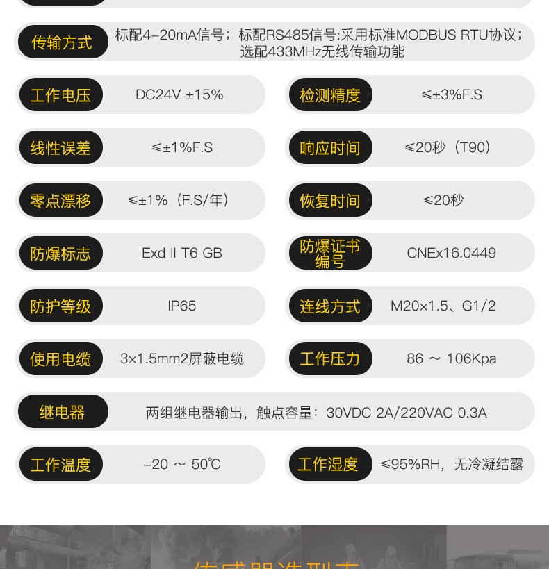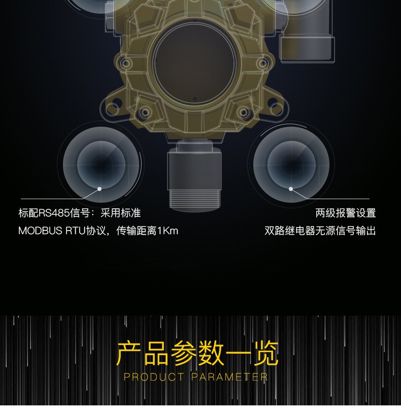 保时安K-G60(H2)工业用氢气气体报警器探测器,适用于监测工业环境中的氢气浓度。产品型号为K-G60(H2),支持01000ppm的量程范围,可选05000ppm,分辨率为0.1PPM。低报警点为50PPM,高报警点为150PPM,确保在气体浓度升高时及时报警。产品支持多种传感器技术,包括电化学、催化燃烧和半导体。可选的安装方式包括壁挂式、管道式、流通式和泵吸式。传输方式包括标配的4-20mA和RS485通信,支持MODBUS RTU协议,可选配433MHz无线传输功能。符合防爆标志Exd II T6 GB和防护等级IP65,适用于各种恶劣的工业环境。工作温度范围为-20~50℃,检测精度≤±3%F.S,线性误差≤±1%F.S,响应时间≤20s,零点漂移≤±1%(F.S/年),恢复时间≤20s。