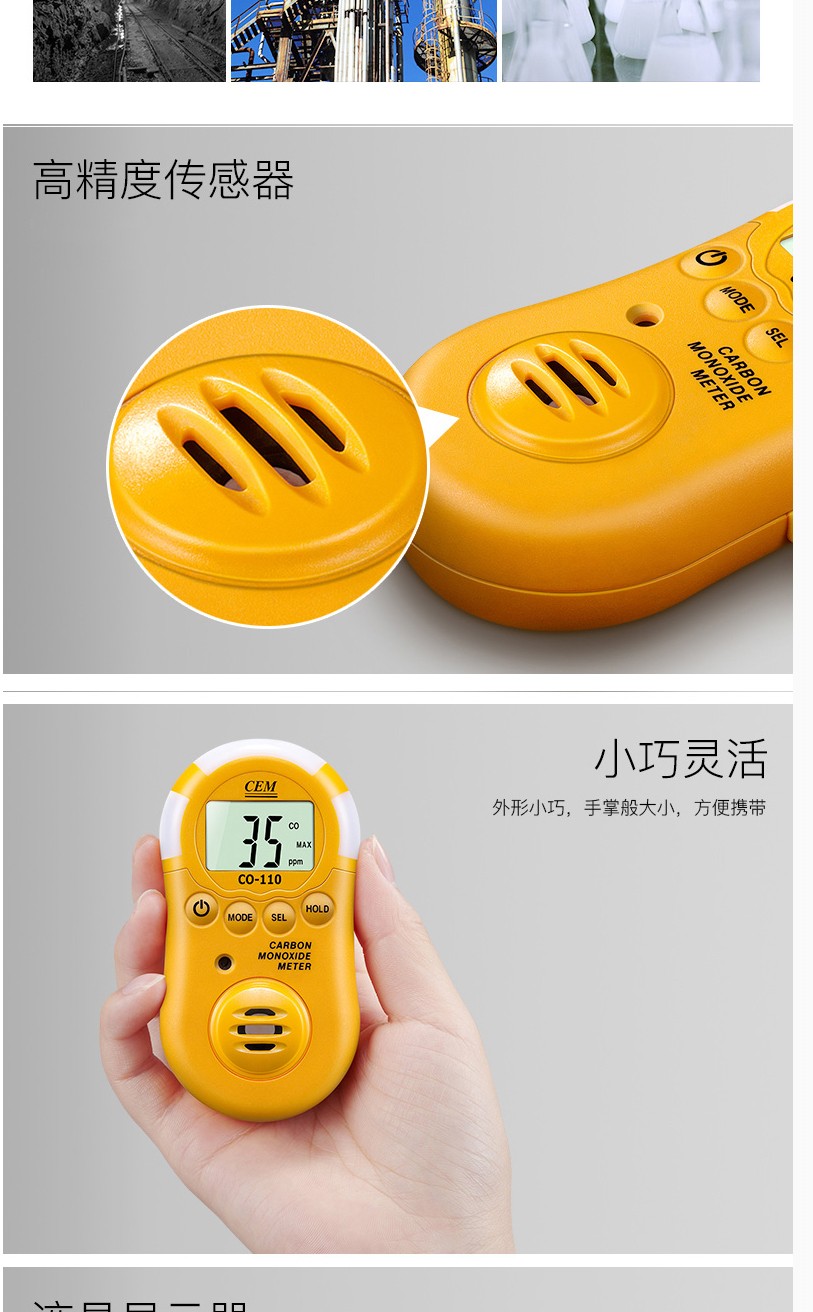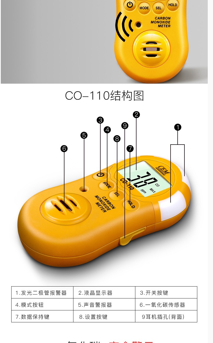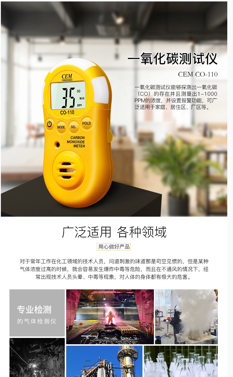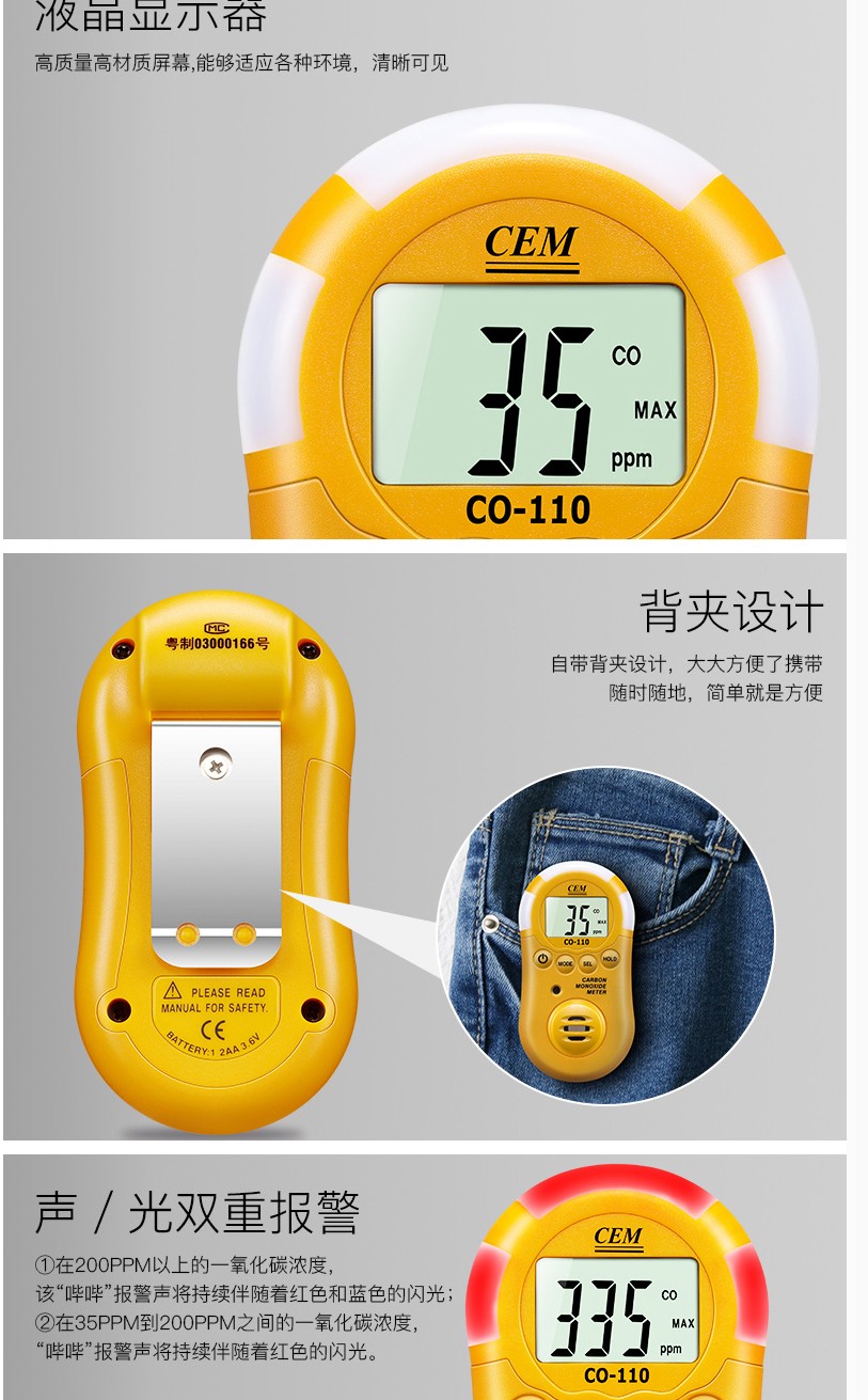 华盛昌CEM CO-110一氧化碳检测仪是一款高性能、便携式的CO检测设备。它具有广泛的量程范围,快速的预热时间,以及精确度高的CO稳定电化学传感器,能够迅速检测一氧化碳浓度,确保安全和及时的警报,是保护生活和工作环境免受CO污染的重要工具。此外,它便携轻巧,适合携带到各种场合,如家庭、工厂和办公室等,确保空气质量的监测和安全。