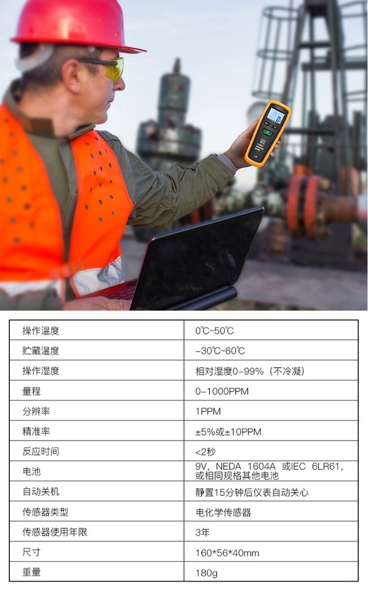 产品描述:化学传感器,量程范围0~1000ppm,分辨率1 PPM,精确度+5%或+10PPM,反应时间<2秒,电池9V