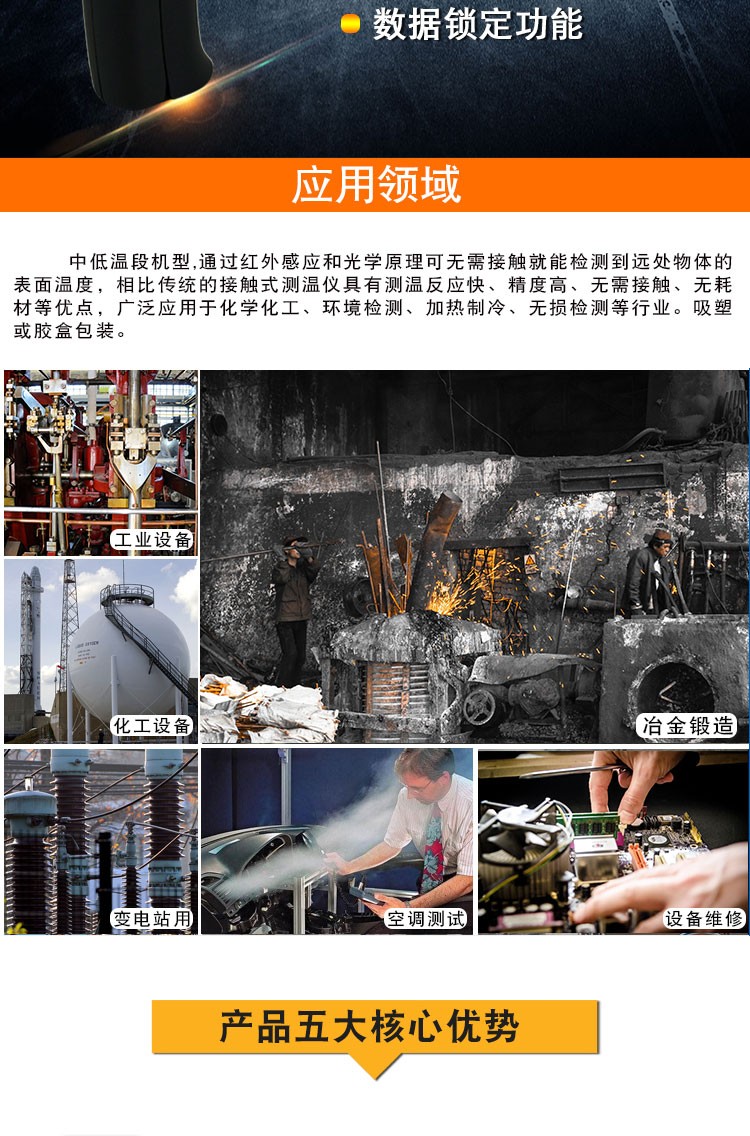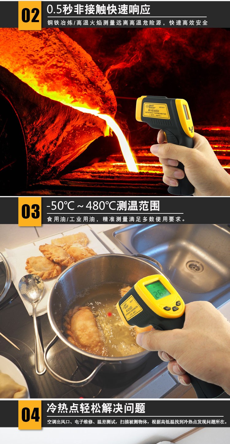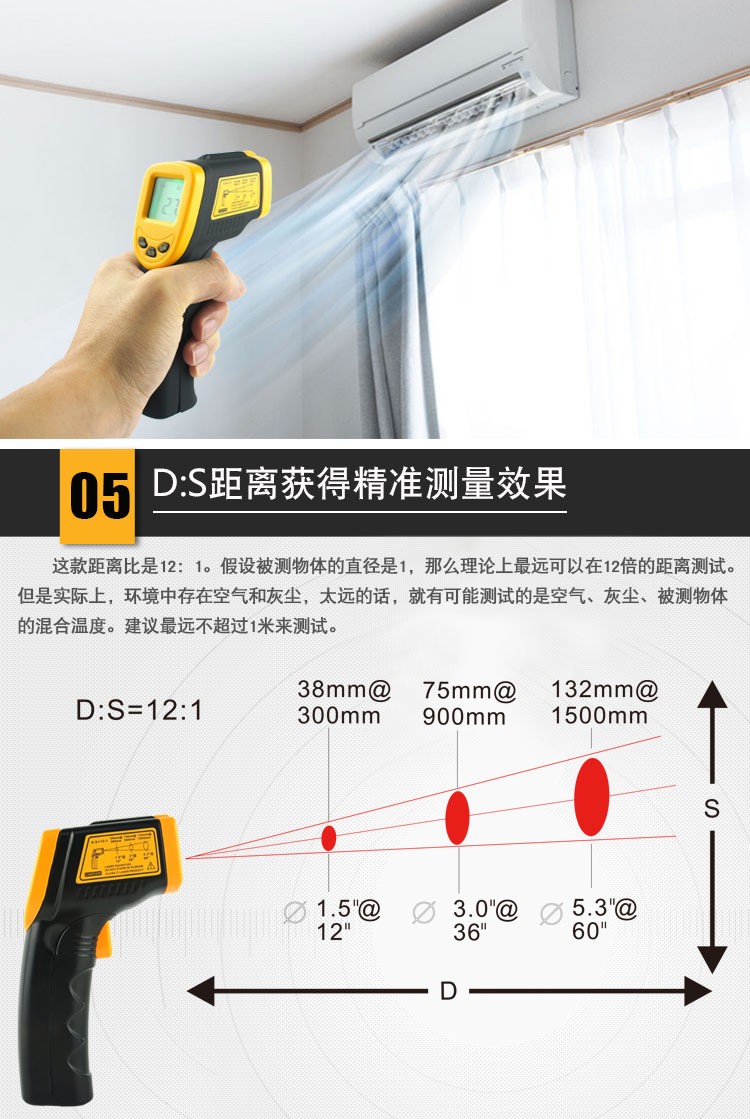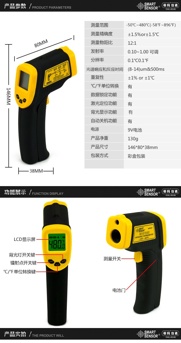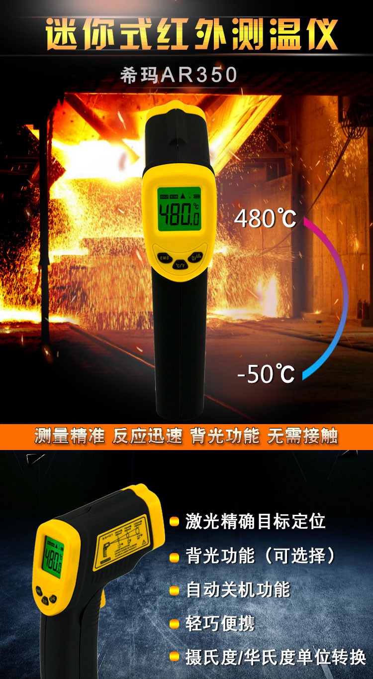希玛AR350+是一款迷你式红外测温仪,具有广泛的温度测量范围从-50℃到480℃。这款测温仪具有出色的精确度,仅为±1.5%,并提供0.1℃的分辨率,以及非常低的重复性误差,仅为±0.1℃或±1%。其12:1的物距比允许用户在远距离安全、准确地测量温度。AR350+还具有快速响应时间,仅为500ms,以及可靠的8~14μm响应波长。这款仪器适用于0~40℃的工作温度范围,并具有相对湿度适用于10-95%。由于其紧凑的外形和轻便的设计,它易于携带和操作,电池寿命长达12小时,为用户提供了便携式、高性能的温度测量解决方案。