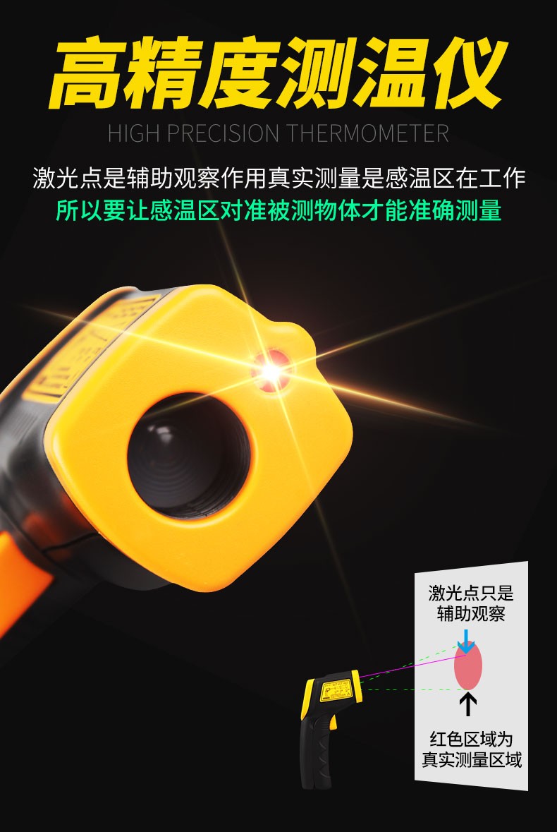 希玛 AR872D+ 红外线测温仪以其广泛的测温范围(-50~1150℃)和高度精确的温度测量,在低温到高温的各种环境下都能提供可靠的测量结果。具备12:1的物距比,支持多种发射率设置,快速响应时间,以及实用的功能如数据锁定、激光定位、背光和自动关机,电池寿命长达12小时。这款仪器方便易用,适用于多种应用场景,是一款性能出色的红外线测温工具。