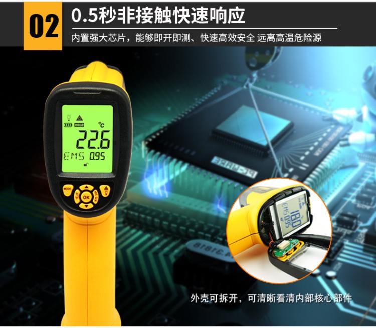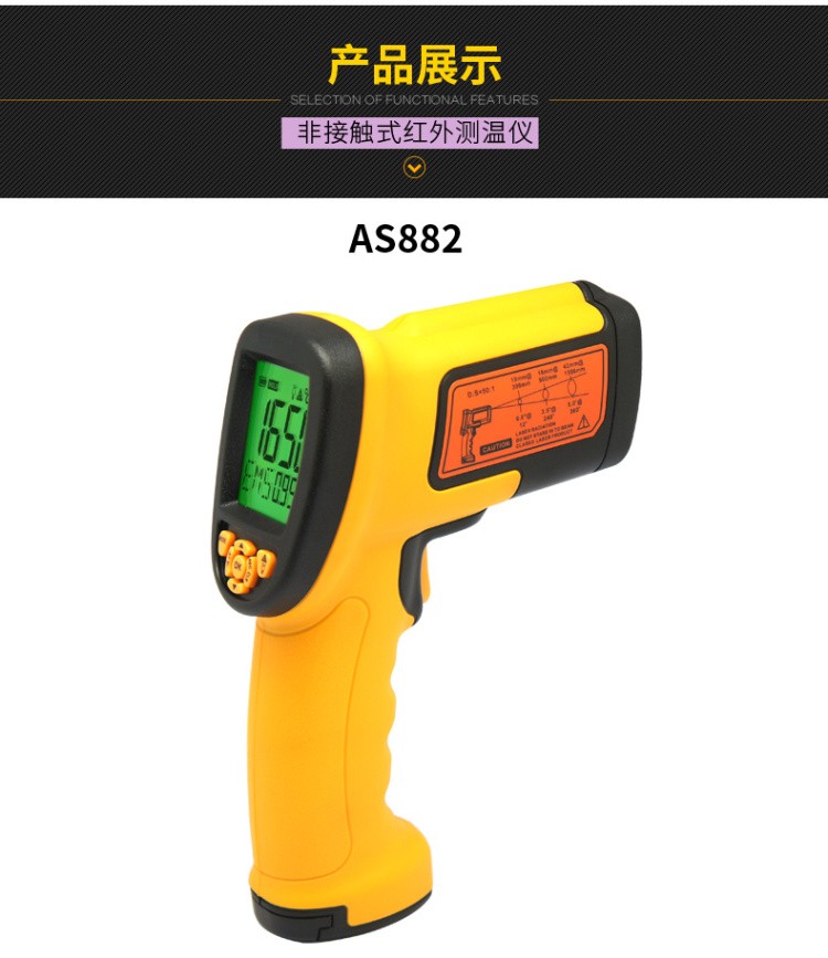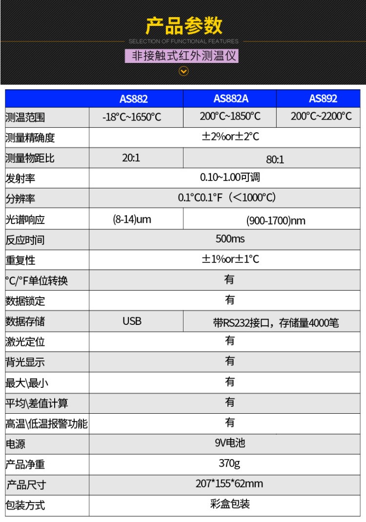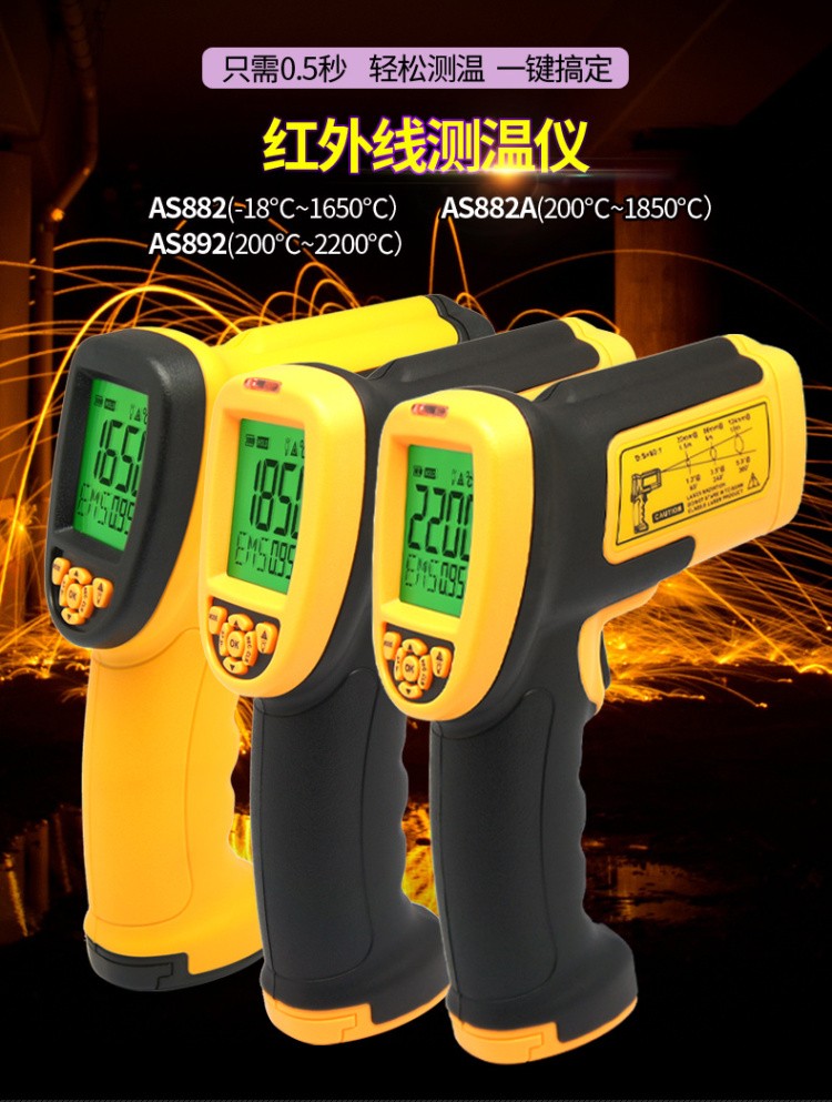 希玛smart sensor AS892短波红外测温仪具有广泛的测温范围,从200℃到2200℃,精确度高达±2%。它拥有多种实用功能,包括激光定位、背光灯、高低温报警设置、最大最小温度显示、发射率可调、数据保持等。此外,它具备快速响应时间和高物距比(80:1),使其在工业和科学领域中用于准确测量高温物体的表面温度非常方便。带有LCD显示屏和电池供电,结构紧凑便携,非常适合各种测温需求。