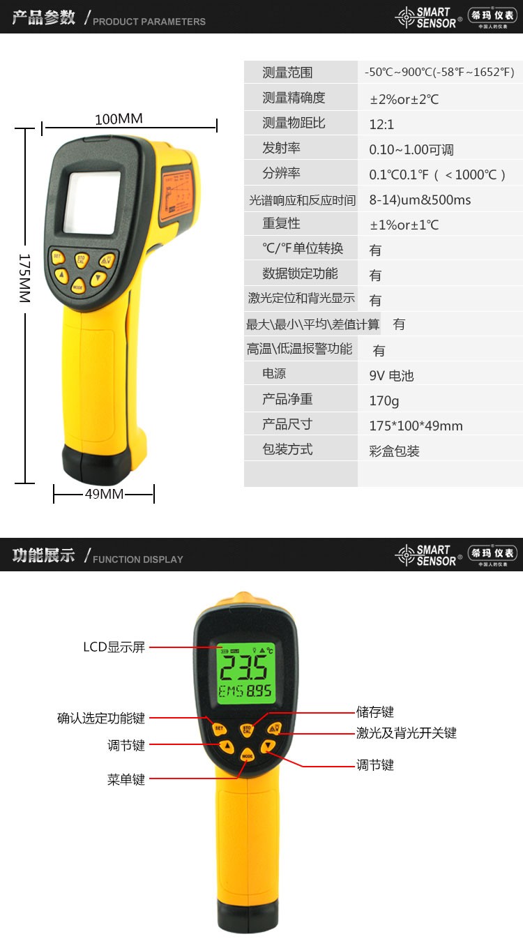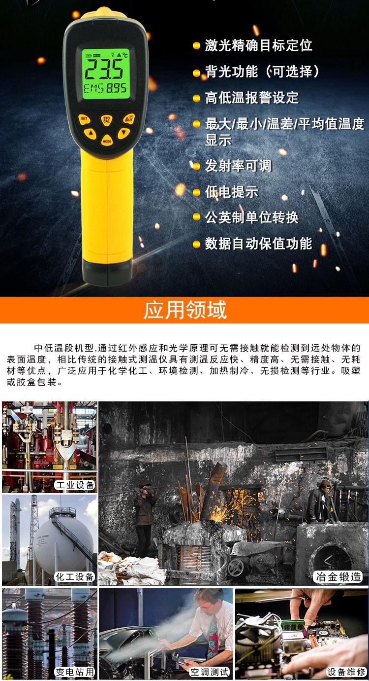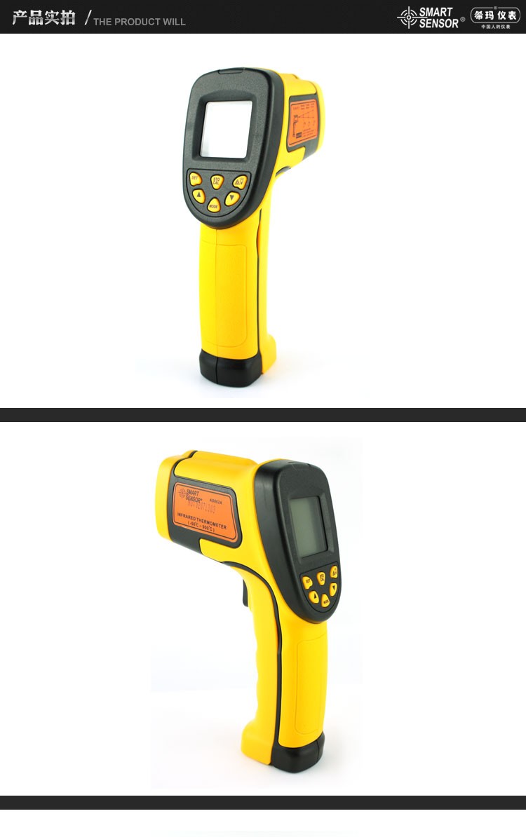 本产品结构紧凑、防干扰并易于使用。只要进行瞄准、按键,在一秒钟的时间内即可将当前的被测物体表面温度读出。对于高温、有毒或难以到达的物体,使用本产品即可安全地进行测量。