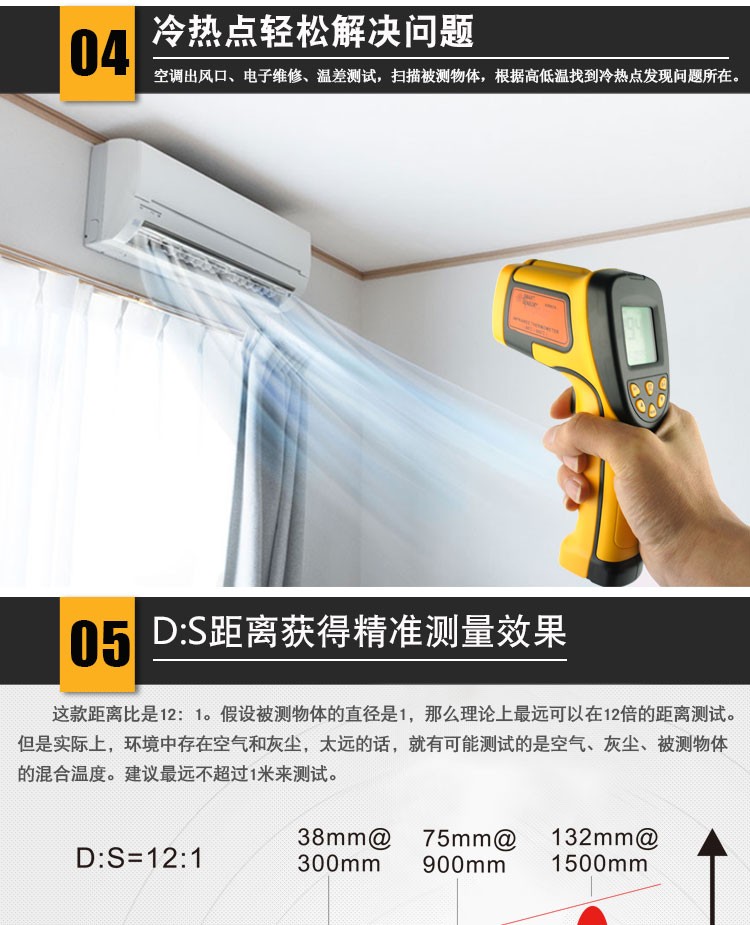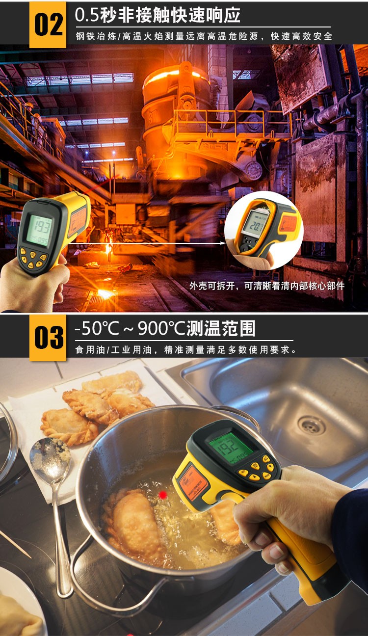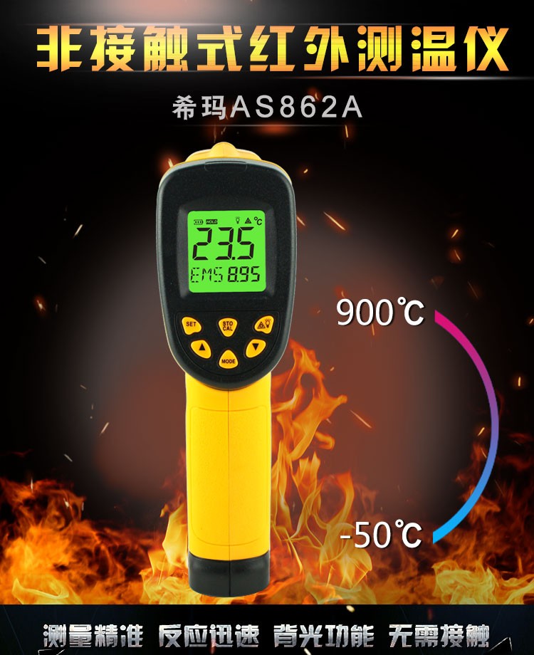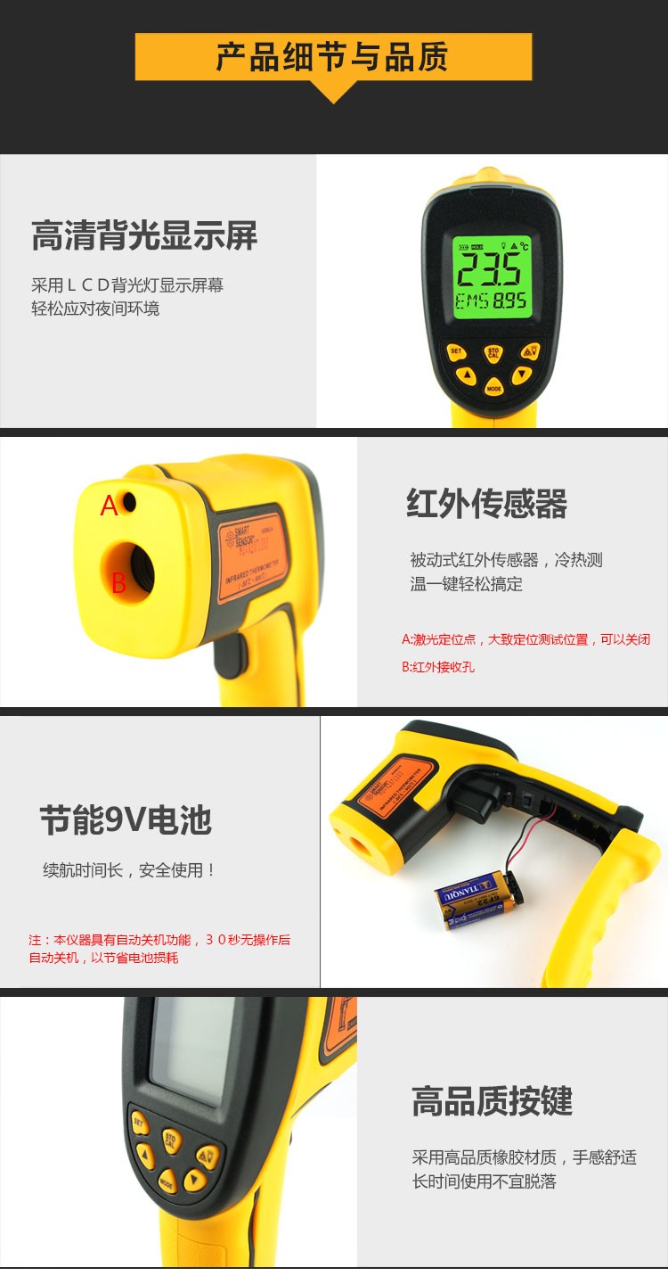 本产品结构紧凑、防干扰并易于使用。只要进行瞄准、按键,在一秒钟的时间内即可将当前的被测物体表面温度读出。对于高温、有毒或难以到达的物体,使用本产品即可安全地进行测量。