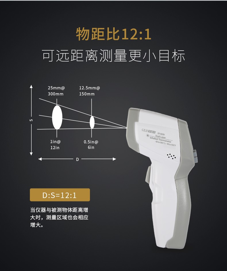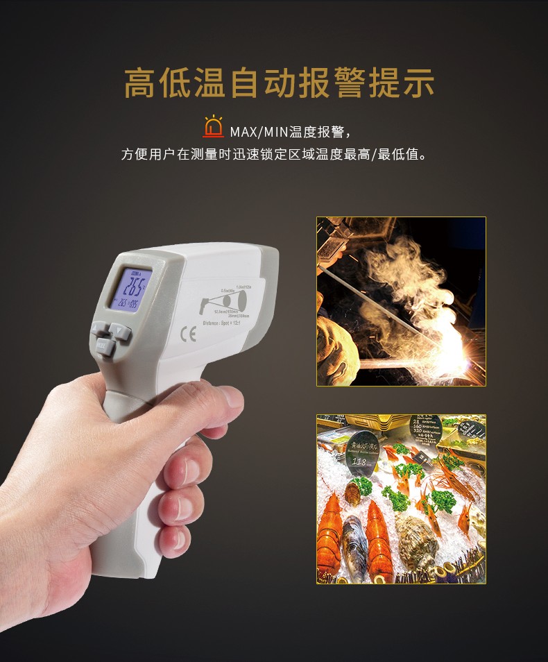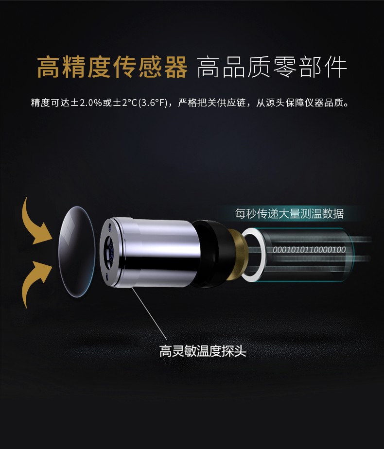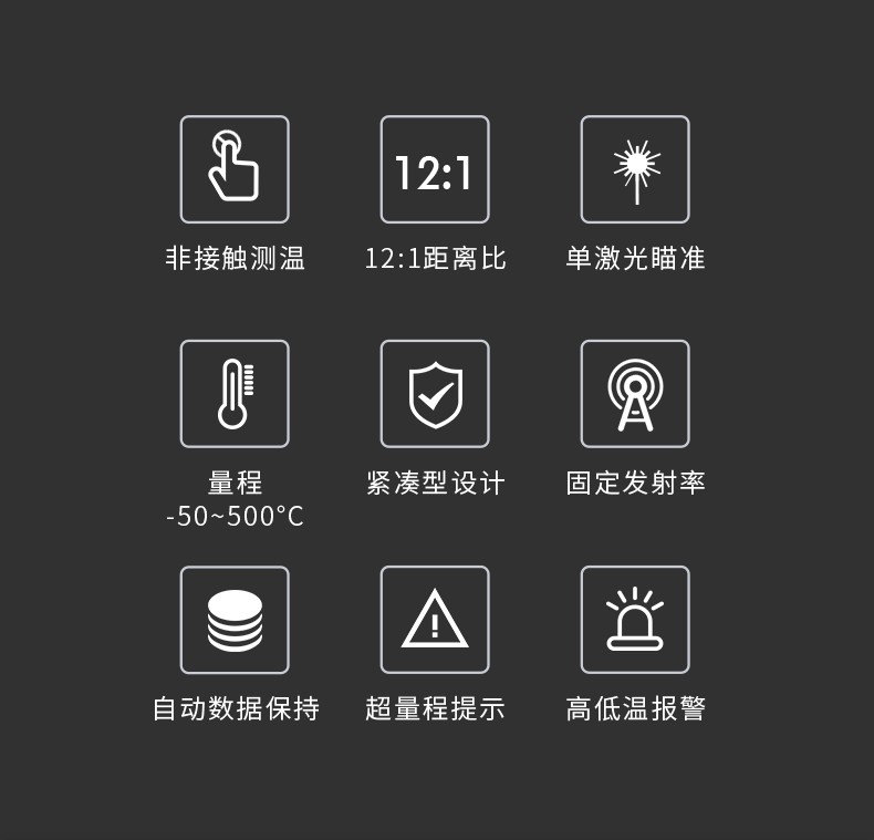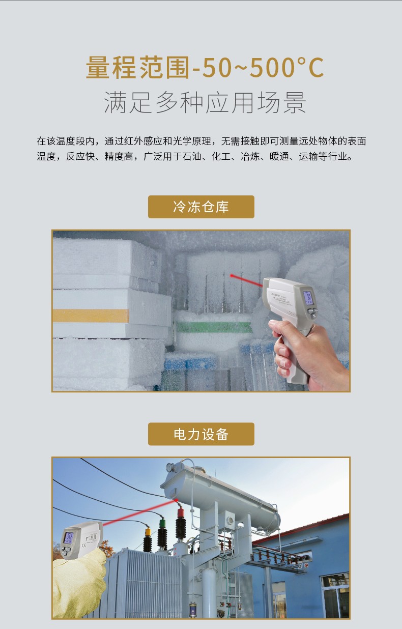 产品描述:坚固耐用、2米防摔、单激光测量,能在-50~500℃场景下准确测温,物距比12:1,支持远距离测量目标温度。