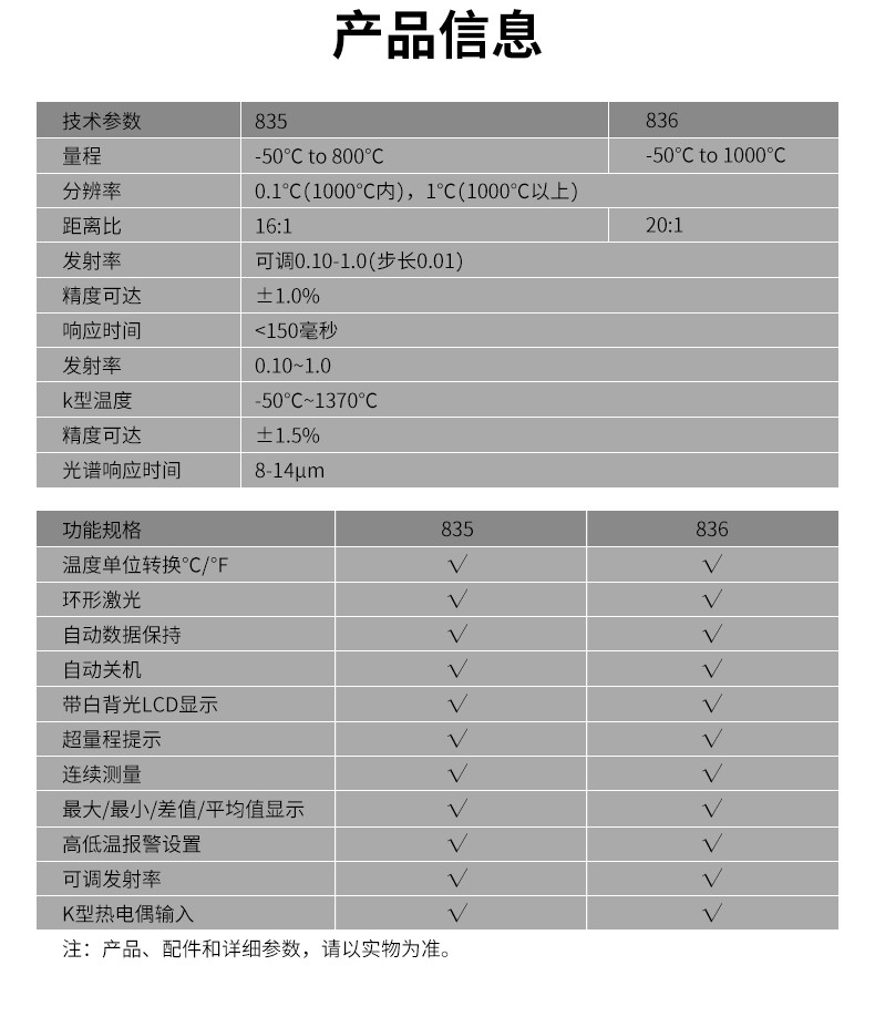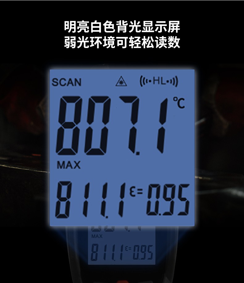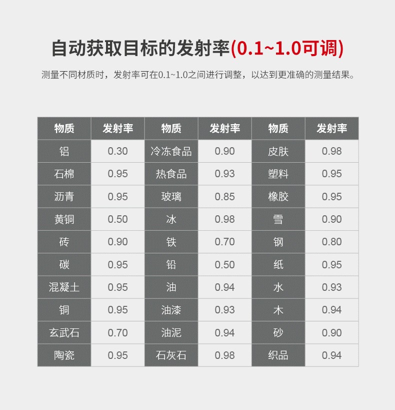 产品描述:华盛昌CEM DT-836二合一环形激光红外线测温仪量程-50°C to 1000°C,分辨率0.1°C(1000°C内),测量不同材质时,发射率可在0.1~1.0之间进行调整,以达到更准确的测量结果。