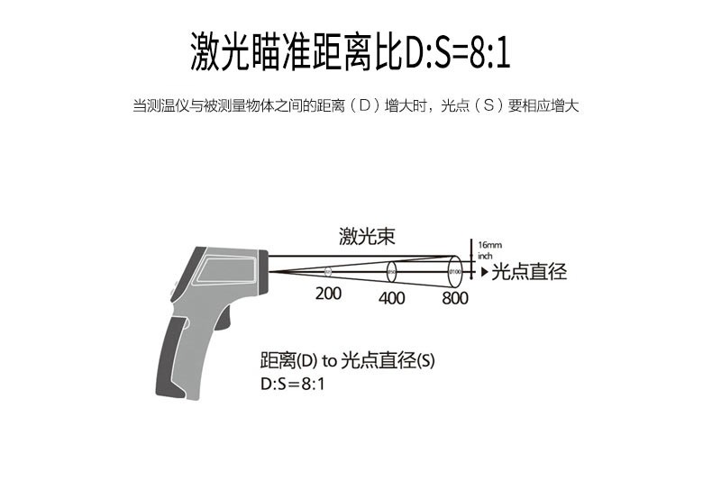 8、红外线测温距离与物体目标比(D:S=8:1)