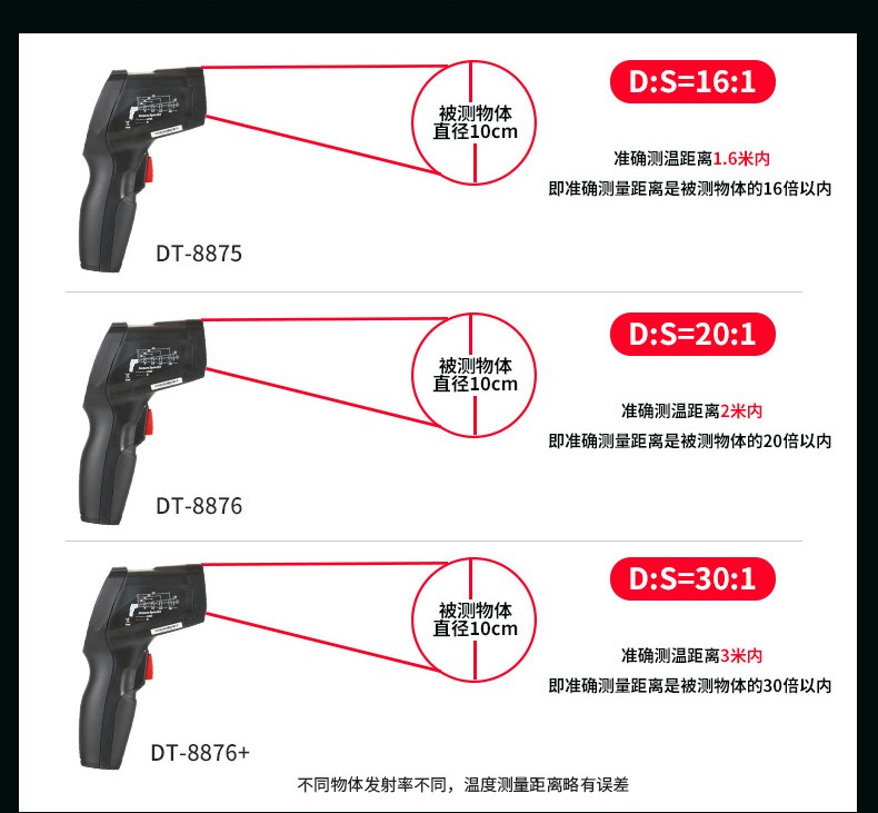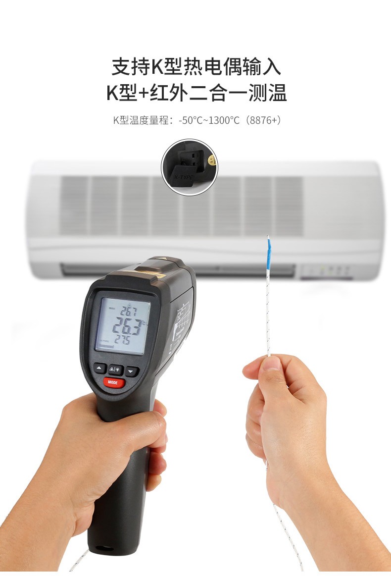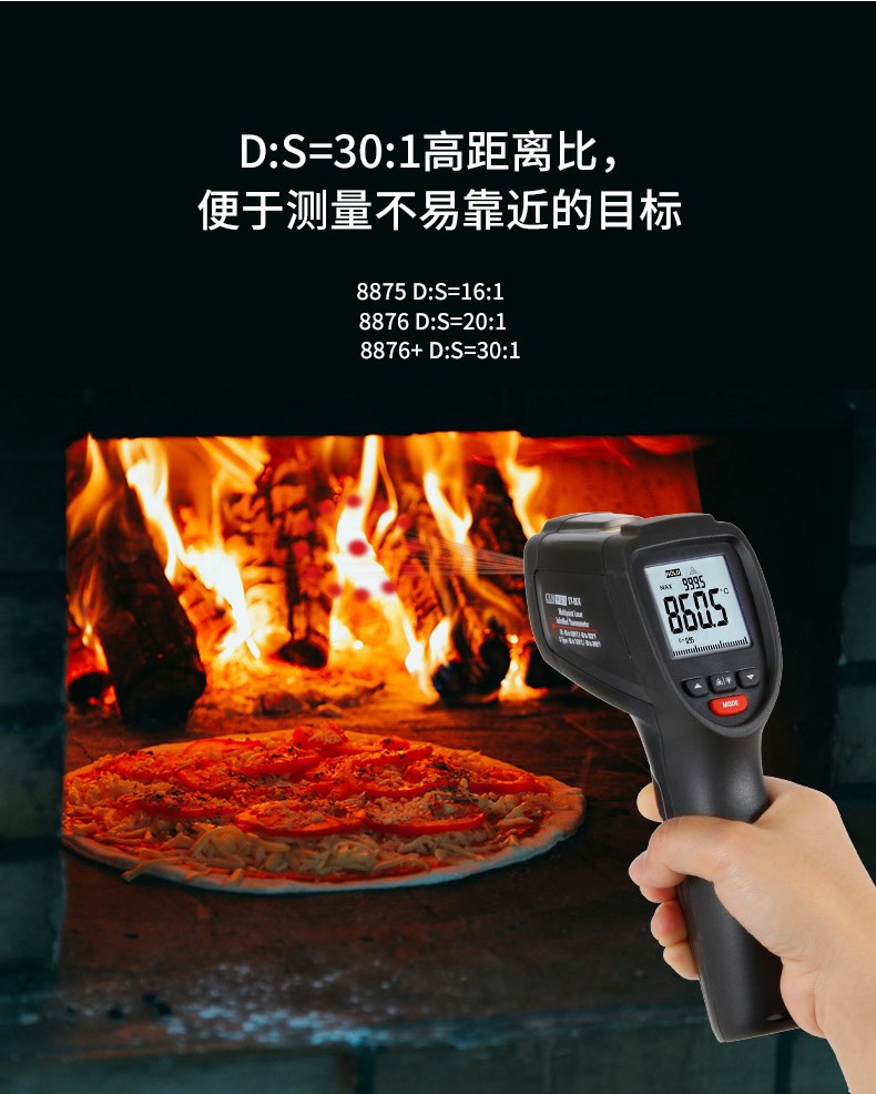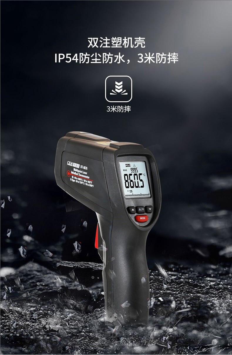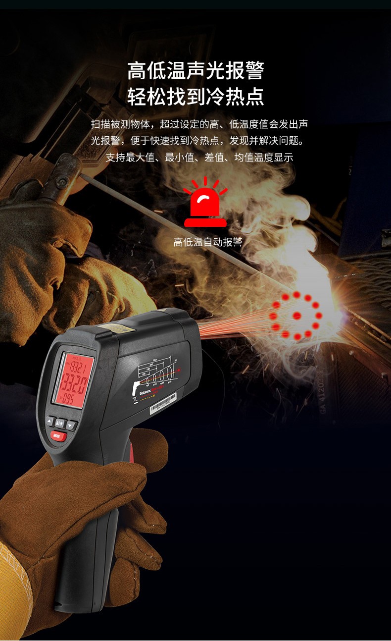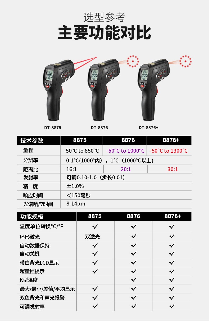 产品描述:华盛昌CEM DT-8876+环形激光红外线测温仪量程-50℃~1300℃,距离比30:1,发射率可调0.10-1.0 (步长0.01),精度±1.0%,光谱响应时间8-14μm,响应时间< 150毫秒。