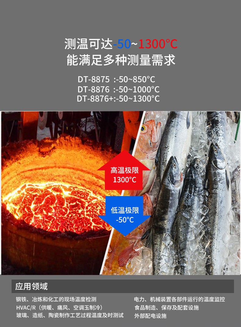 华盛昌CEM DT-8876+是一款环形激光红外线测温仪,具有多项卖点,包括广泛的测温范围从-50°C到1300°C,分辨率可达0.1℃,物距比为30:1,可调发射率,响应时间小于150毫秒,环形激光瞄准,自动数据保持和关机,带白背光LCD显示,支持K型温度测量,提供最大/最小/差值/平均显示,以及双色背光和声光报警功能。这款测温仪适用于广泛的应用领域,能够满足高温测温需求。