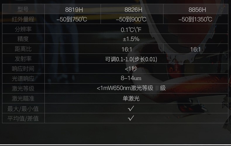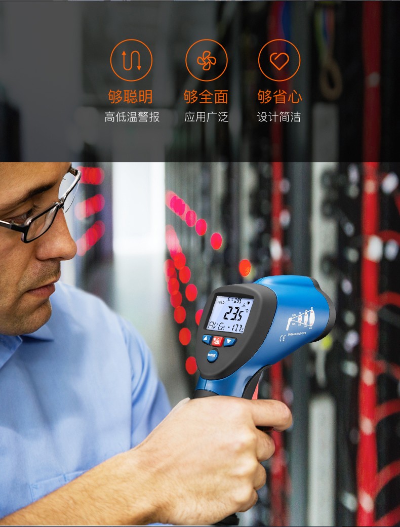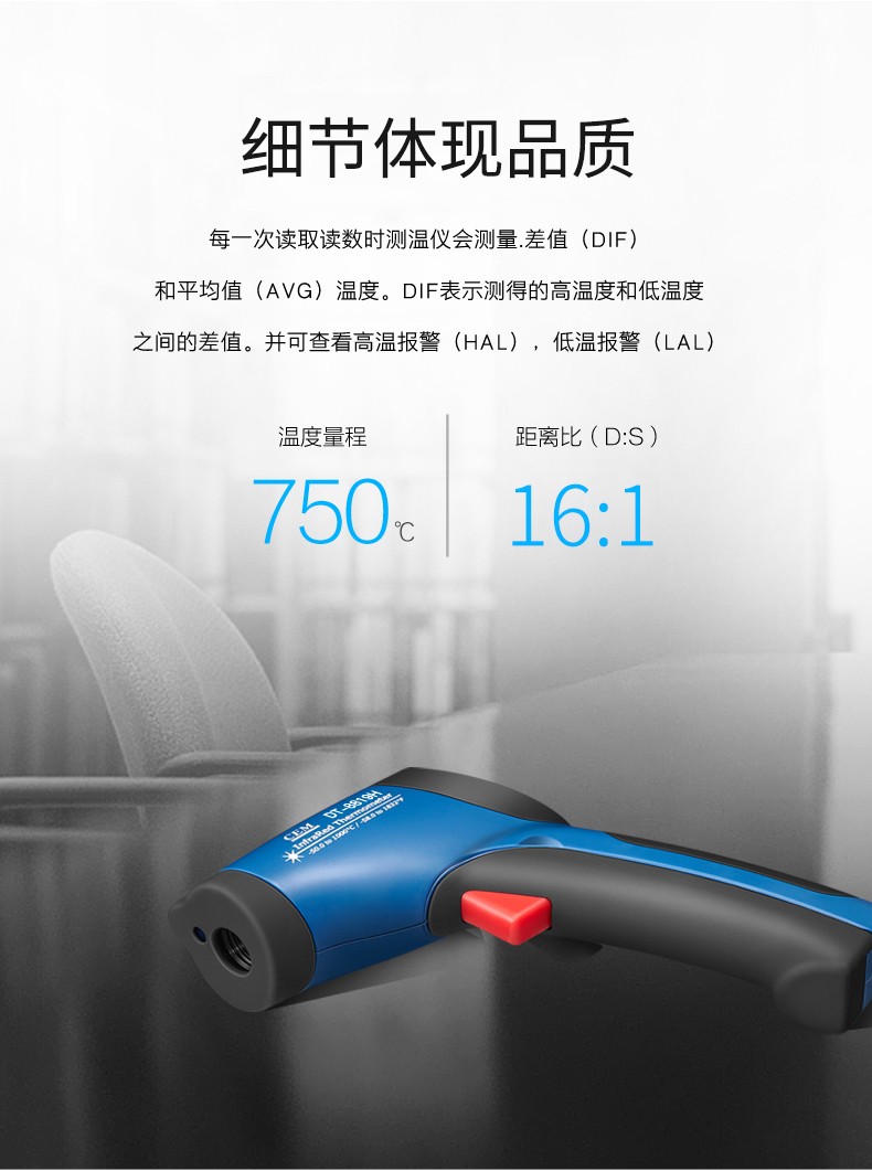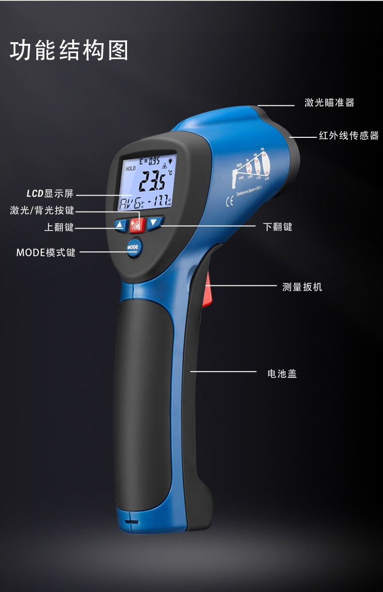 产品描述:量程-50~750℃,分辨率0.1℃/℉,精度±1.5%,距离比16:1,发射率可调0.1-1.0 (步长0.01),响应时间<1秒,激光等级<1mW 650nm激光等级II级,激光瞄准单激光