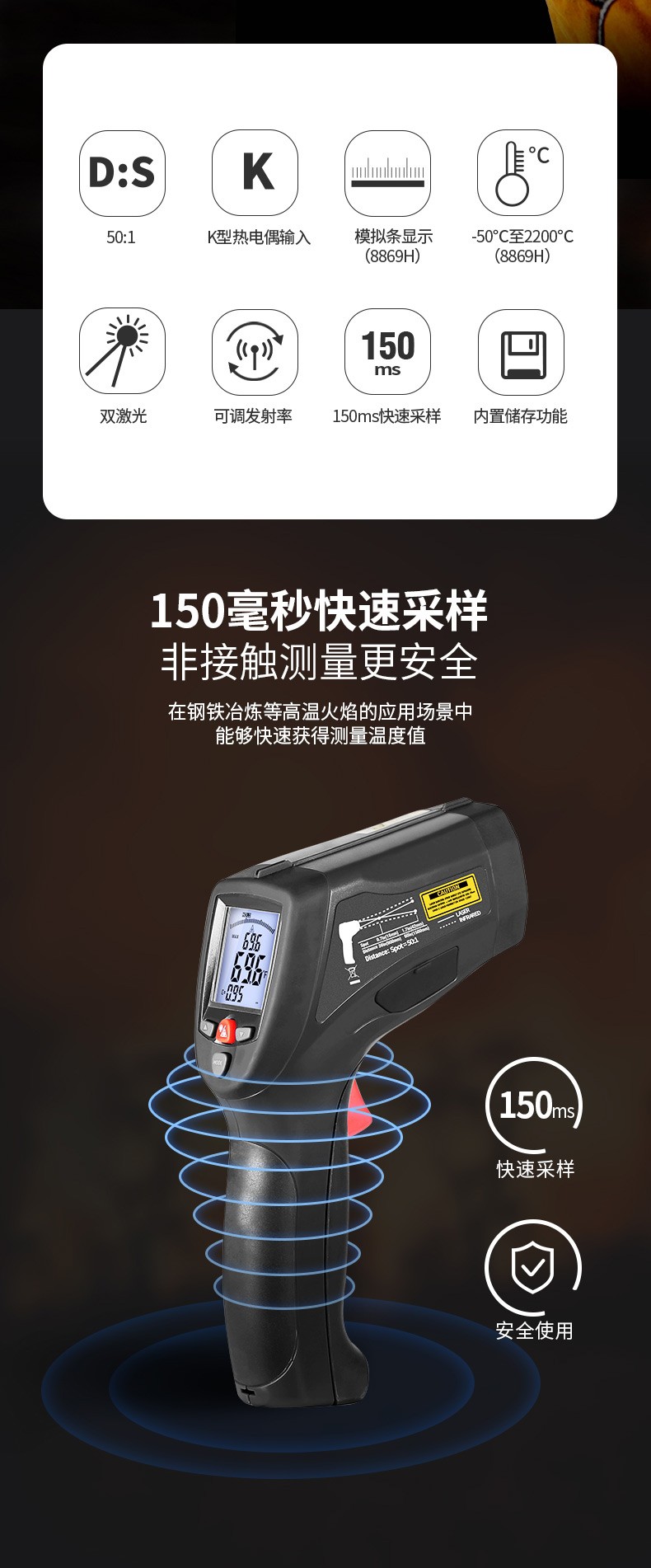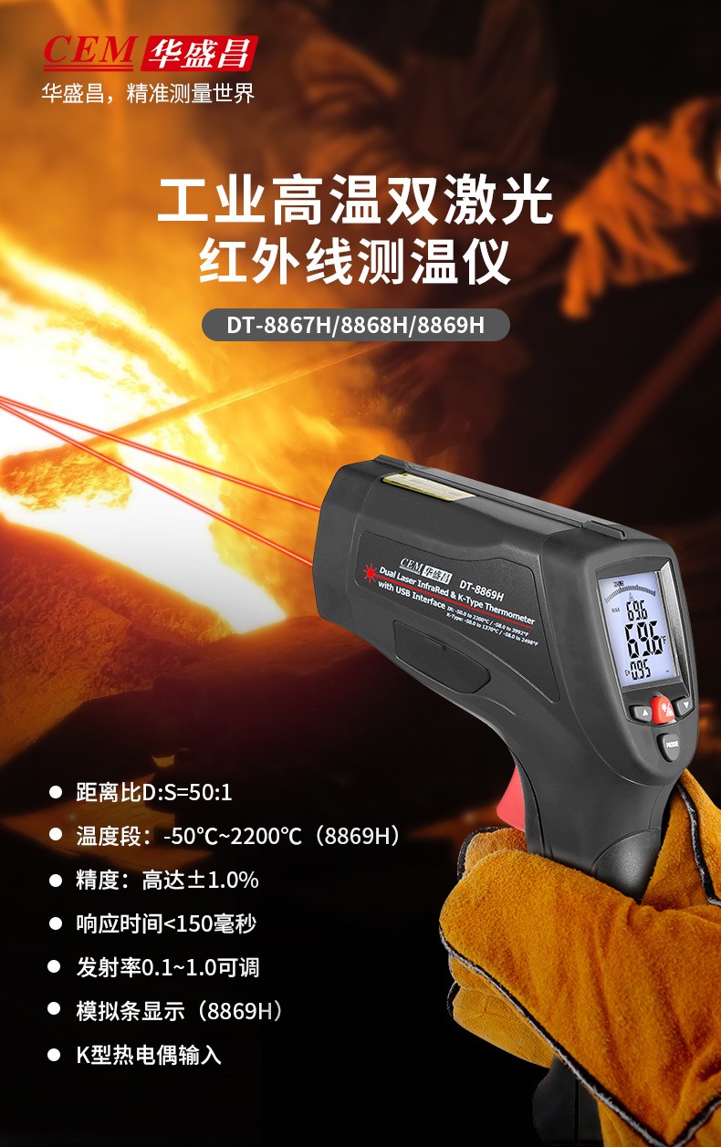 华盛昌CEM DT-8867H是一款工业高温双激光红外线测温仪,具备广泛的测温范围从-50°C到1650°C,分辨率可选0.1°C或1°C,采用50:1的物距比,支持可调发射率,精确度高达±1.0%,响应时间快,同时还配备了K型热电偶输入、双激光、数据保持、自动关机、带白背光LCD显示、高温报警、最大/最小/差值/平均值记录、USB接口等多项功能,适用于各种工业高温测温需求。