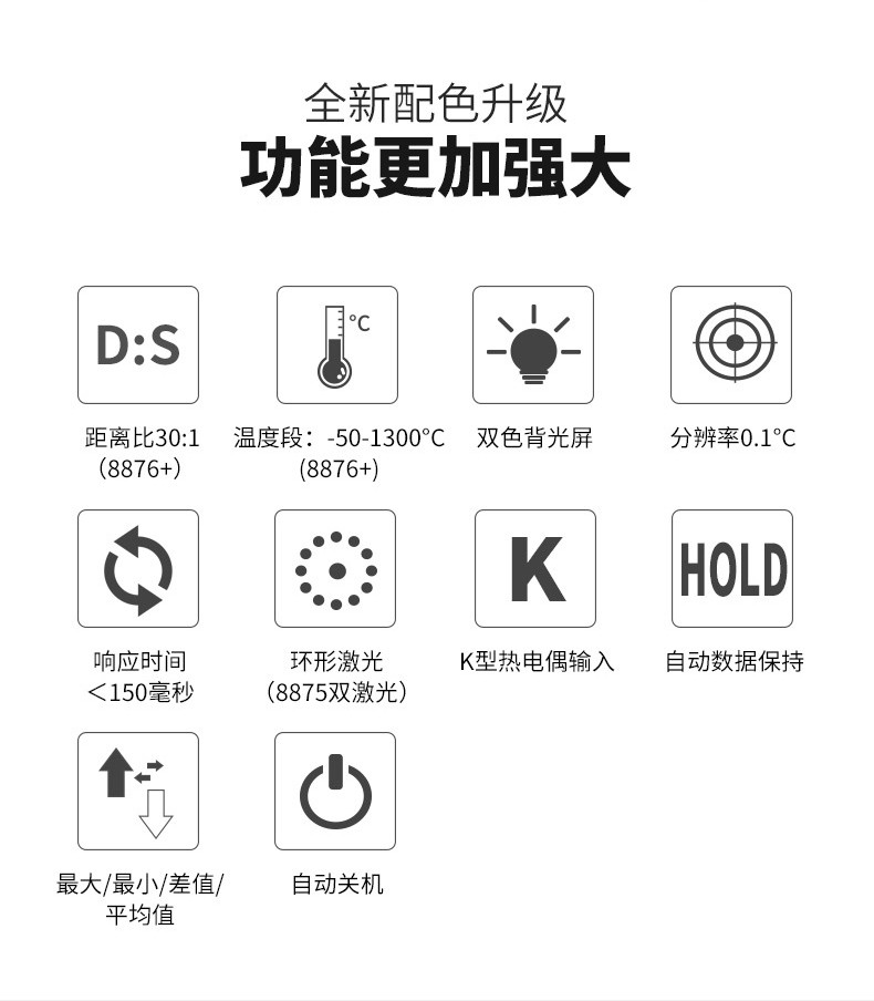 华盛昌CEM DT-8876是一款环形激光红外线测温仪,具有广泛的测温范围从-50°C到1000°C,分辨率可达0.1℃,物距比为20:1,可调发射率,响应时间小于150毫秒,环形激光瞄准,自动数据保持和关机,带白背光LCD显示,支持K型温度测量,提供最大/最小/差值/平均显示,以及双色背光和声光报警功能。这款测温仪适用于多种测温需求,具有高精度和便捷的特点。