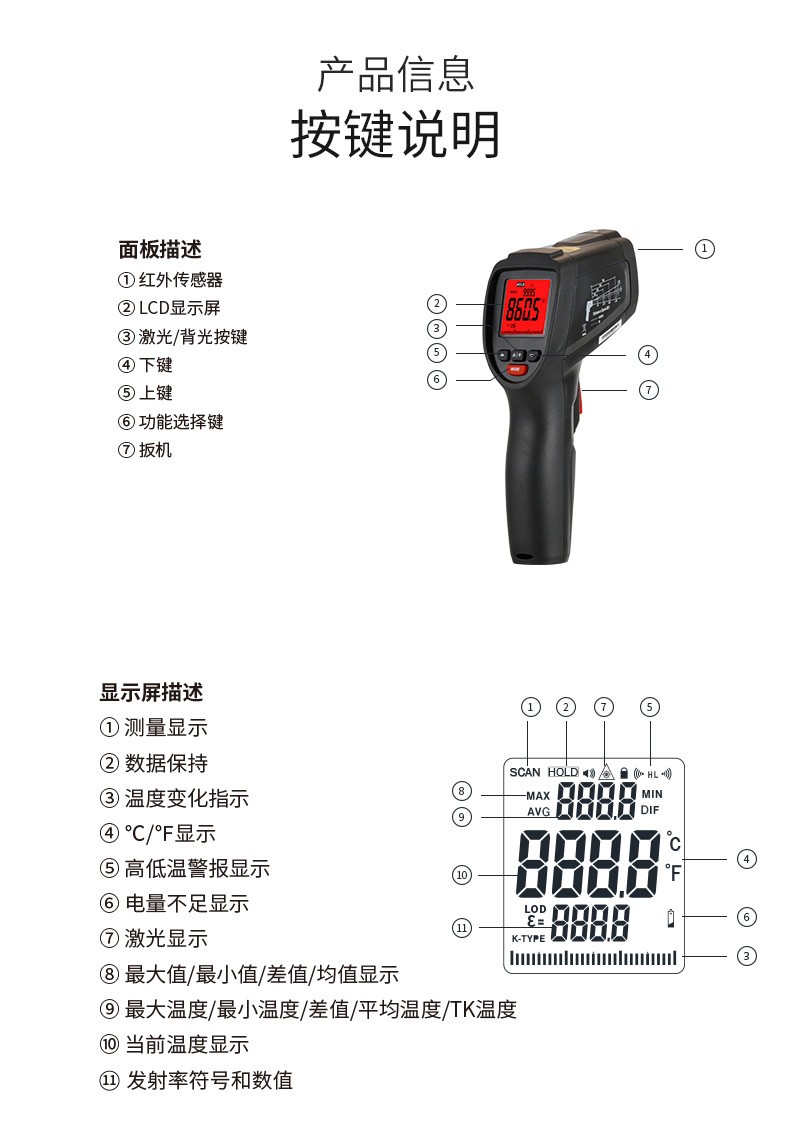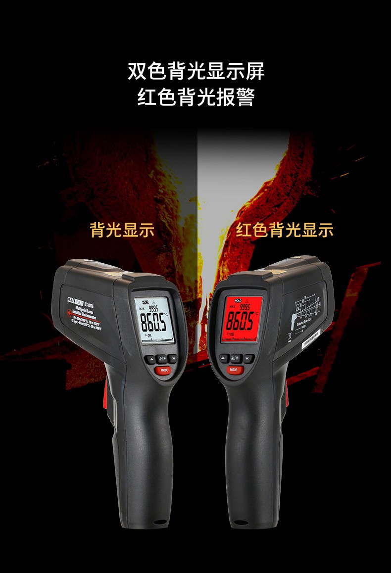 产品描述:华盛昌CEM DT-8876环形激光红外线测温仪量程-50℃~1000℃,距离比20:1,扫描被测物体,超过设定的高、低温度值会发出声光报警,便于快速找到冷热点,发现并解决问题。
