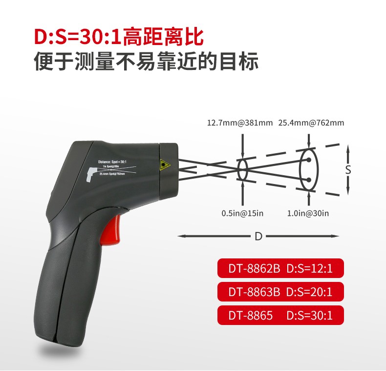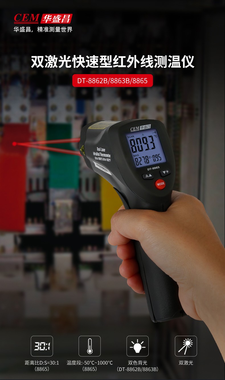产品描述:华盛昌CEM DT-8862B双激光快速型红外线测温仪量程-50°C to 650°C,分辨率0.1°C(1000°C),1°C(1000°C以上),距离比12:1,DT-8862B双激光快速型红外线测温仪内置双激光瞄准器,准确定位目标点。