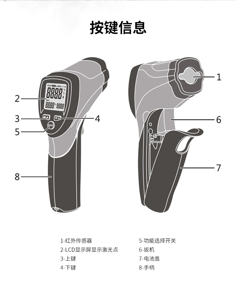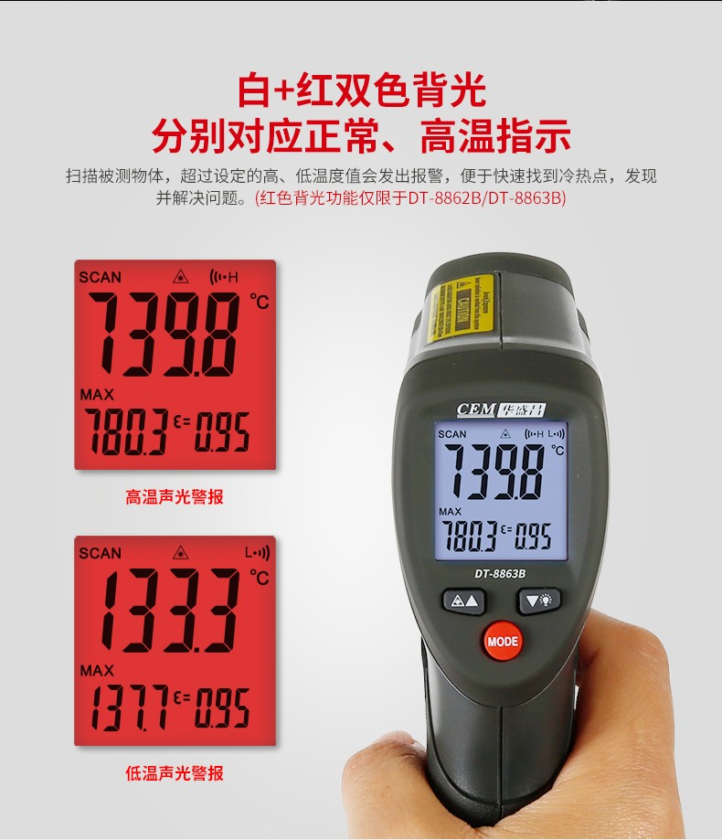 产品描述:华盛昌CEM DT-8863B双激光快速型红外线测温仪