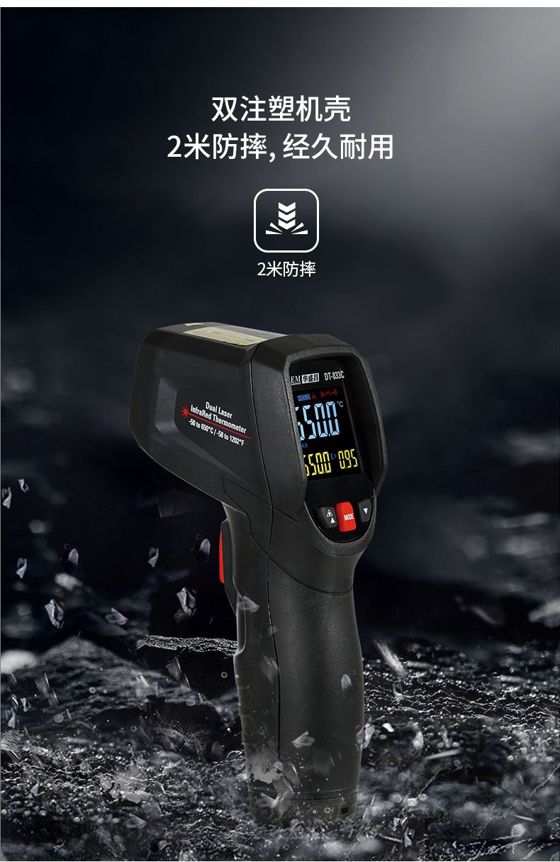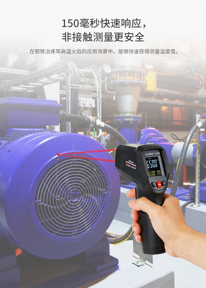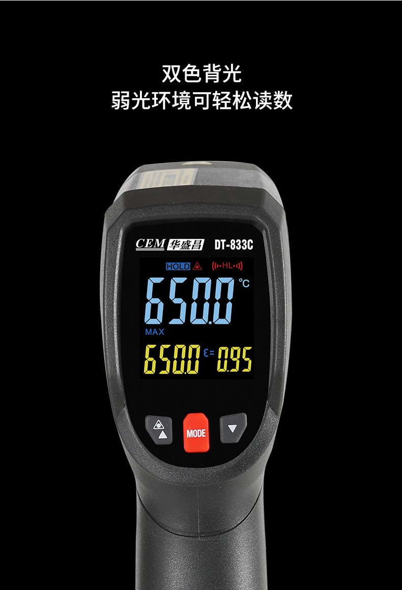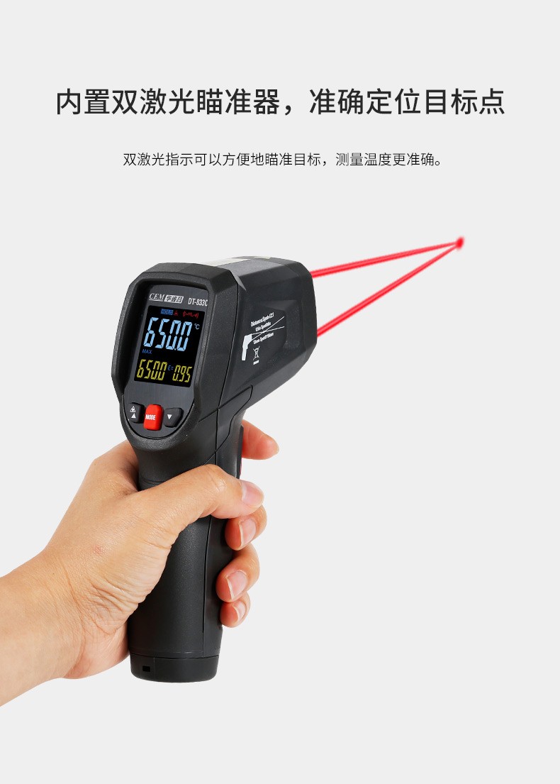 产品描述:华盛昌CEM DT-833C工业双激光红外测温仪红外温度-50°C至650°C,分辨率0.1°C (1000°C内),1°C (1000C以上),误差可达±1.0%,重复性±0.5%在钢铁冶炼等高温火焰的应用场景中,能够快速获得测量温度值。