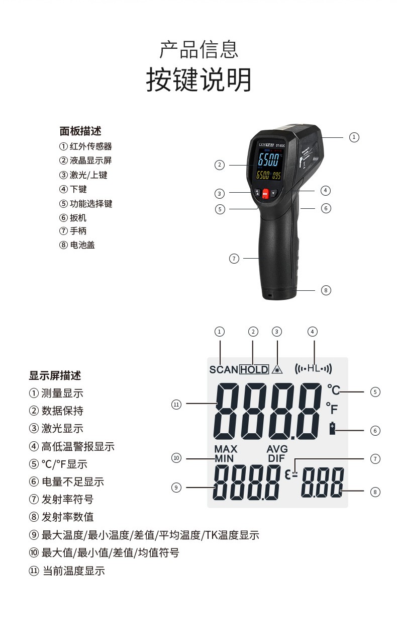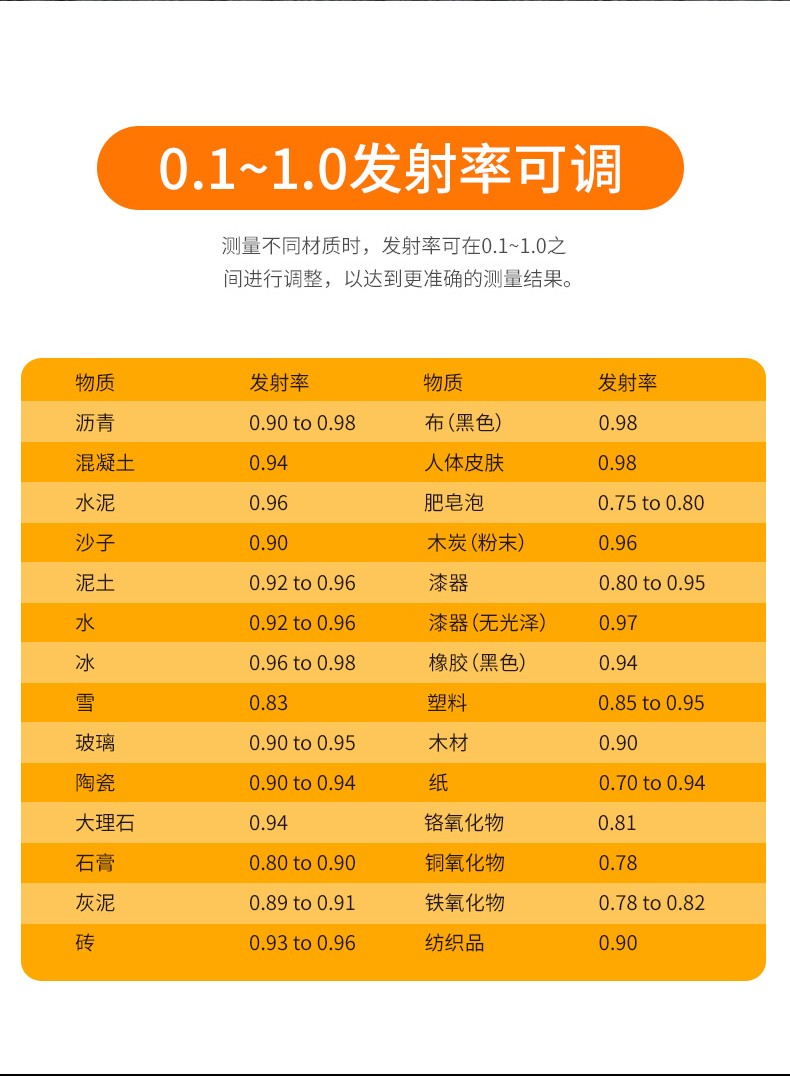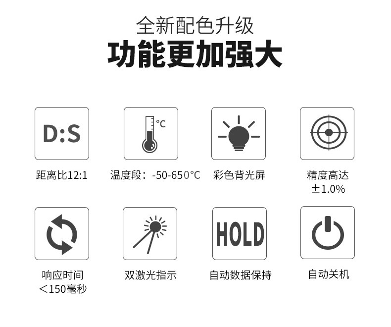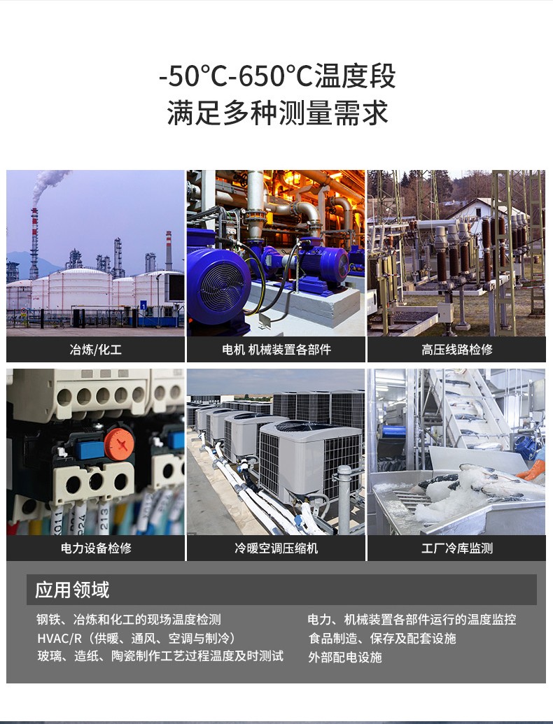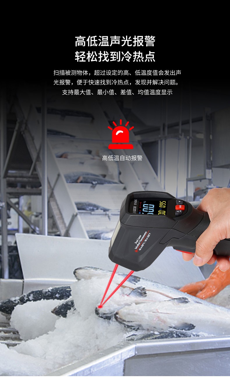 产品描述:华盛昌CEM DT-833C工业双激光红外测温仪红外温度-50°C至650°C,分辨率0.1°C (1000°C内),1°C (1000C以上),误差可达±1.0%,重复性±0.5%在钢铁冶炼等高温火焰的应用场景中,能够快速获得测量温度值。