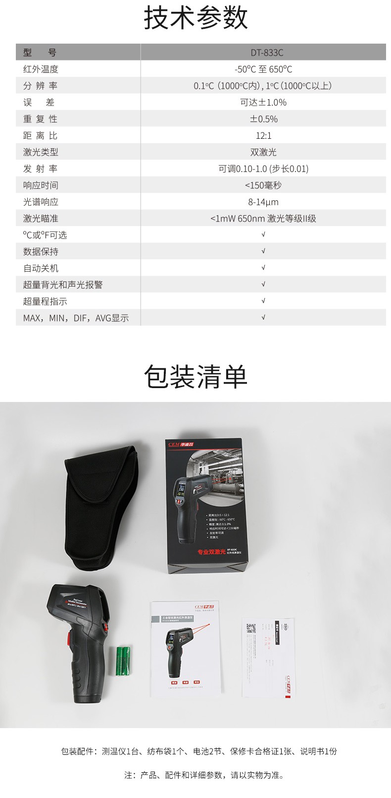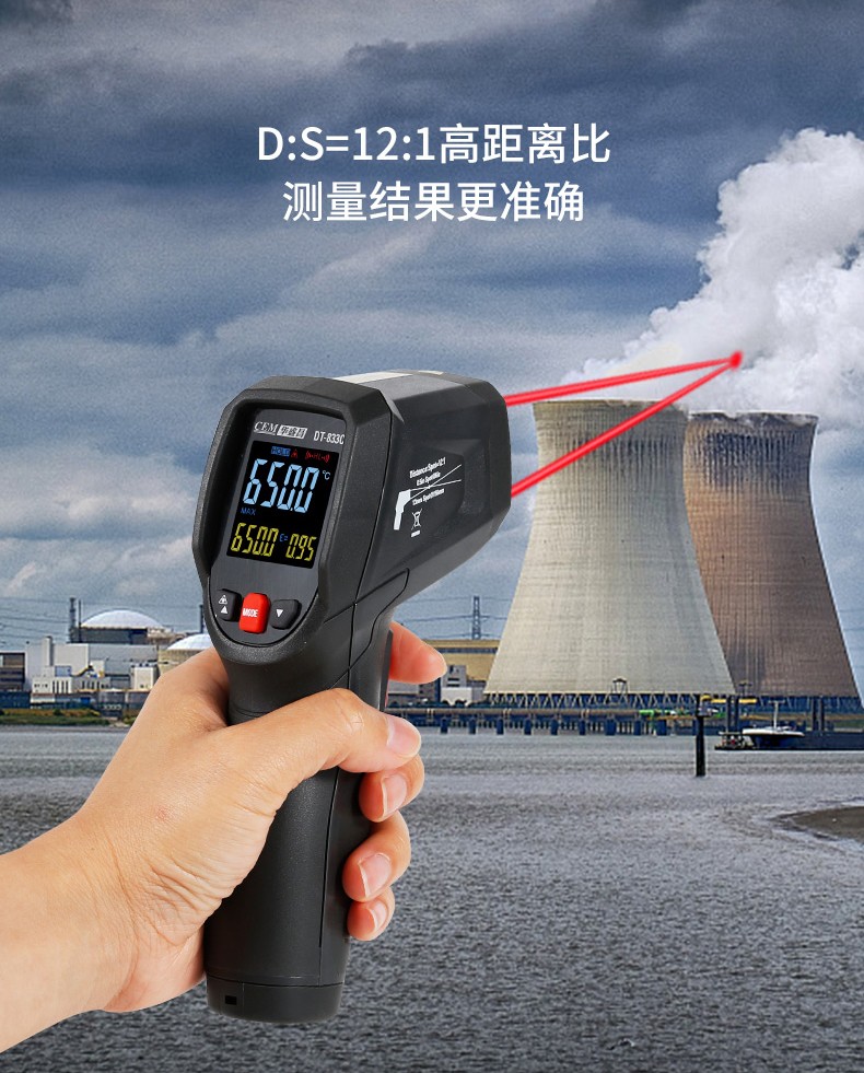 华盛昌CEM DT-833C工业双激光红外测温仪是一款性能出色的测温设备,具备广泛的测温范围从-50°C到650°C,可选0.1℃或1℃分辨率,精度高,误差可达±1.0%,重复性仅为±0.5%,物距比为12:1,配备双激光瞄准和可调发射率功能,响应迅速(<150毫秒),同时具备激光安全等级和声光报警等功能,提供可靠、准确的温度测量,适用于广泛的工业应用场景。