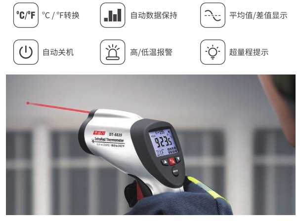华盛昌DT-8839红外线测温仪,具有中高温及中高距离比测量的特点, 红外测温量程-50°C至1000°C, 激 光指示可以方便地瞄准目标并准确地测量温度,大范围的测量温度量程可以适 用于更多的工业领域,是安全称心的非接触式测温工具。