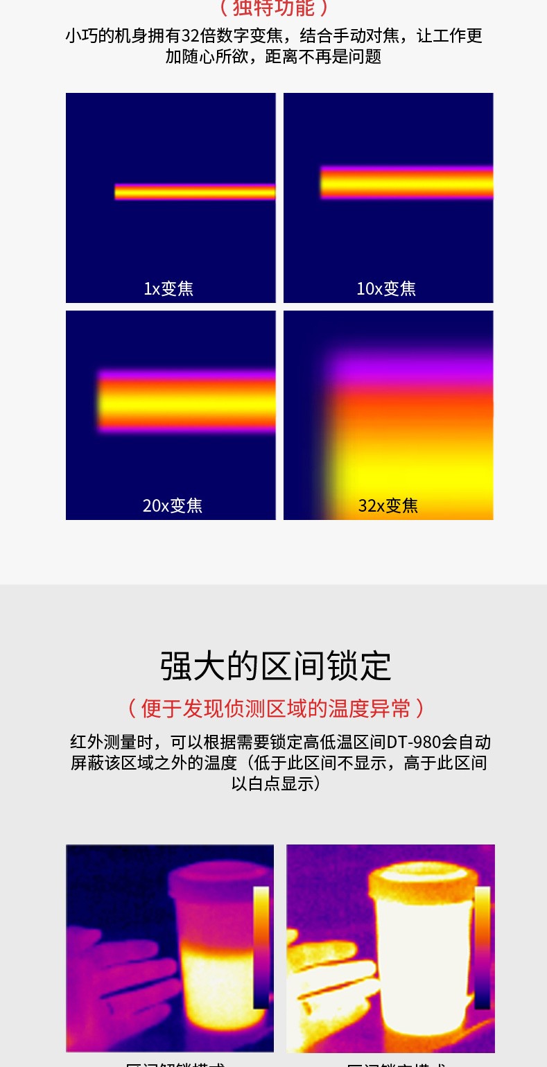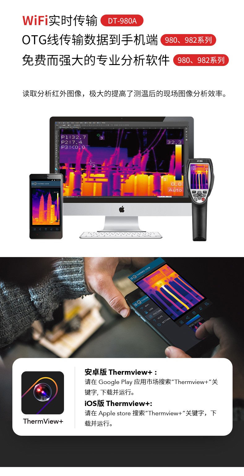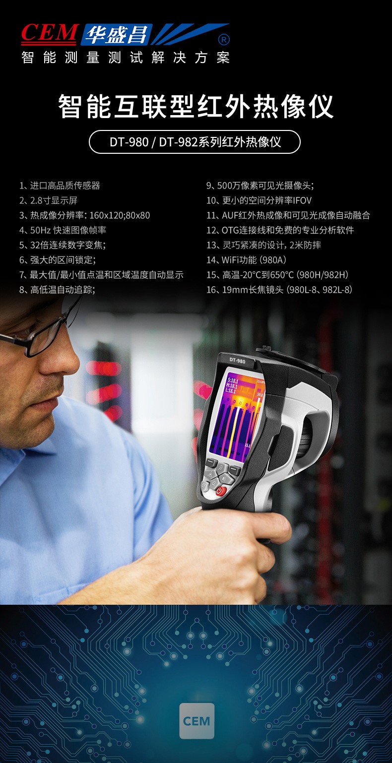华盛昌DT-982红外热像仪具有广泛的测量范围从-20°C到350°C,高分辨率120*160像素显示屏,手动对焦,支持1-32倍数字变焦,可同时显示红外图像和可见光图像,以及多种调色板选项。这款热像仪还具备视频录制功能,支持多种语言选择,存储容量大,包括电池在内的便携设计,适用于各种工业和科学应用,提供精确的热成像和数据记录功能。
