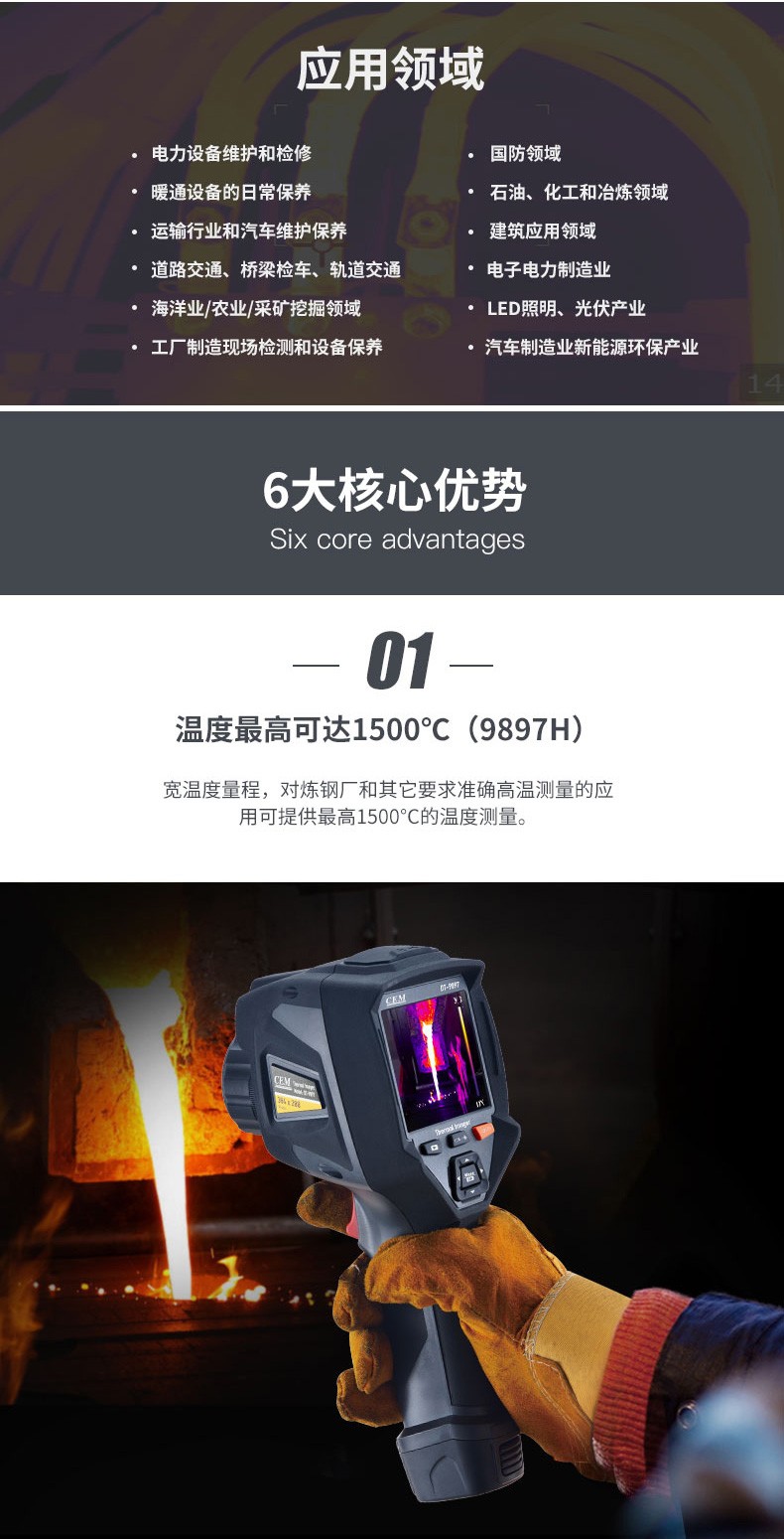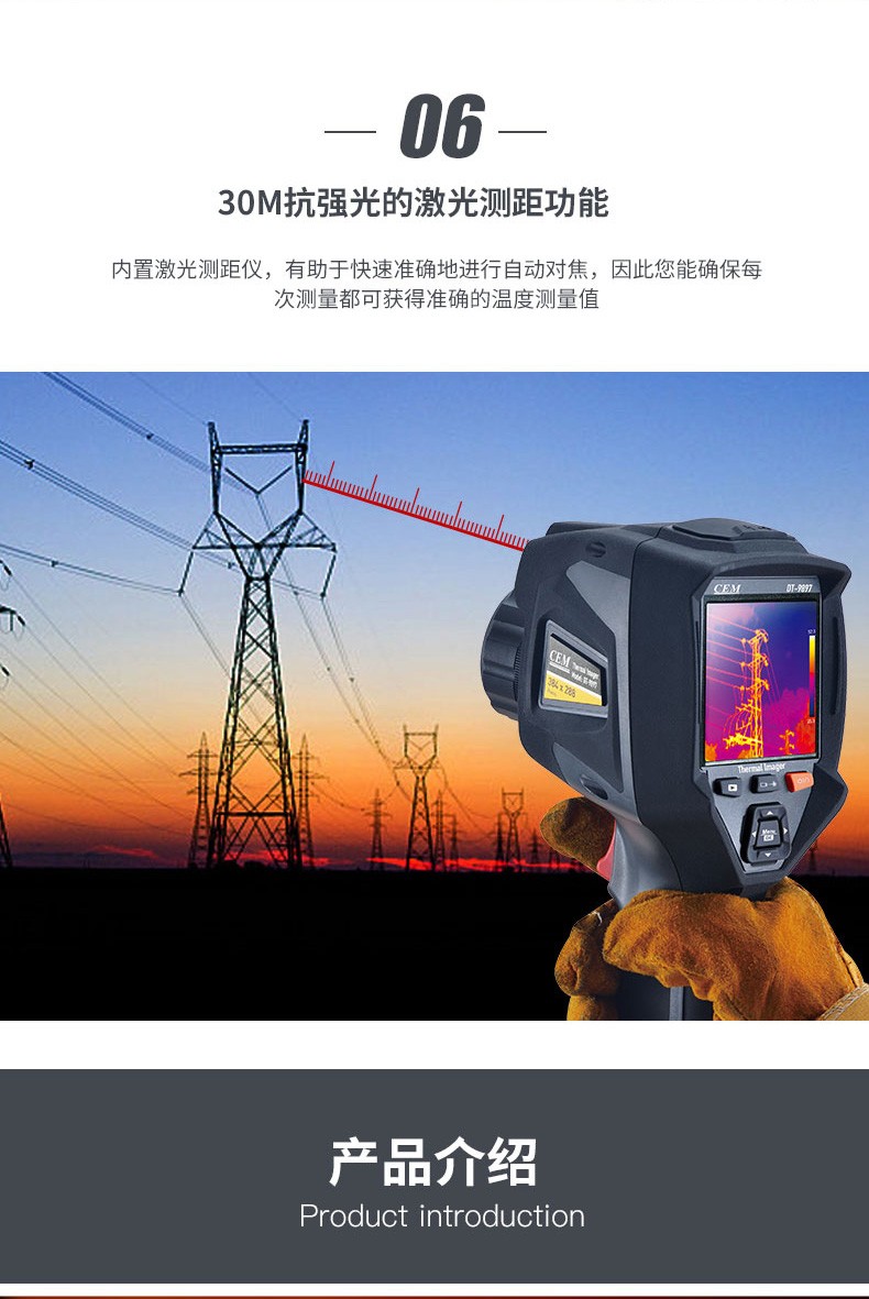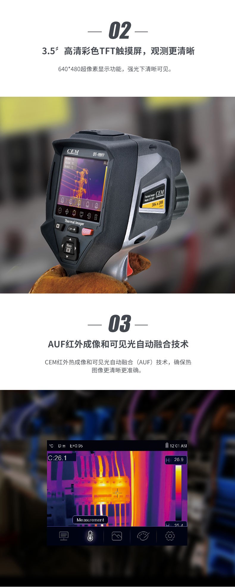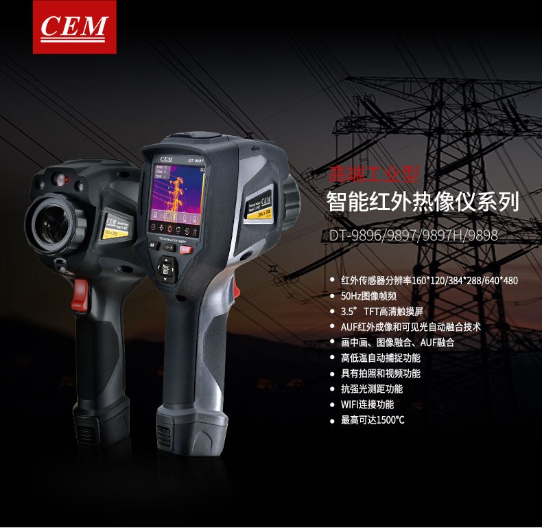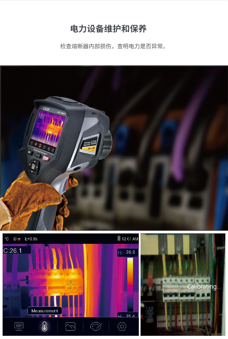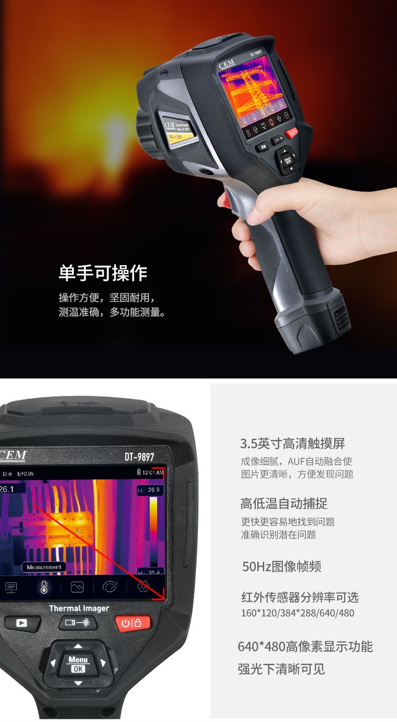 华盛昌CEM DT-9897高端工业型智能红外热像仪以其出色的性能和多功能设计脱颖而出。具备384x288分辨率、极高的热灵敏度、1-32倍数字变焦、以及多种测温和分析功能,包括高低温报警和激光测距。其大屏幕、图像融合、Wi-Fi传输和大容量存储使用户能够高效地进行工业级红外热成像和监测任务,而轻便的设计和长达四小时的电池寿命则增加了便携性和使用时间。