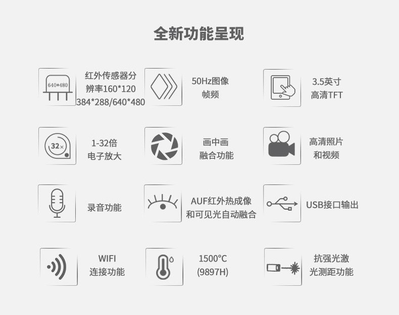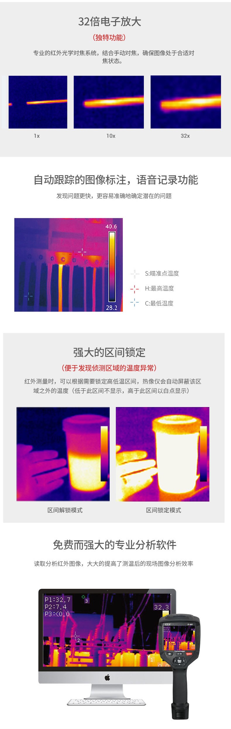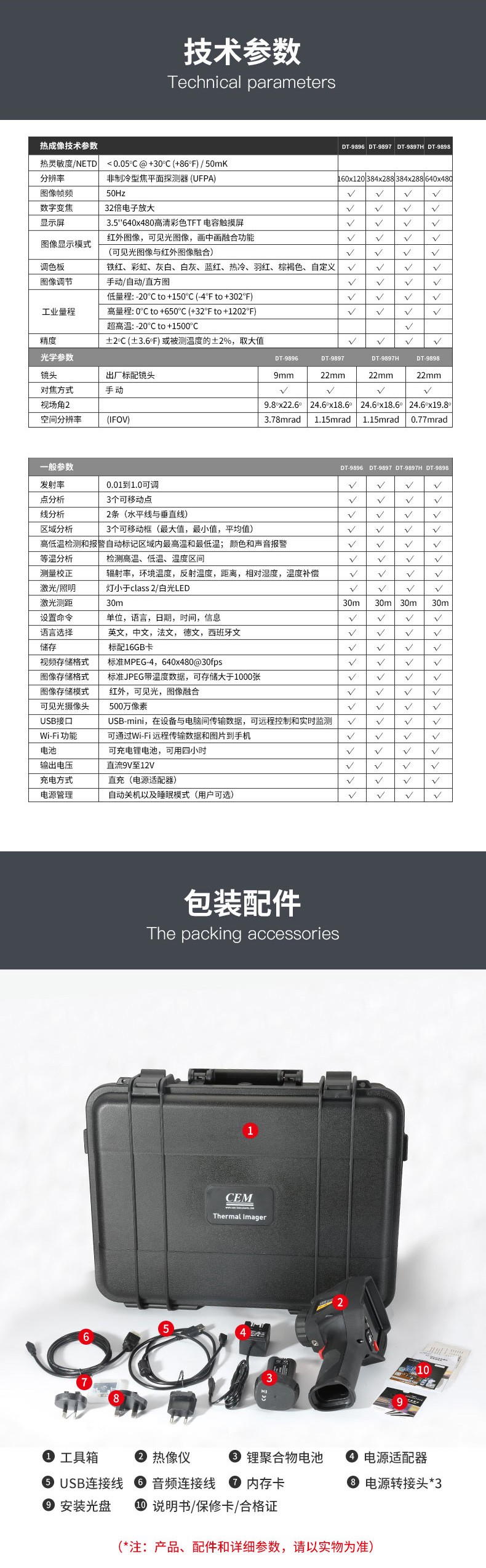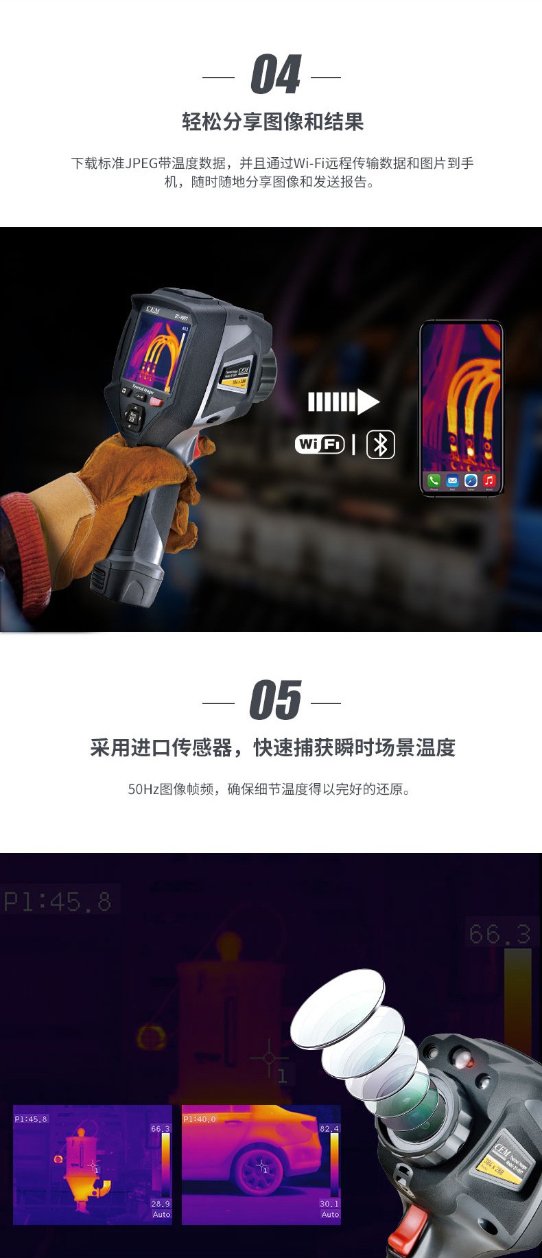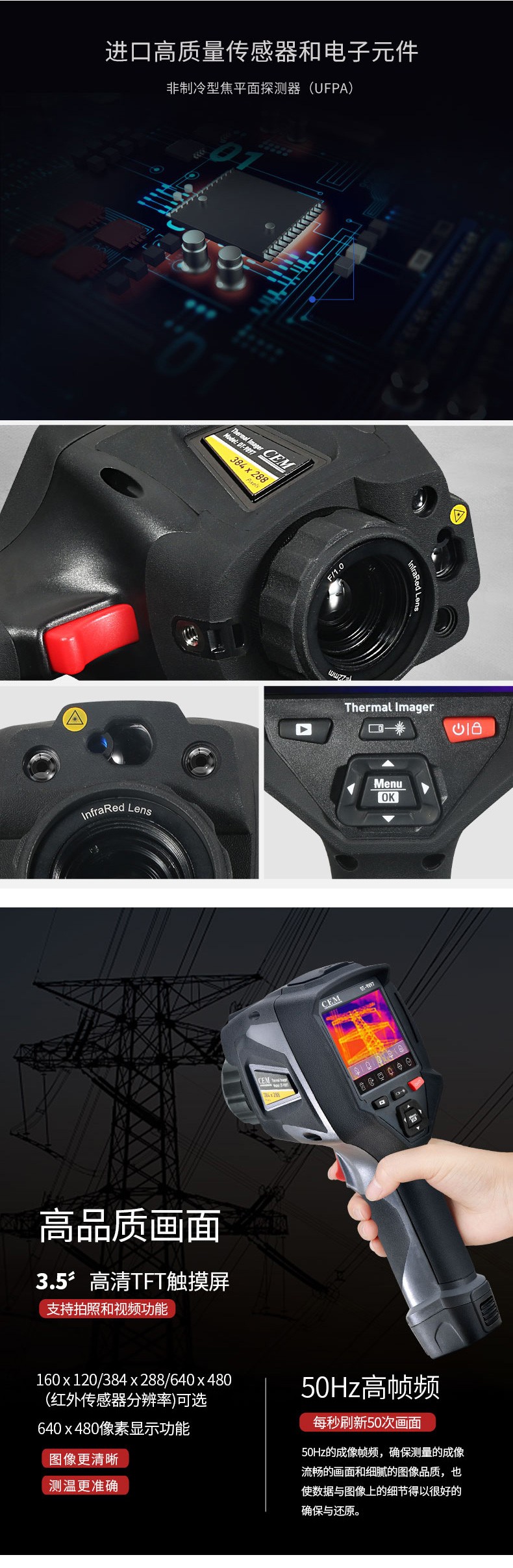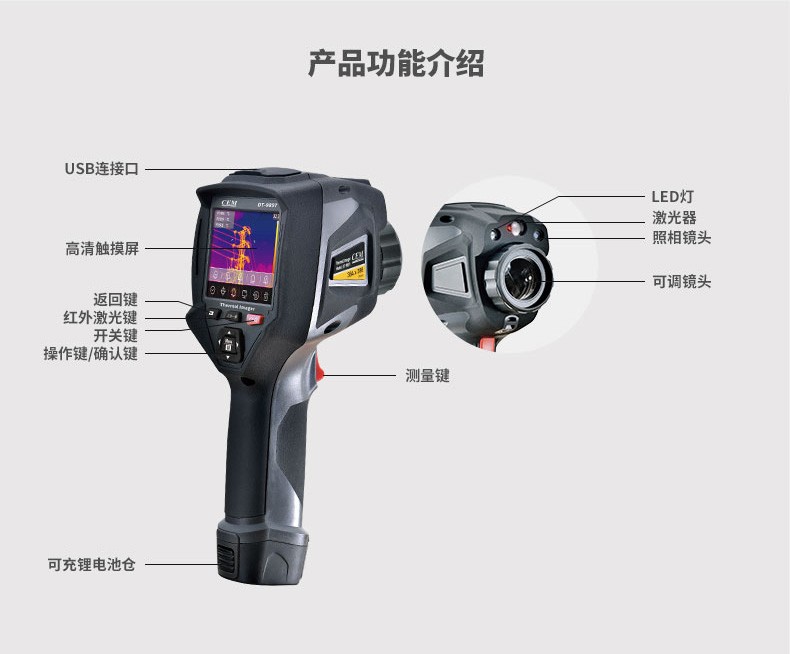 华盛昌CEM DT-9897高端工业型智能红外热像仪以其出色的性能和多功能设计脱颖而出。具备384x288分辨率、极高的热灵敏度、1-32倍数字变焦、以及多种测温和分析功能,包括高低温报警和激光测距。其大屏幕、图像融合、Wi-Fi传输和大容量存储使用户能够高效地进行工业级红外热成像和监测任务,而轻便的设计和长达四小时的电池寿命则增加了便携性和使用时间。