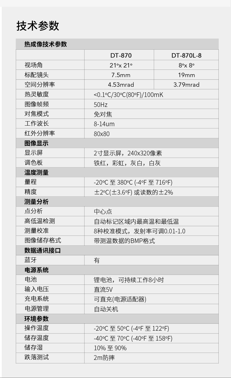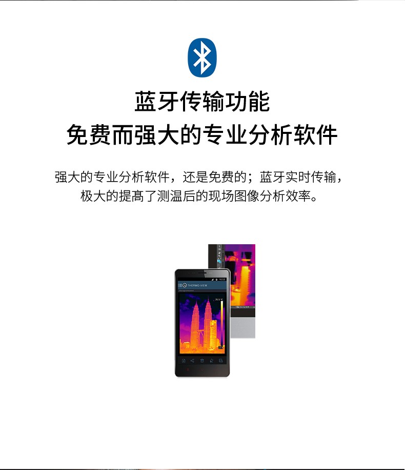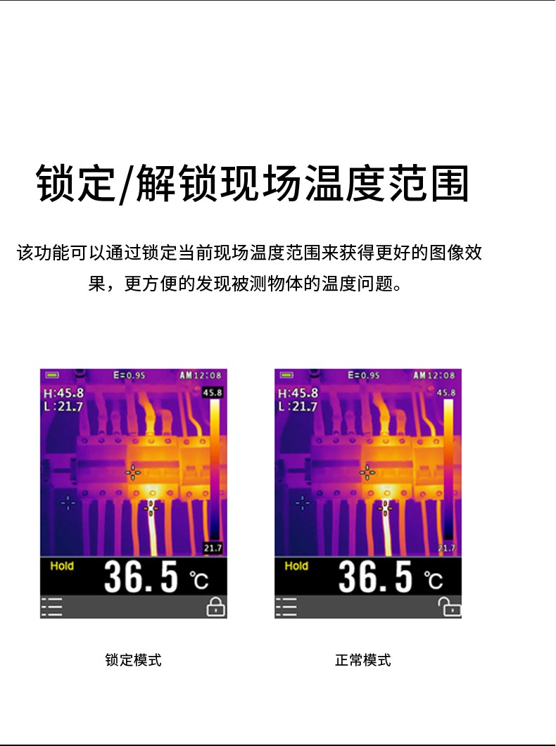 产品描述:视场角8°×8°,标配镜头19mm,空间分辨率3.79mrad,红外分辨率80*80像素,温范围-20~380℃,精确度±2℃,8种校准模式