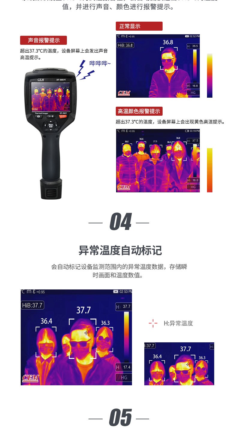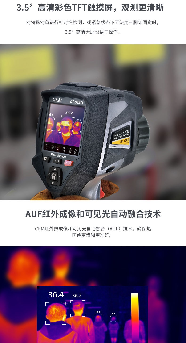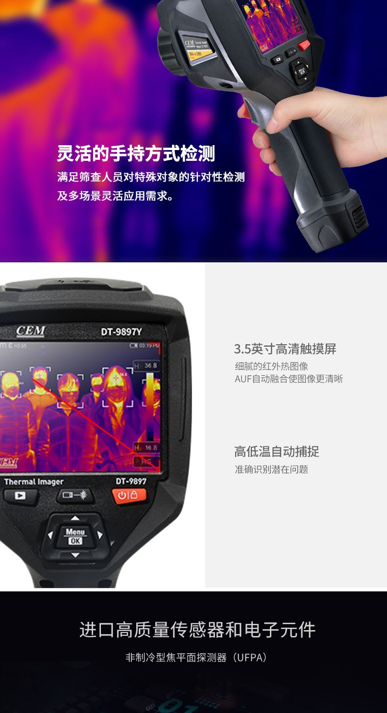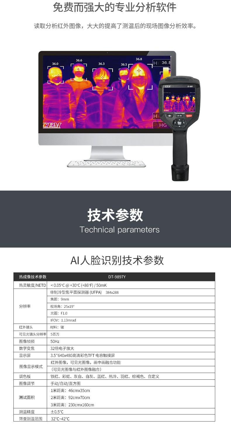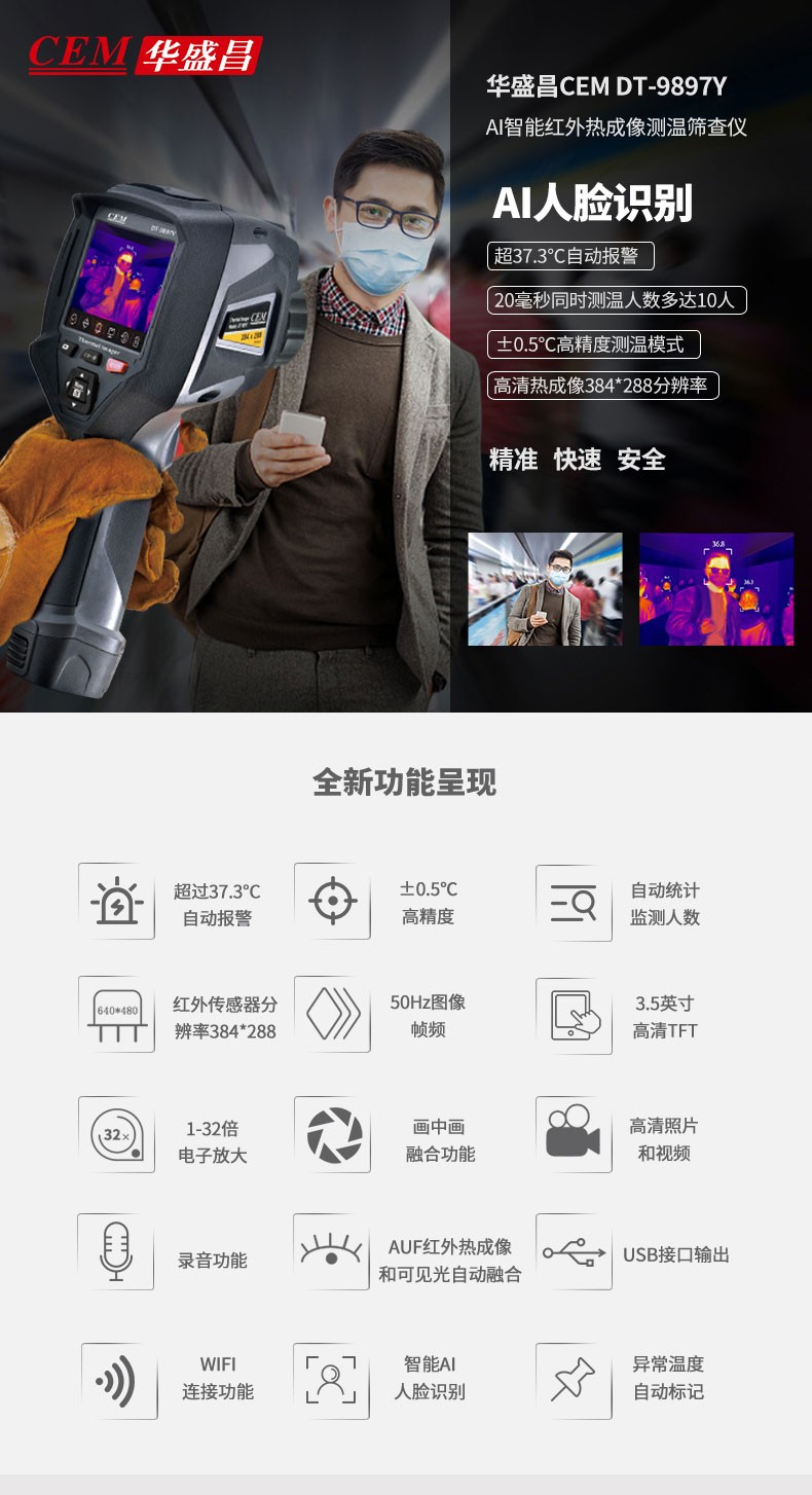 产品描述:华盛昌CEM DT-9897Y AI智能人脸识别温度筛查热像仪进口焦平面传感器分辨率384x288,红外镜头焦距:9mm视场角:25x19°;光圈: F1.0;IFOV:1.13mrad;材料:锗,可设置37.3℃高温报警值。