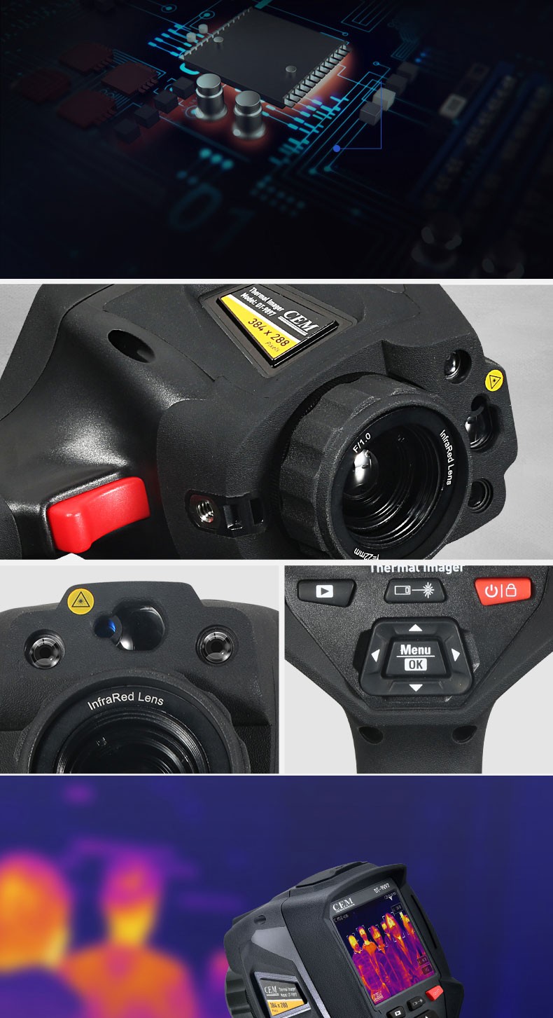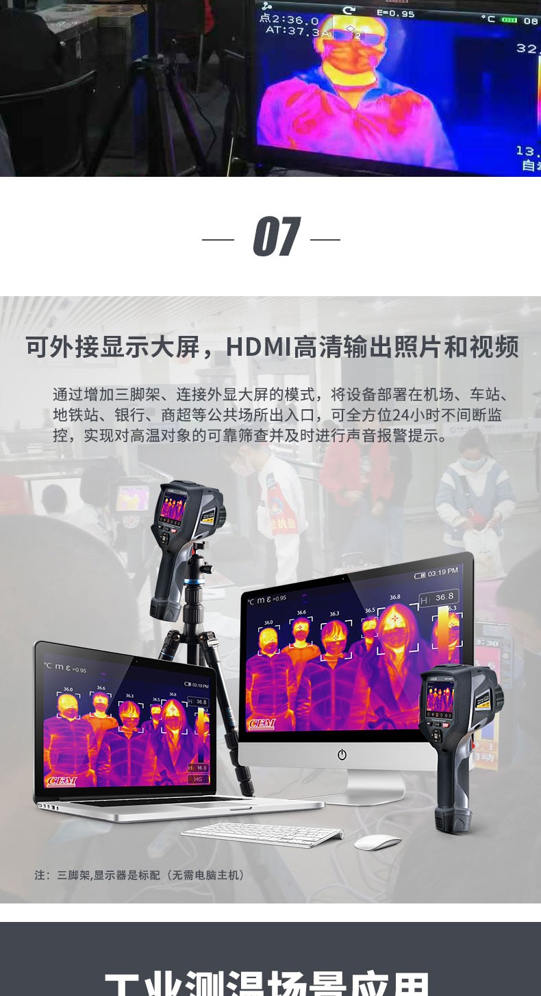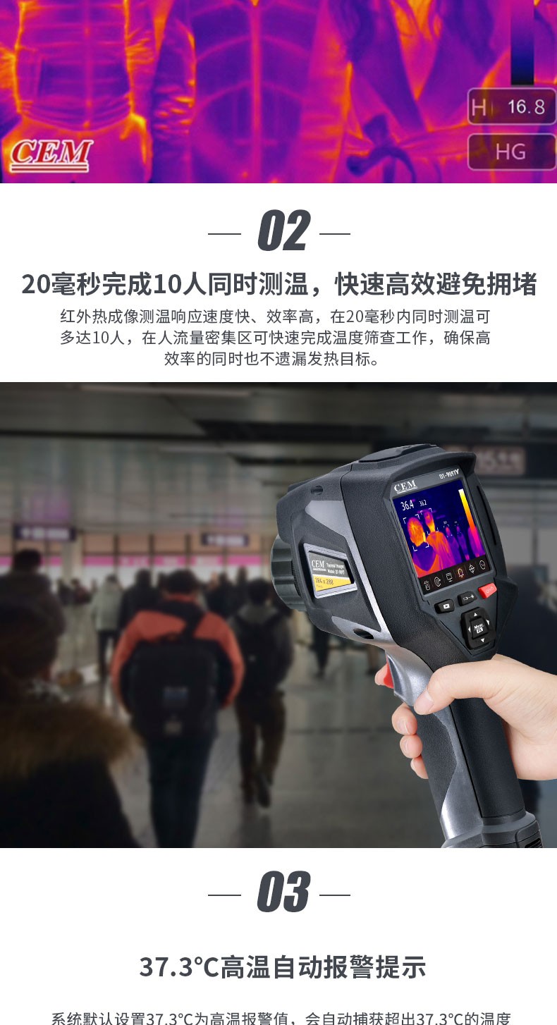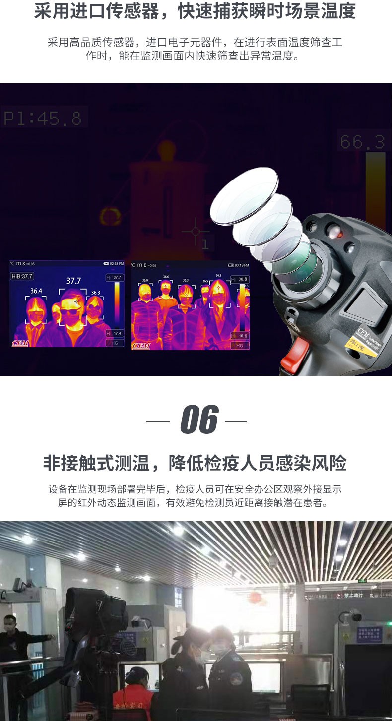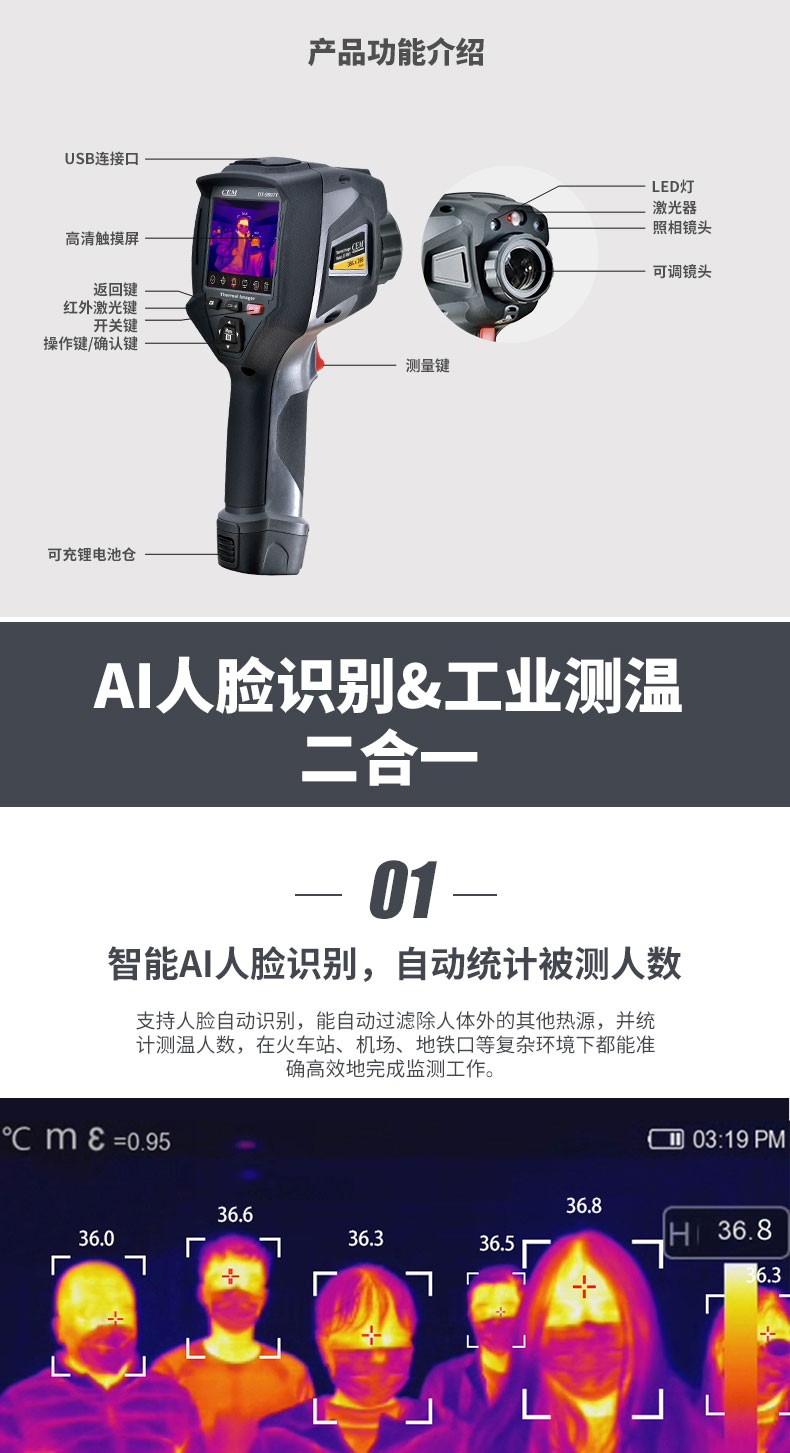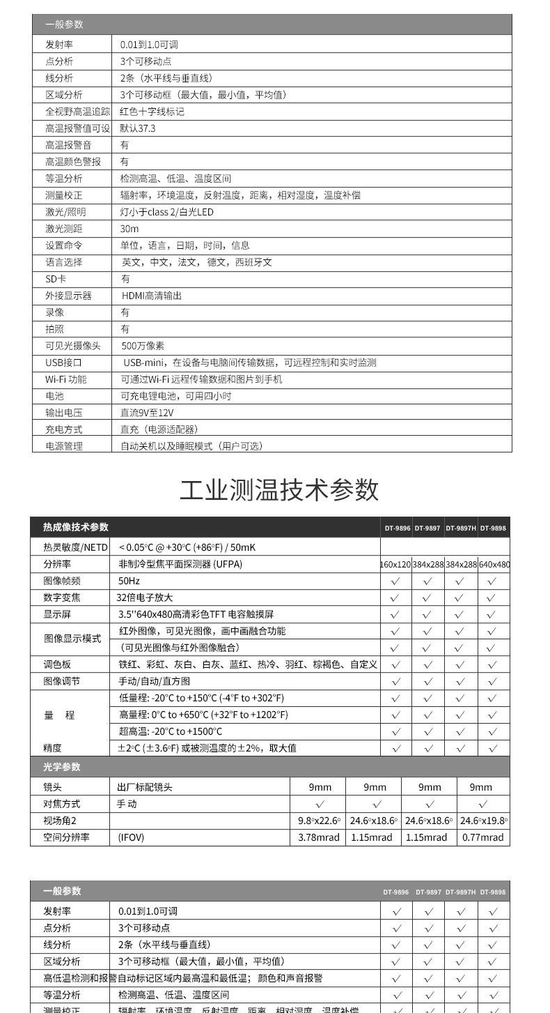 产品描述:华盛昌CEM DT-9897Y AI智能人脸识别温度筛查热像仪进口焦平面传感器分辨率384x288,红外镜头焦距:9mm视场角:25x19°;光圈: F1.0;IFOV:1.13mrad;材料:锗,可设置37.3℃高温报警值。