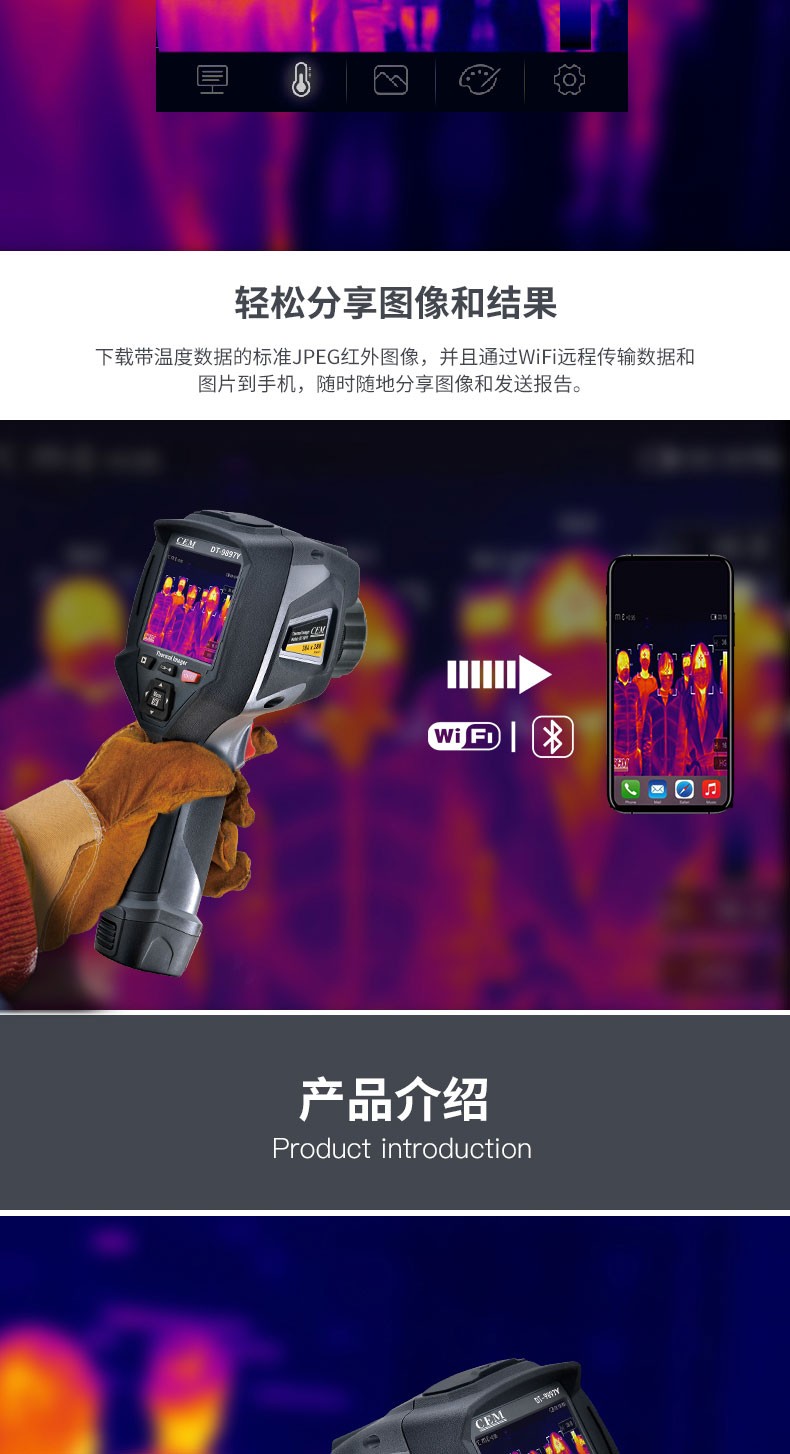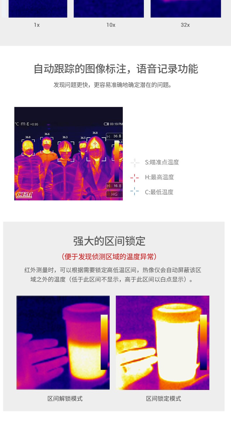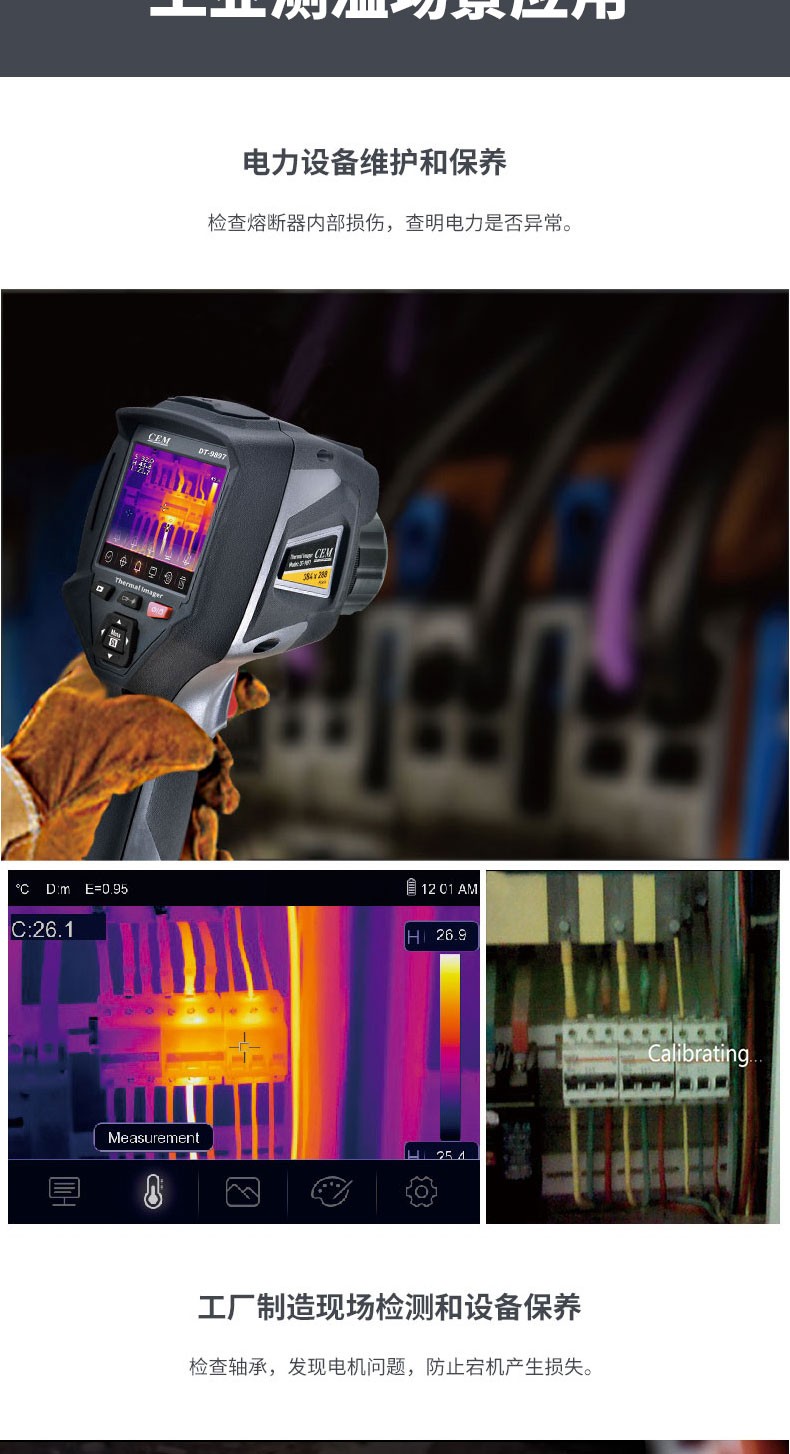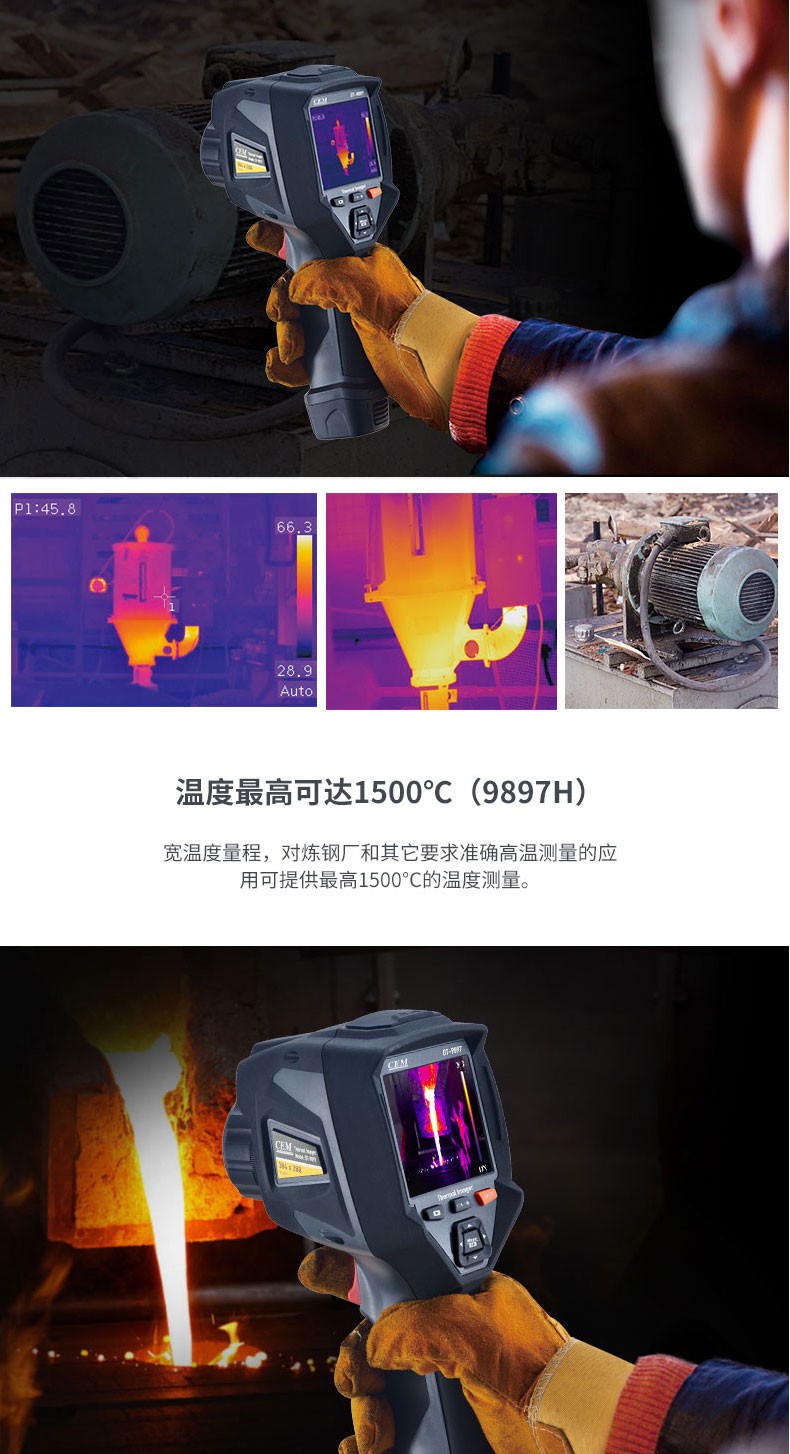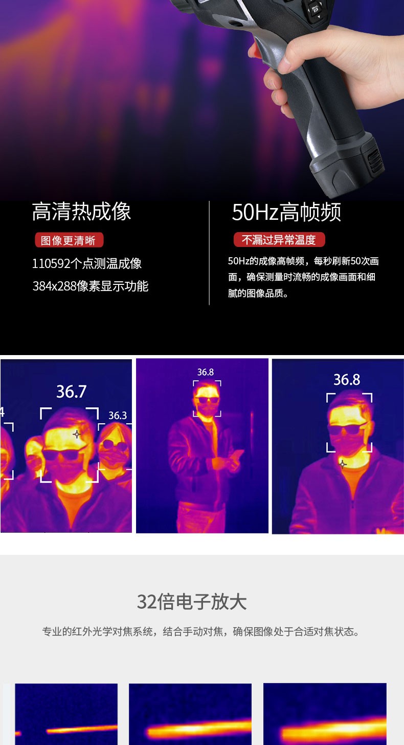 产品描述:华盛昌CEM DT-9897Y AI智能人脸识别温度筛查热像仪进口焦平面传感器分辨率384x288,红外镜头焦距:9mm视场角:25x19°;光圈: F1.0;IFOV:1.13mrad;材料:锗,可设置37.3℃高温报警值。