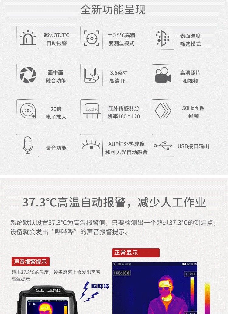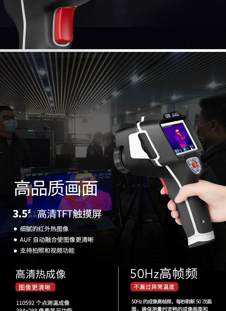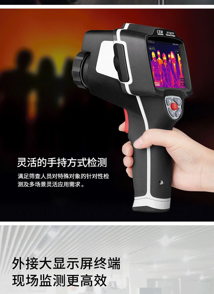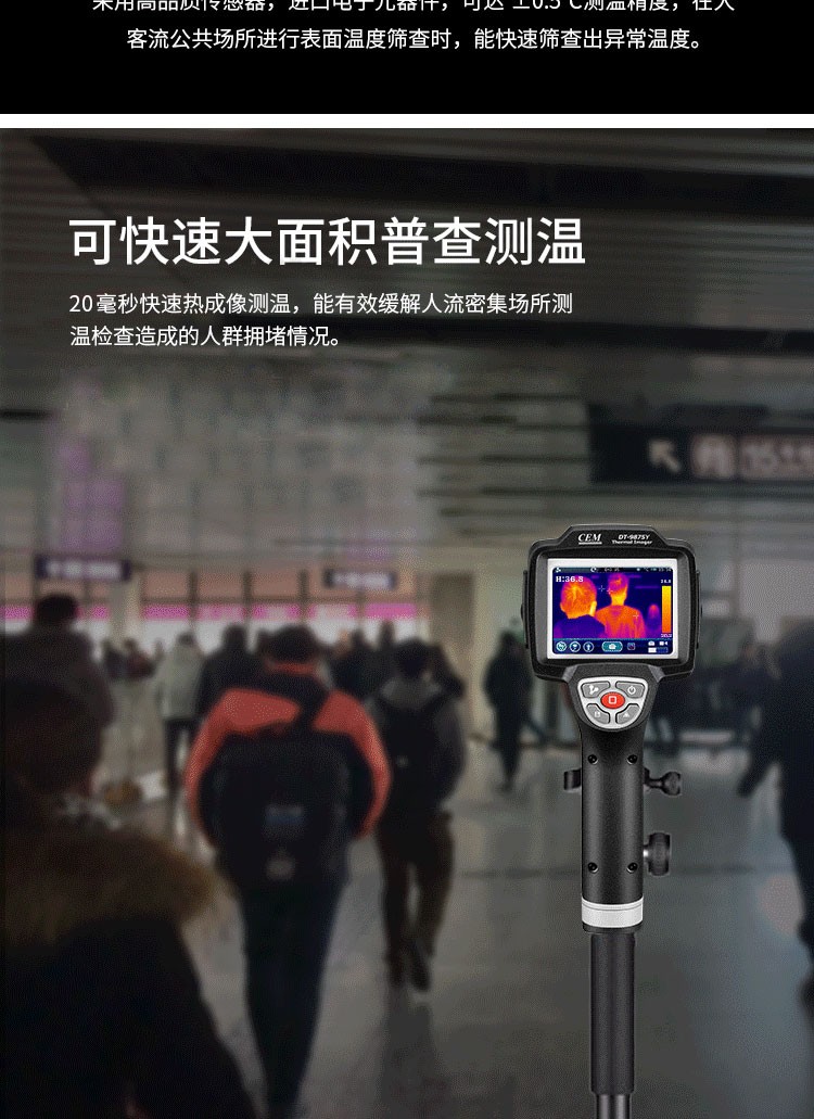 产品描述:华盛昌CEM DT-9875Y表面温度快速筛查热像仪进口焦平面传感器分辨率160x120,红外镜头焦距:7.5mm;视场角:29.8x22.6°;光圈: F1.0;IFOV:3.33mrad;材料:锗,可实现远距离、快速、大面积、大客流的温度测温。