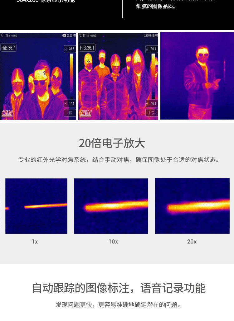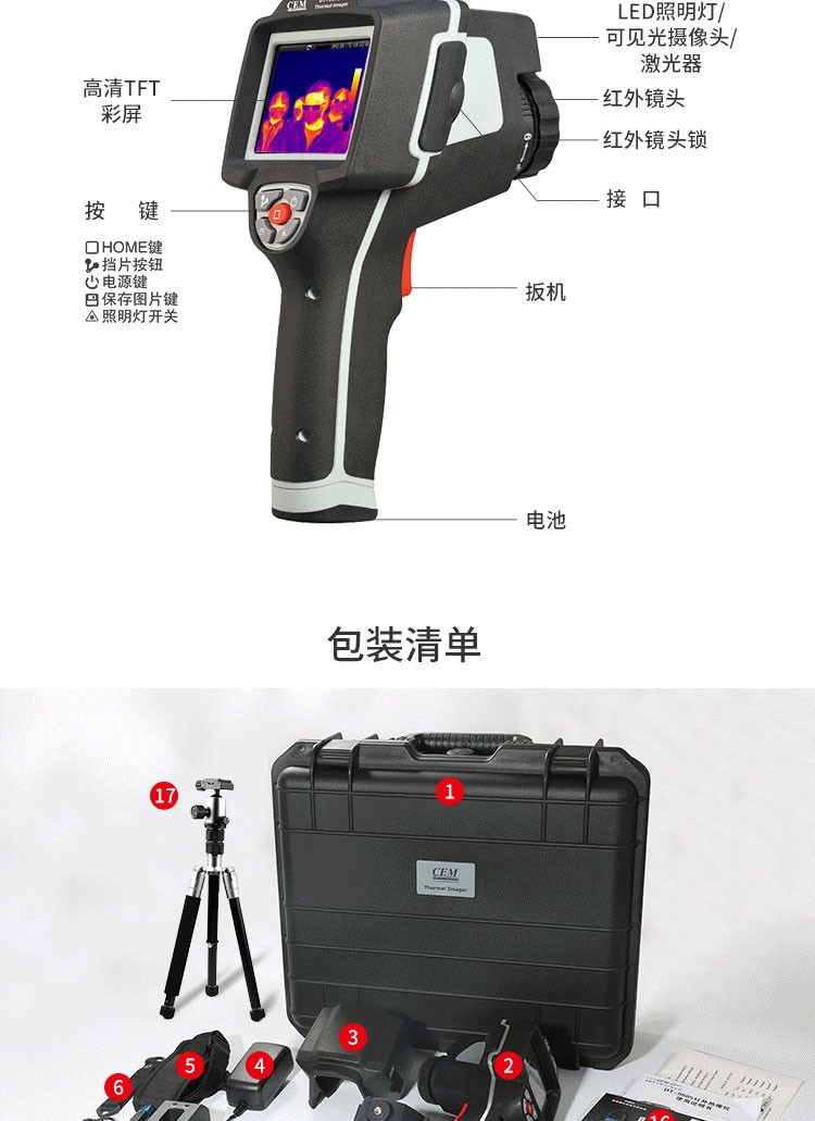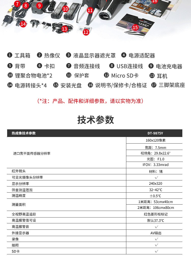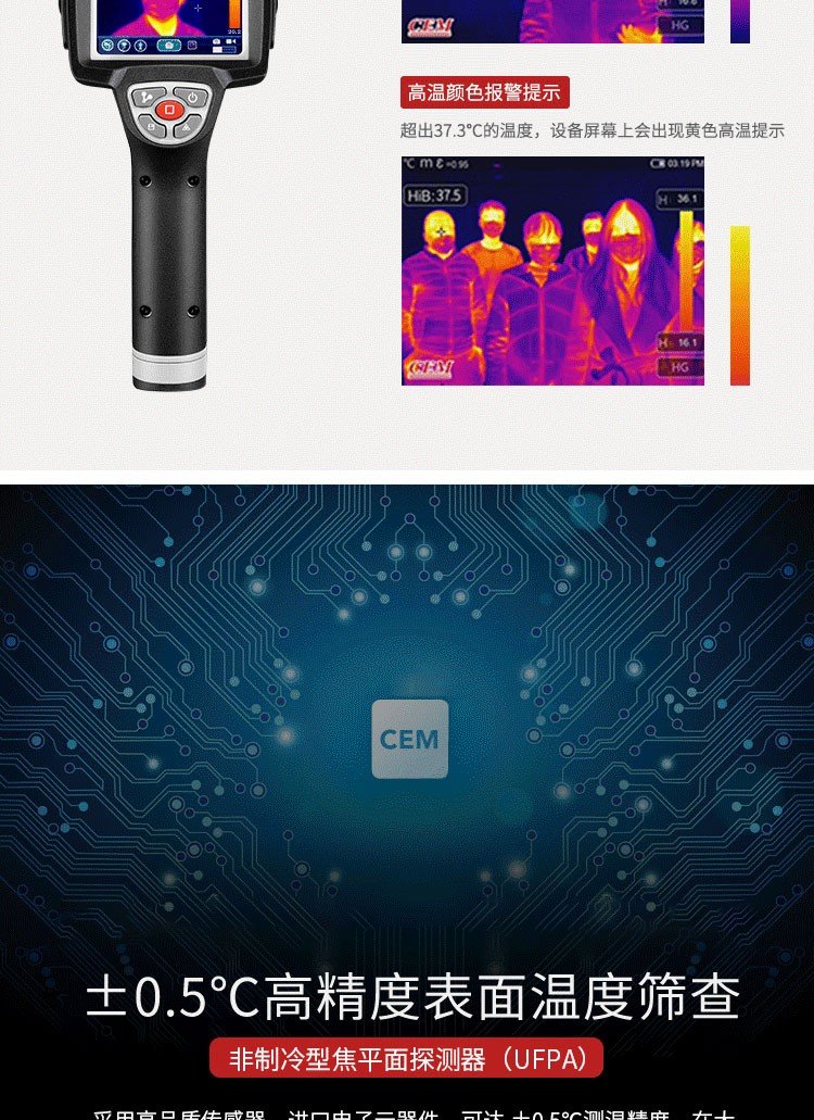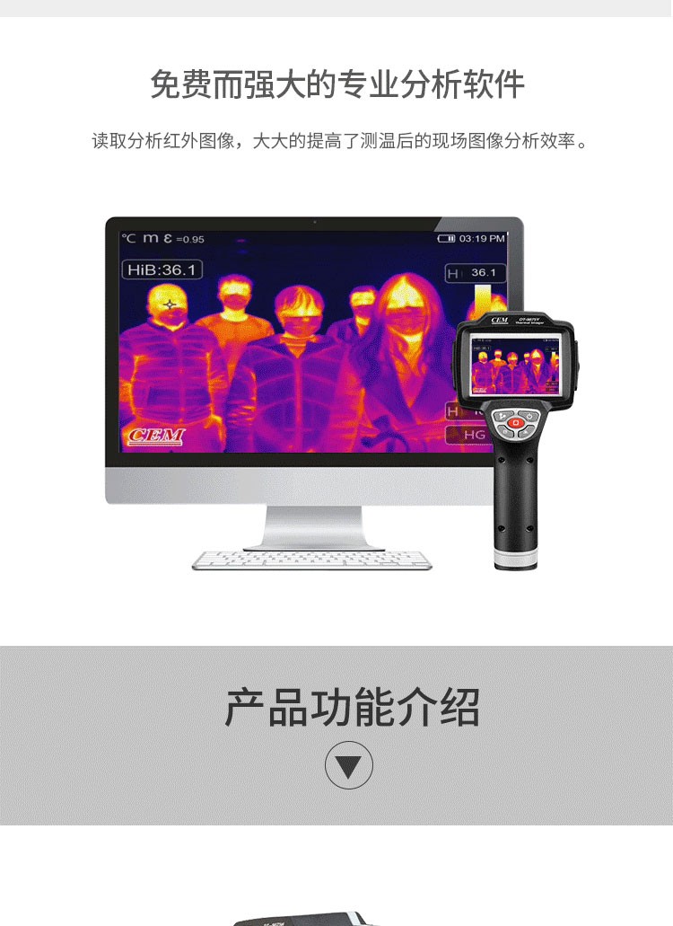 产品描述:华盛昌CEM DT-9875Y表面温度快速筛查热像仪进口焦平面传感器分辨率160x120,红外镜头焦距:7.5mm;视场角:29.8x22.6°;光圈: F1.0;IFOV:3.33mrad;材料:锗,可实现远距离、快速、大面积、大客流的温度测温。