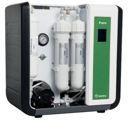 通过使用高回收反渗透(RO)技术, Puro可以有效的去 除供给水(这里指自来水)中99%的污染物,产出的纯水 我们称之为初级水(皿级水)。 Puro可直接为实验室内的玻璃器皿清洗机以及其他实 验室设备提供纯水。