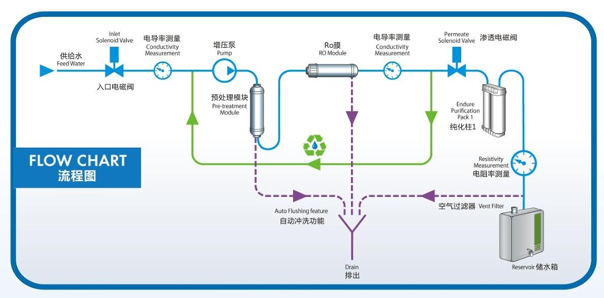 更少的消耗品更换意味着更多地节省。在RO纯化过程中,不符合要求的水并未流入下一个纯化环节,而是重新回流至RO步骤中继续反渗透,只有达到标准的水才能进入DI环节进行去离子纯化。