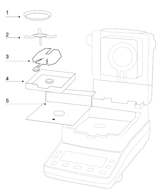 1.铝制秤盘;2.三角秤架;3.秤盘托架;4.防风罩;5.不锈钢托板
