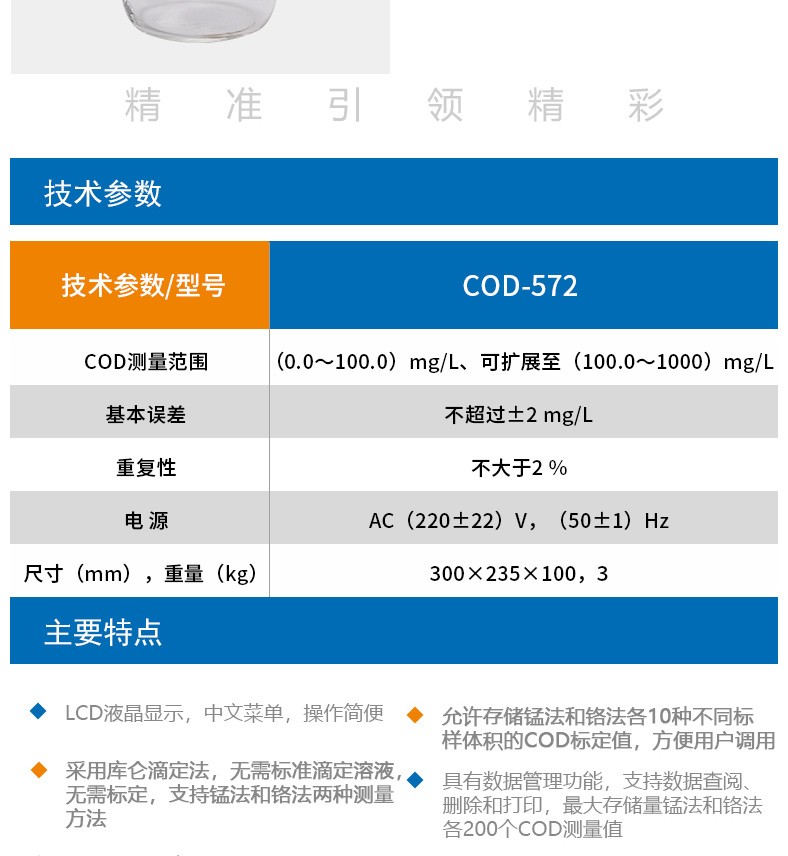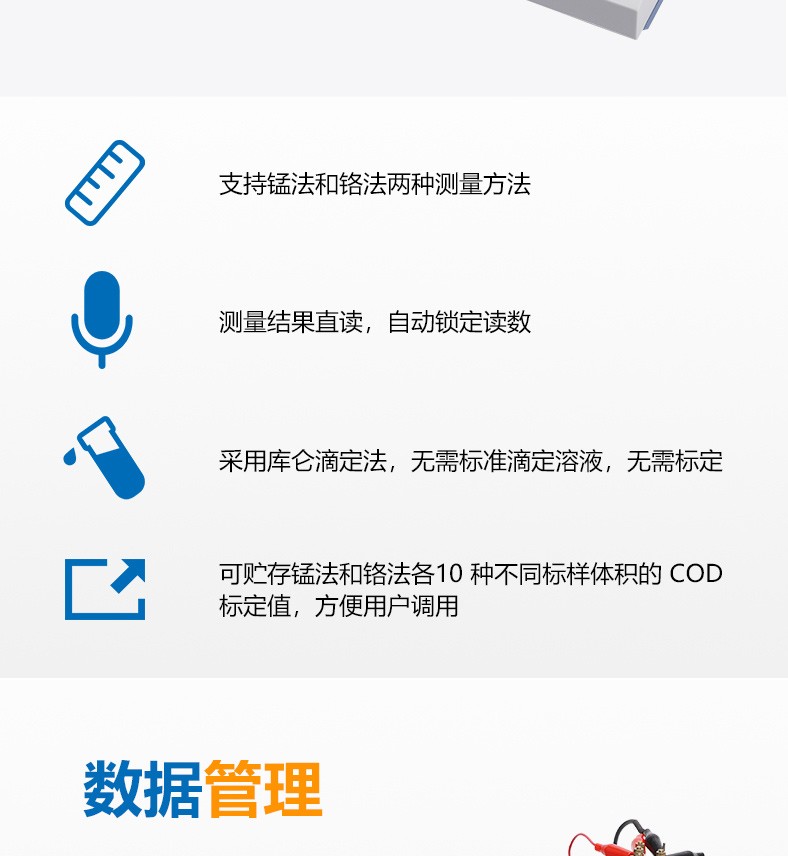 COD-572型化学需氧量测定仪是采用库仑滴定的方法进行测量。不仅可以测定CODCr,也可以测定CODMn(也称高锰酸盐指数)。基于库仑滴定法进行测定,操作简便、快速,试剂用量少。适合COD含量较低的地表水样品中CODCr的测定,以及自来水等样品中CODMn的测定。