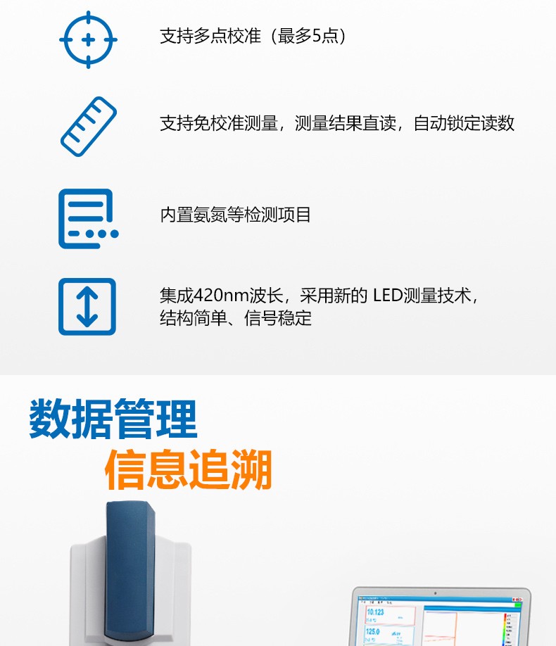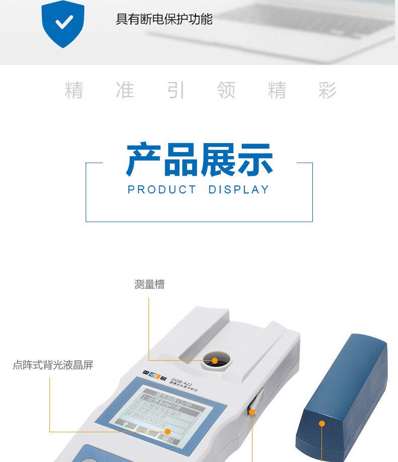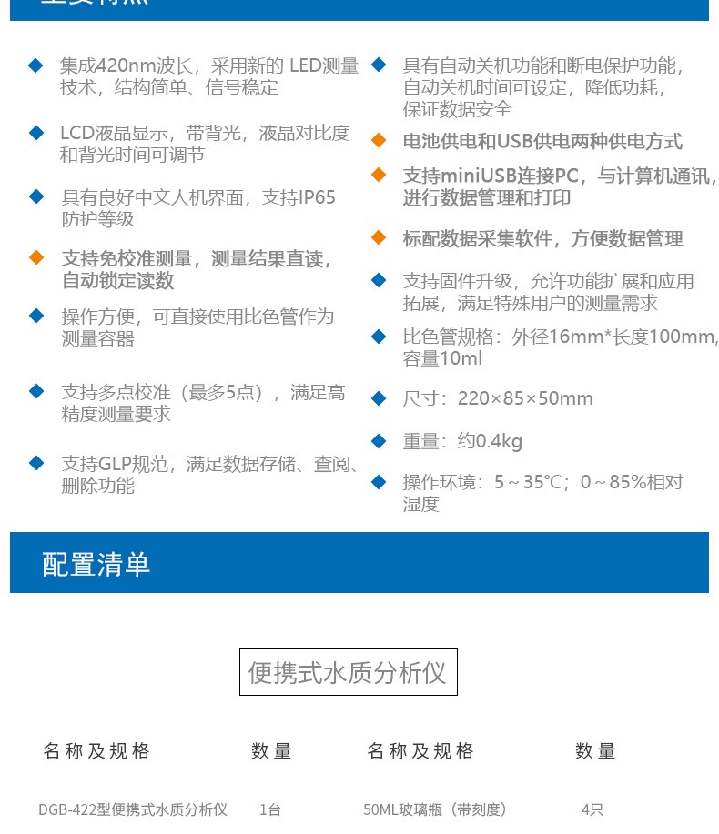 DGB-422光电比色法水质分析仪采用新的LED测试技术,集成特定吸收峰波长的 LED光源,标准曲线内置,直接使用比色管作为测量的容器,体积小巧,方便用户操作和携带。该系列产品可进行水硬度、尿素参数的测量(本系列仪器可拓展定制氨氮、总磷、高锰酸盐指数、铝、总硬度、余氯、总氯、二氧化氯、尿素等项目参数),适用于地表水、工业废水、**废水、污水再生的景观用水、生活饮用水、游泳池水等水质的现场测定或者实验室分析。