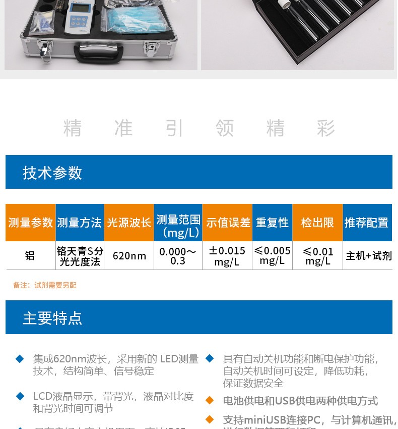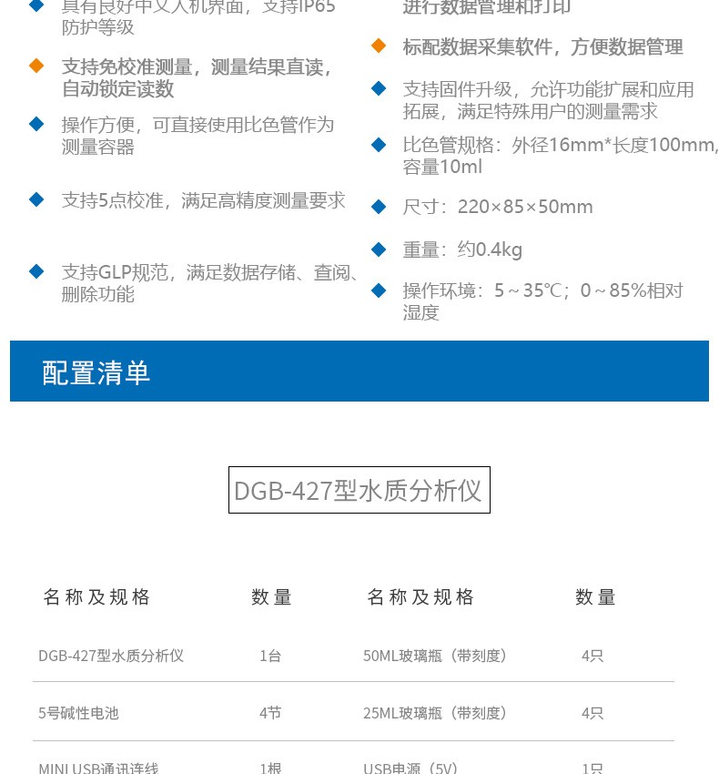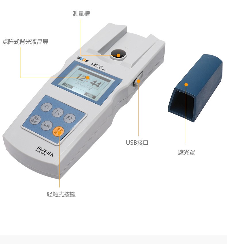 DGB-427光电比色法水质分析仪采用新的LED测试技术,集成特定吸收峰波长的 LED光源,标准曲线内置,直接使用比色管作为测量的容器,体积小巧,方便用户操作和携带。该系列产品可进行铝指数的测量(本系列仪器可拓展定制氨氮、总磷、高锰酸盐指数、铝、总硬度、余氯、总氯、二氧化氯、尿素等项目参数),适用于地表水、工业废水、**废水、污水再生的景观用水、生活饮用水、游泳池水等水质的现场测定或者实验室分析。