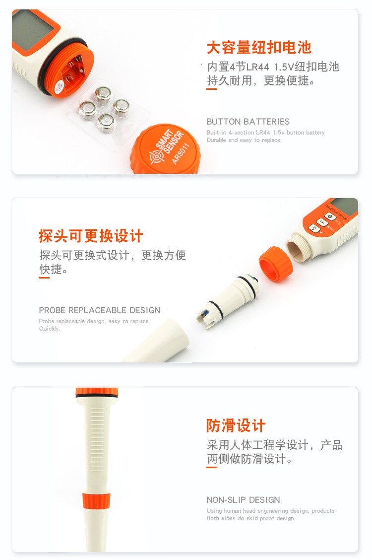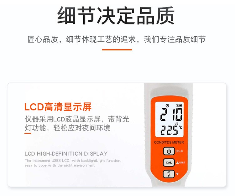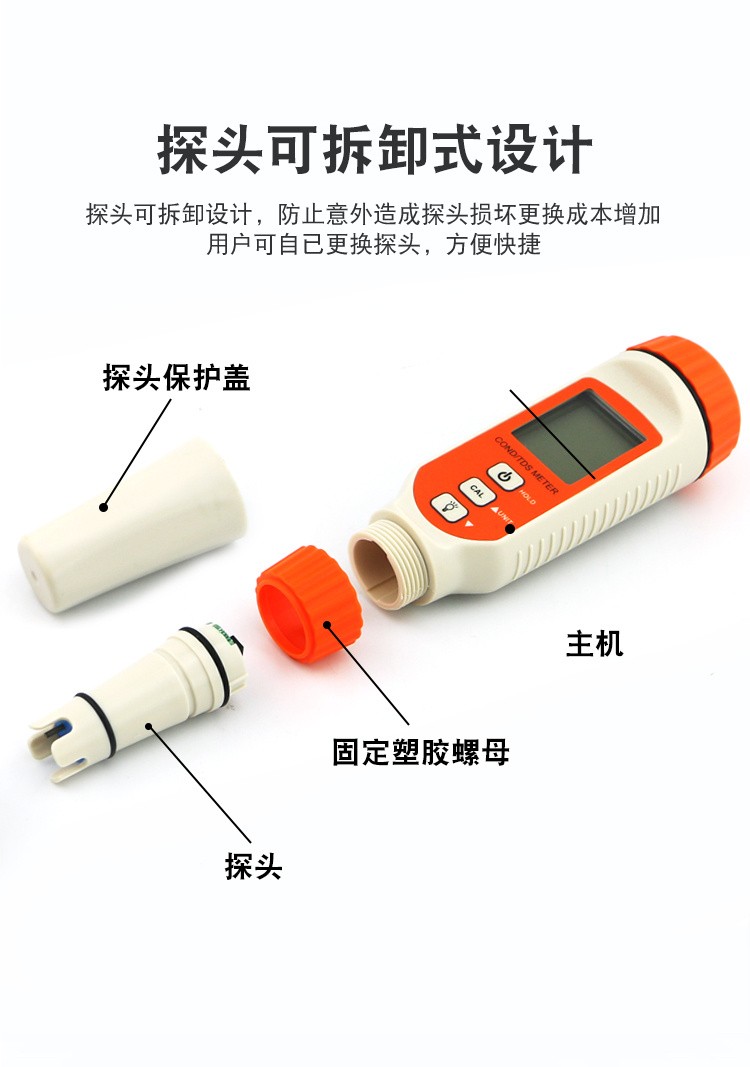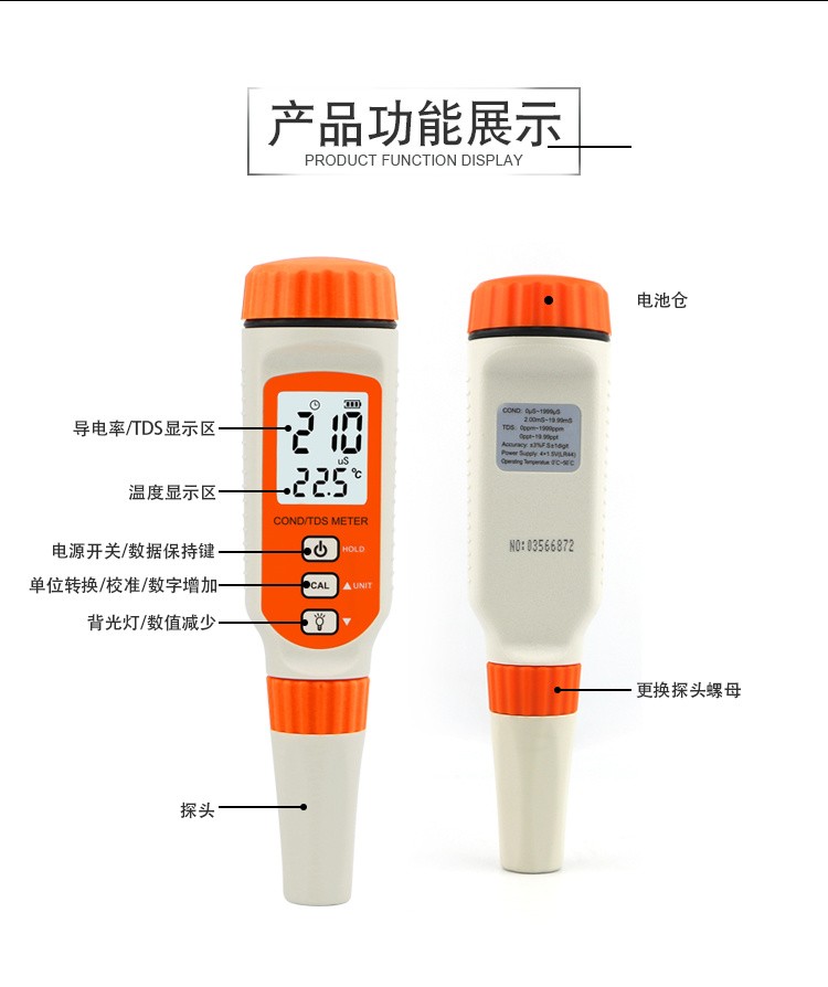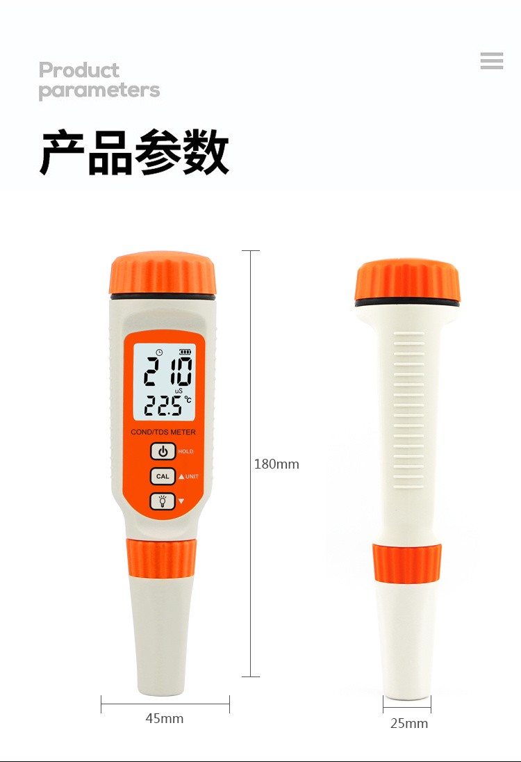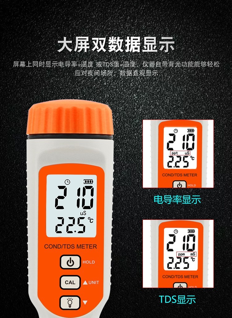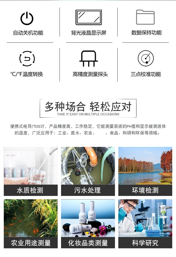 便携式笔试电导率/TDS计,产品精度高、工作稳定、可靠、便于携带。外形设计新颖美观,产品设计更具有专业性,它能测量溶液的PH值和显示被测液体的温度。笔试电导率/TDS计广泛应用工业、实验室、农业、养殖、科研和环保等领域。
