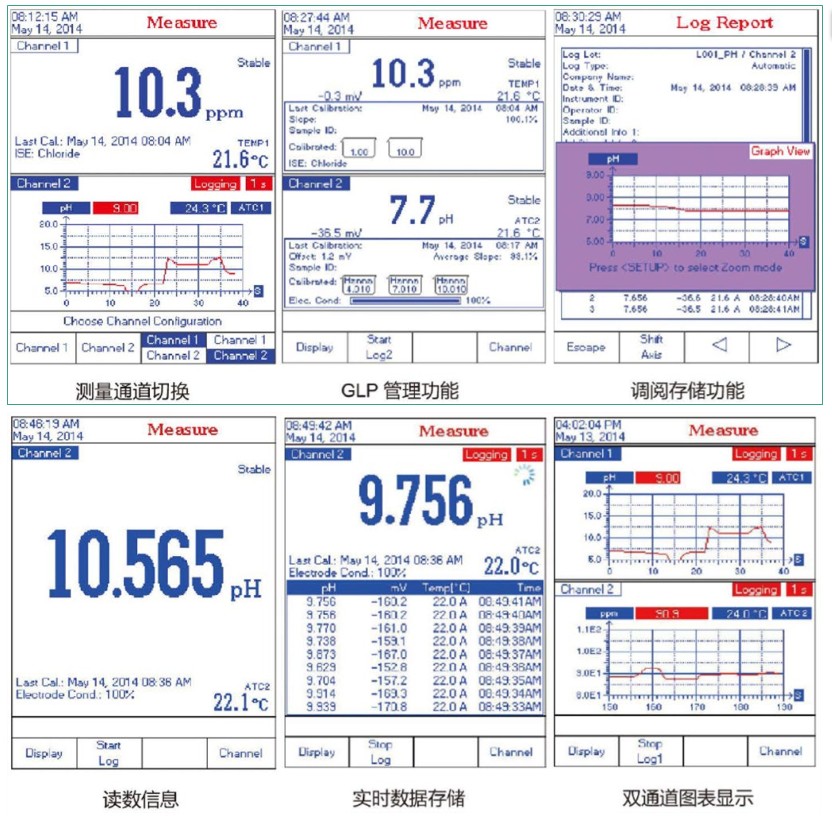 用户根据需要可自定义设置显示界面。可设定基本模式和GLP管理模式以及实时图表显示。可存储或查阅多达10种自定义档案,即用户自定义设定包括:模式、标准点、等电位点、ISE测量单位和ISE电极型号、温度单位、解析度等信息。用户更换测量项目,采用已设的自定义档案功能,可大大节省测量时间。